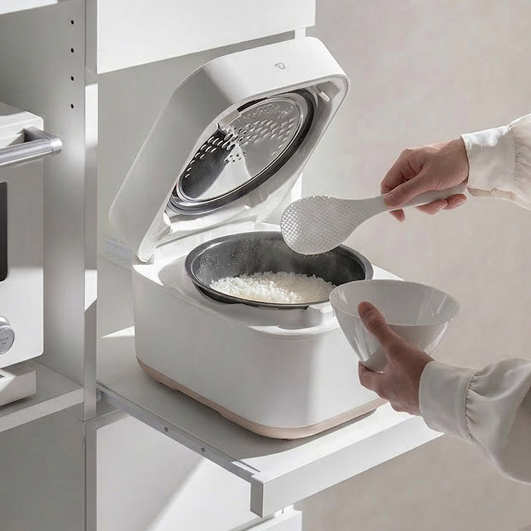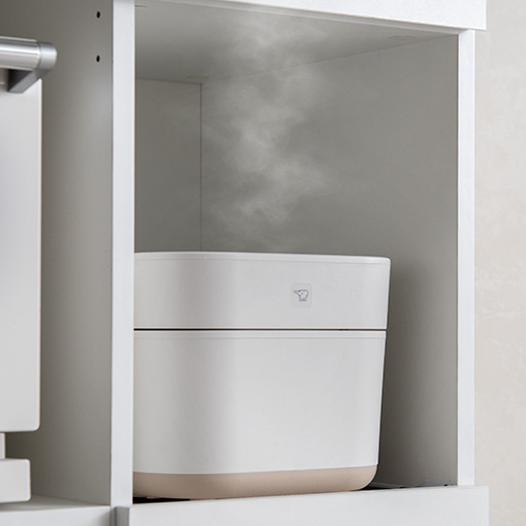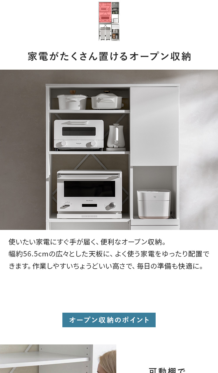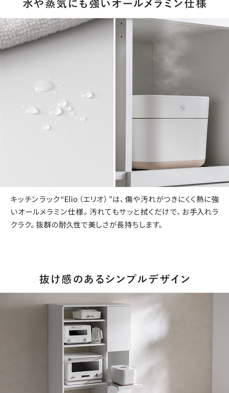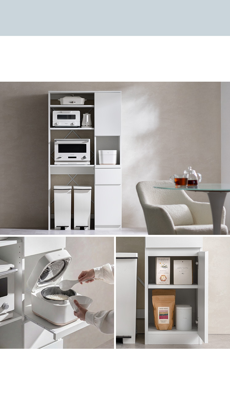 ゴミ箱収納キッチンボード Elio〔エリオ〕/キッチン家電・ゴミ箱・食器をまるっとまとめて収納できるキッチンラック。幅92.6cmのスリム設計ながら、家電をまとめて置ける収納スペースを確保。家電は使いやすい位置に設置でき、食器や雑貨は扉収納にすっきり隠して収納できます。
