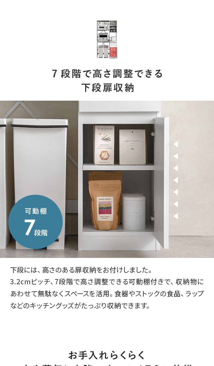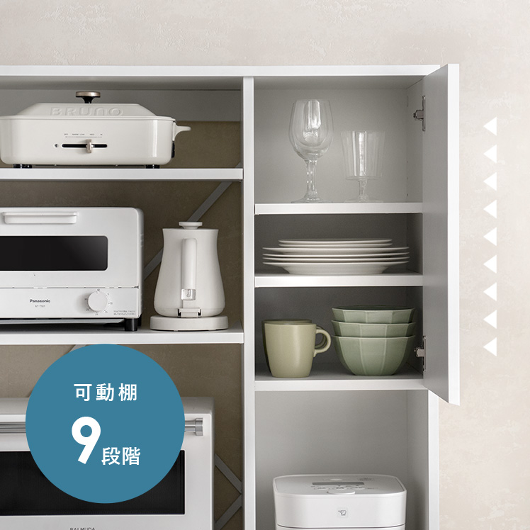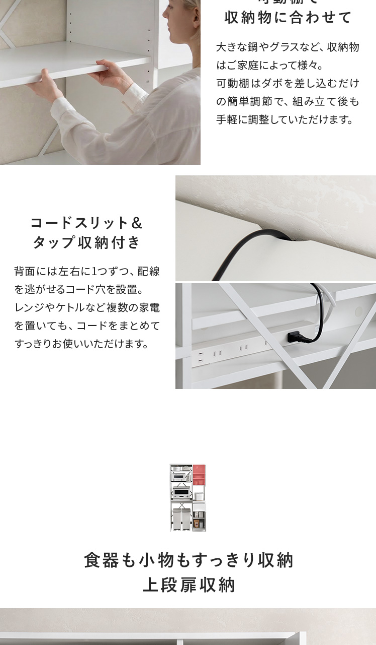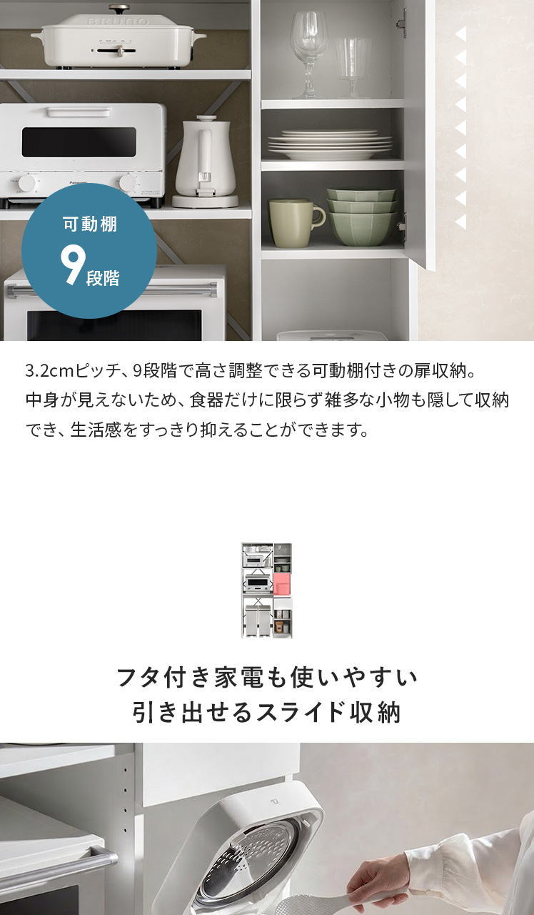 食器棚 カップボード キッチンボード ラック 収納 棚 可動棚 9段階 7段階 キッチンラック 作業台 扉収納 キッチンキャビネット キッチン収納 ダストワゴン 分別 ゴミ箱収納 レンジ棚 大容量 レンジ台 スライド収納 シンプル モダン スリム 省スペース 北欧 コード穴 ナチュラル メラミン ホワイト