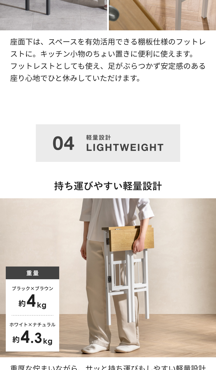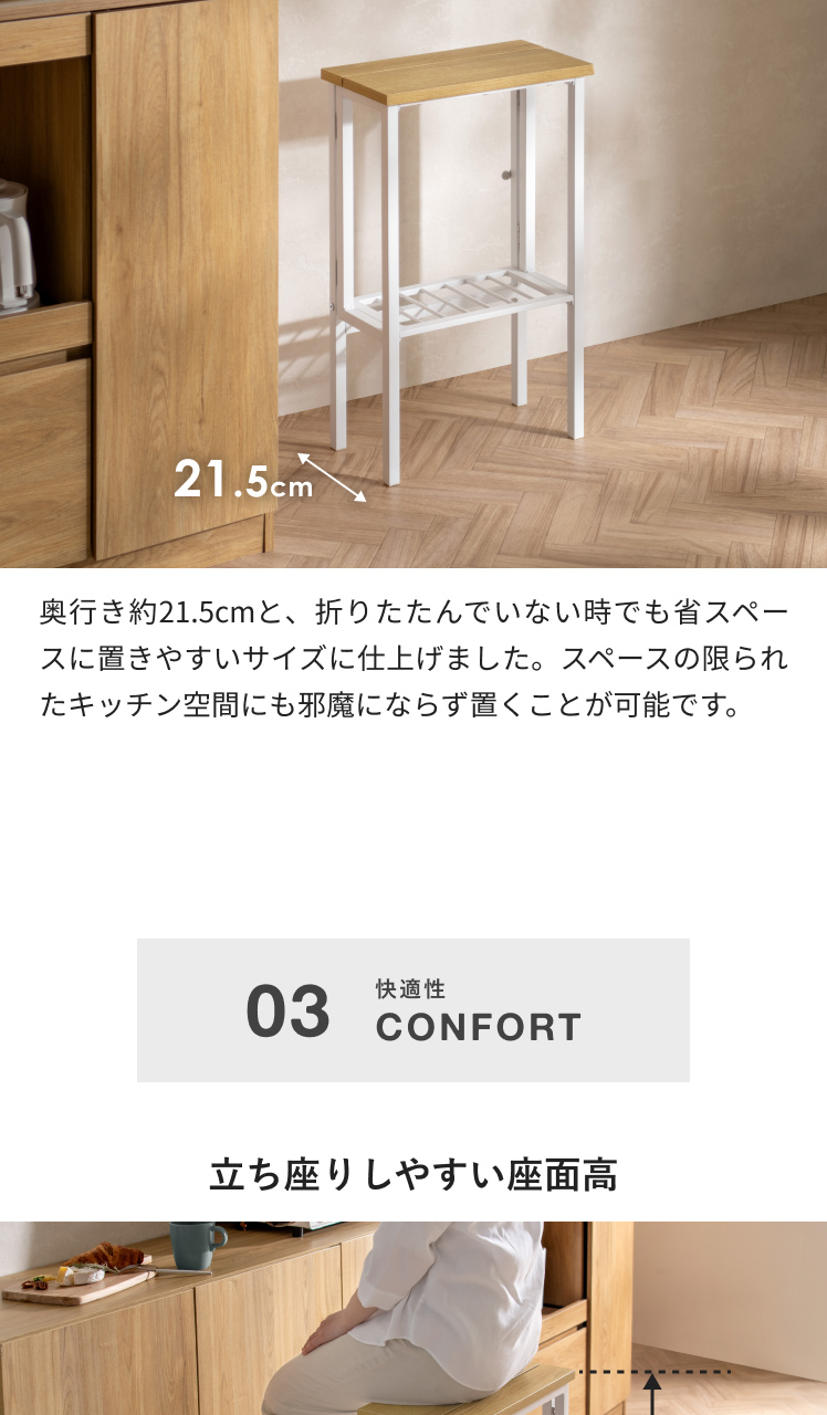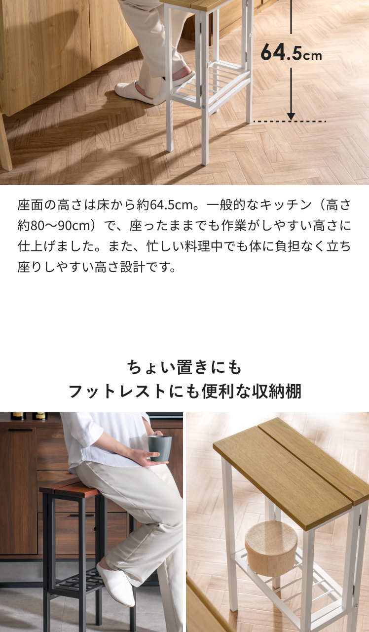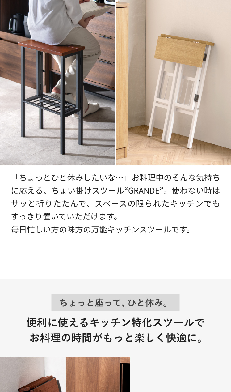 「ちょっとひと休みしたいな…」お料理中のそんな気持ちに応える、ちょい掛けスツール。毎日忙しい方の味方の万能キッチンスツールです。