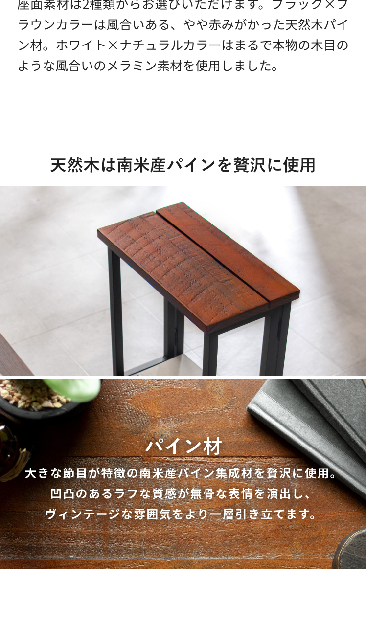 ブラック×ブラウンカラーは風合いある、やや赤みがかった天然木パイン材。