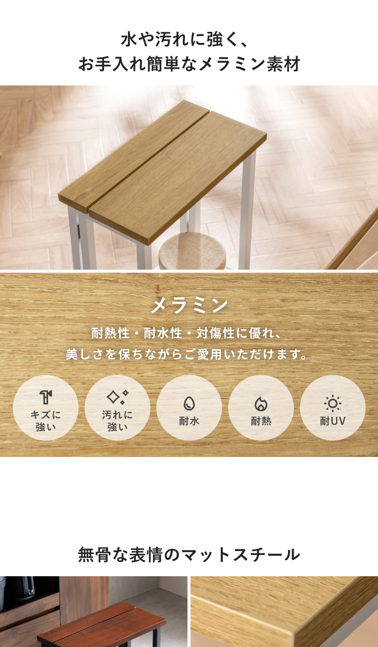 ホワイト×ナチュラルカラーはまるで本物の木目のような風合いのメラミン素材を使用しました。