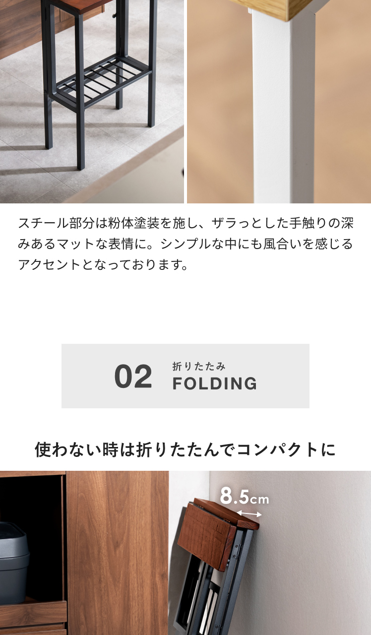 使わない時はサッと折りたたんで、スペースの限られたキッチンでもすっきり置いていただけます。