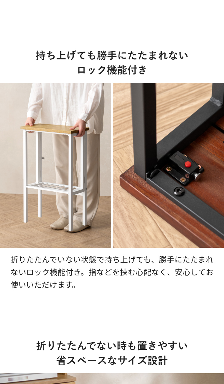 折りたたんでいない状態で持ち上げても、勝手にたたまれないロック機能付き。