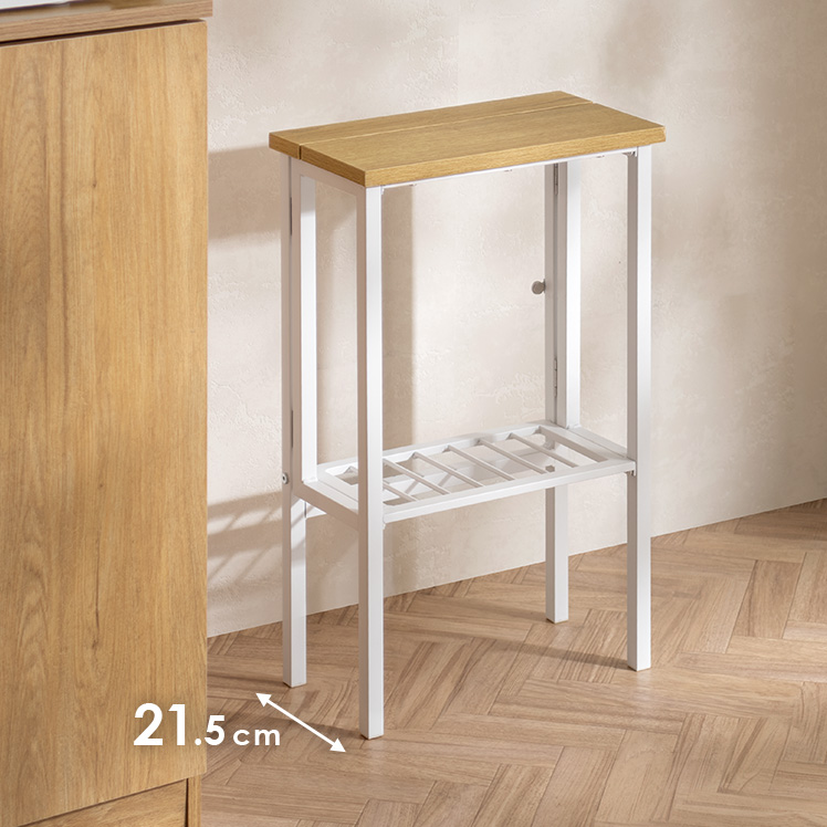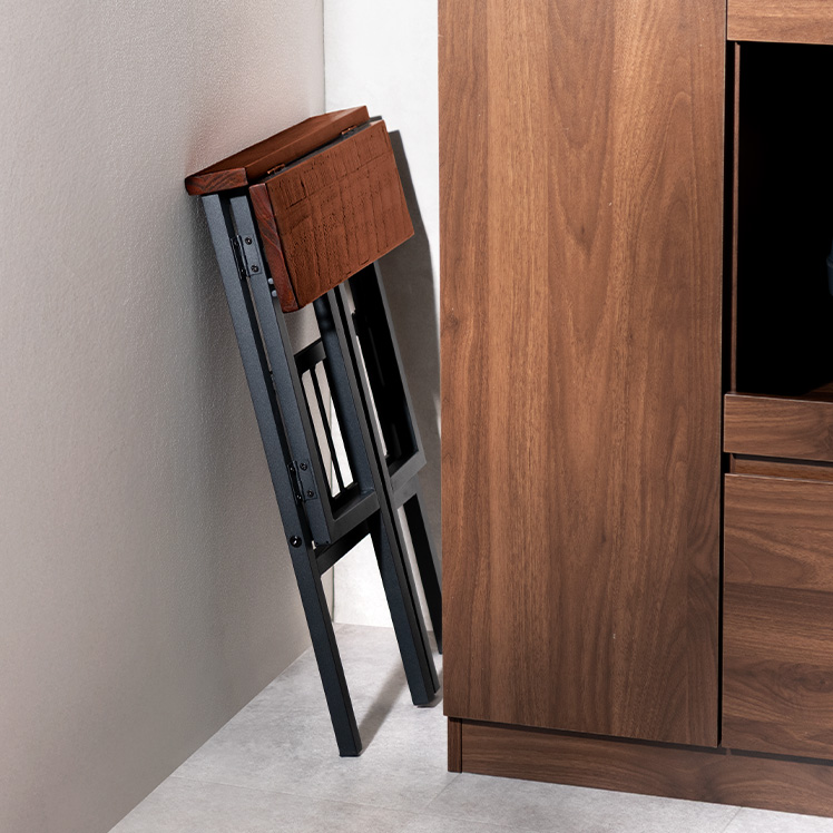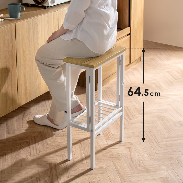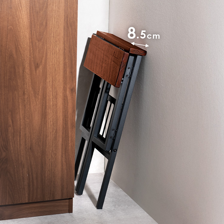 料理中や家事の合間に、サッと腰掛けられる折りたたみスツール。ウッド×スチールのシンプルデザインで空間に馴染み、使わない時はコンパクトに収納できます。