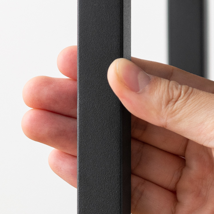 スチール部分は粉体塗装を施し、ザラっとした手触りの深みあるマットな表情に。