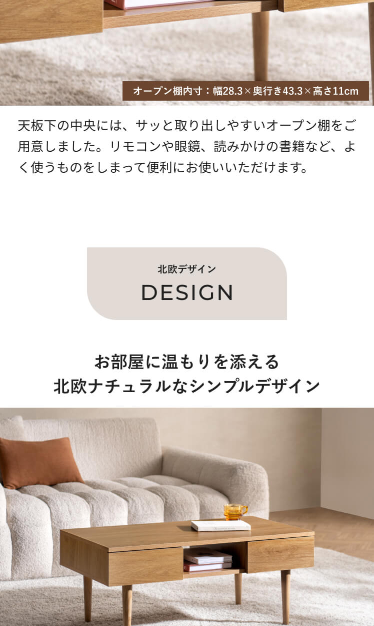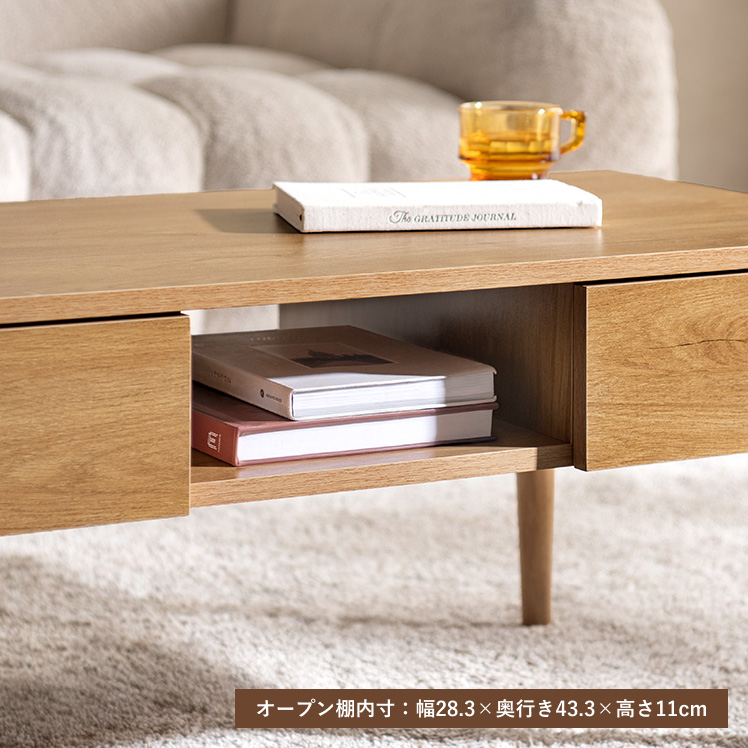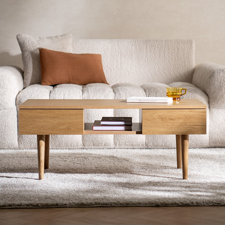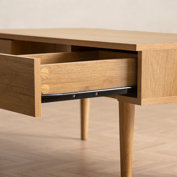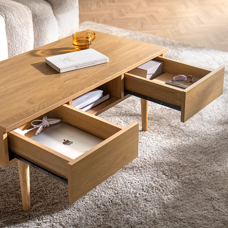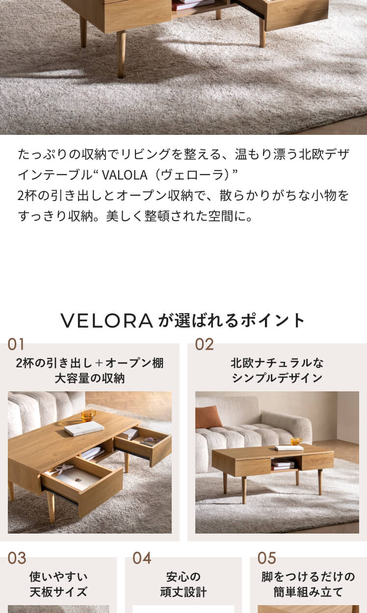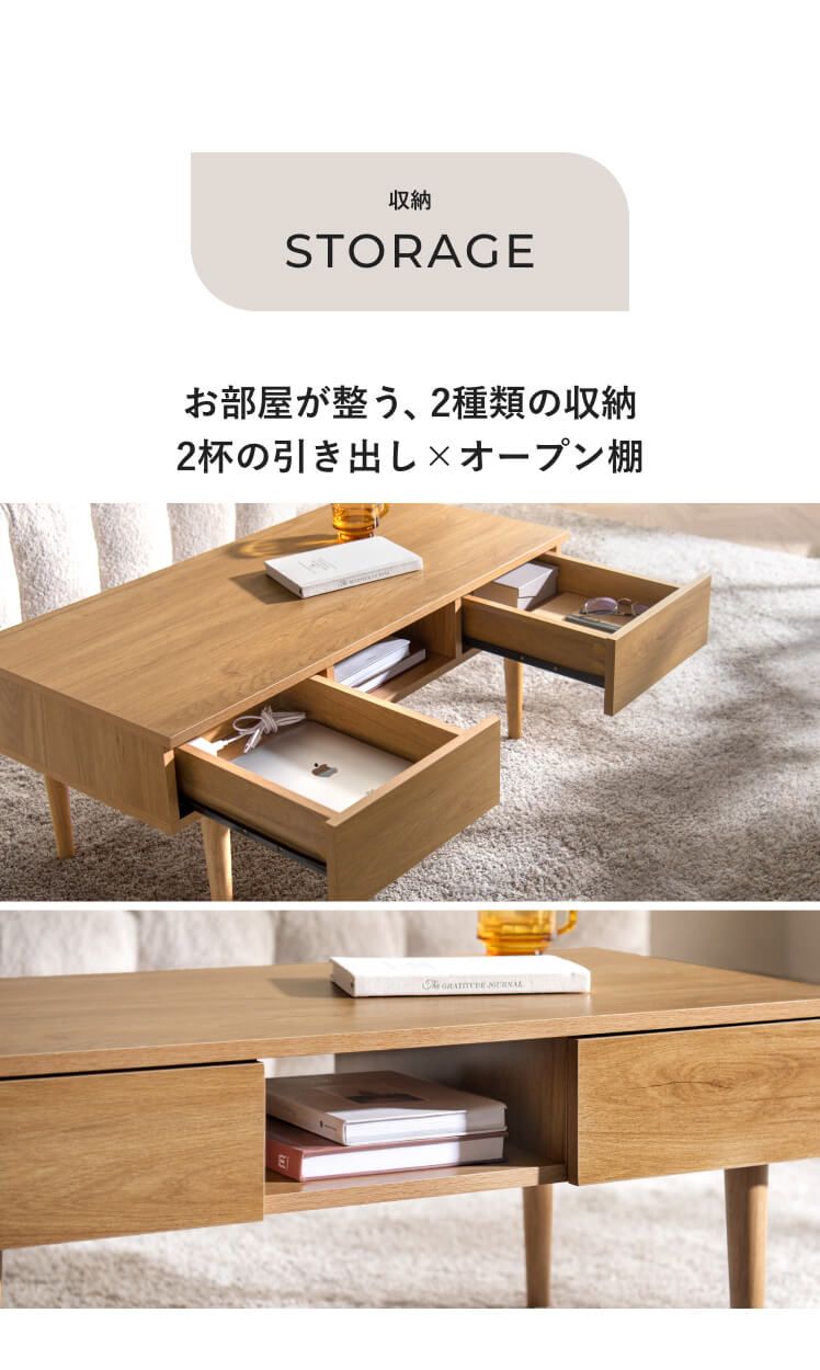 引き出し付きセンターテーブル Velora〔ヴェローラ〕/たっぷりの収納でリビングを整える、温もり漂う北欧デザインテーブル。2杯の引き出しとオープン収納で、散らかりがちな小物をすっきり収納。美しく整頓された空間に。