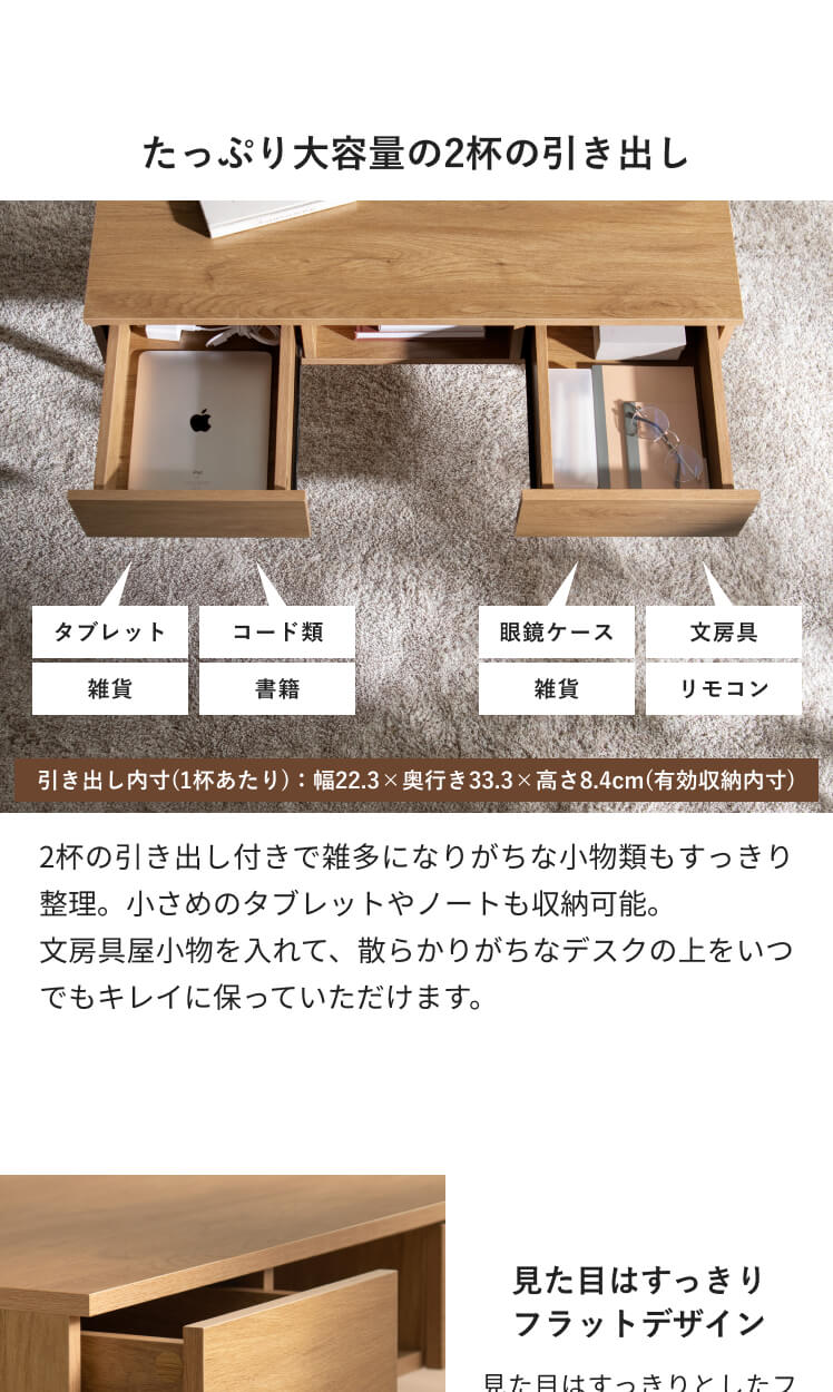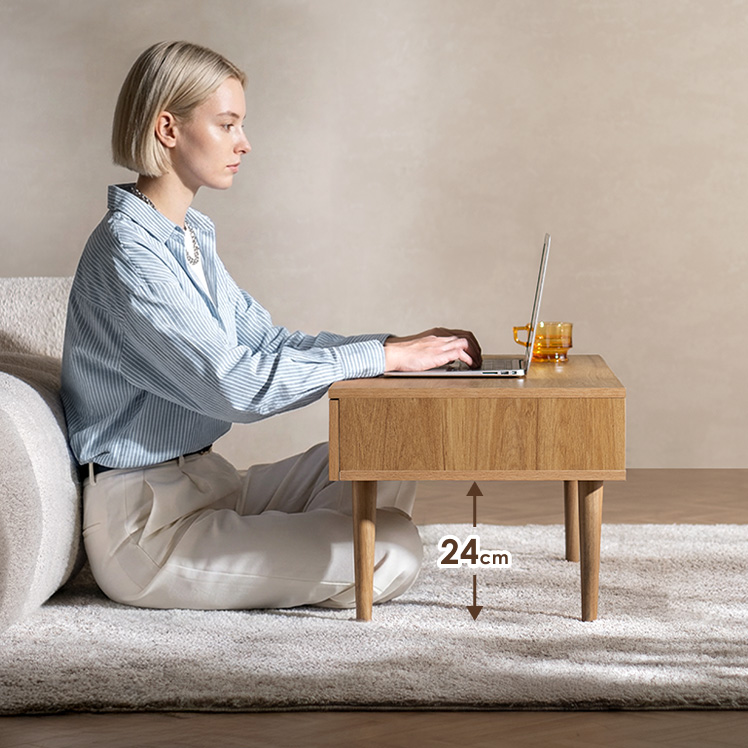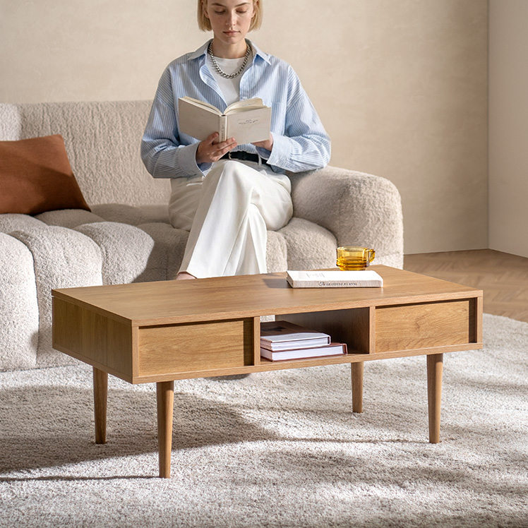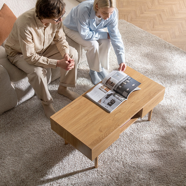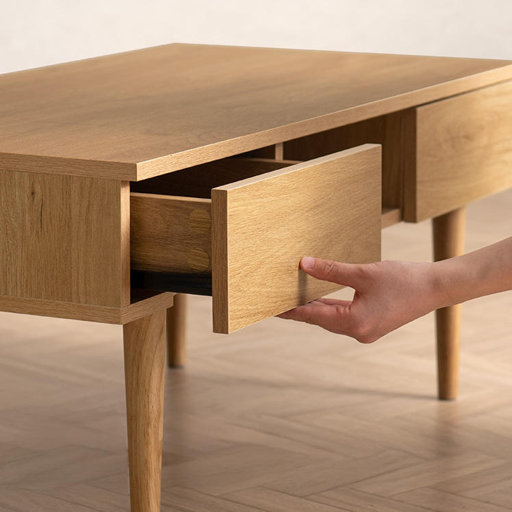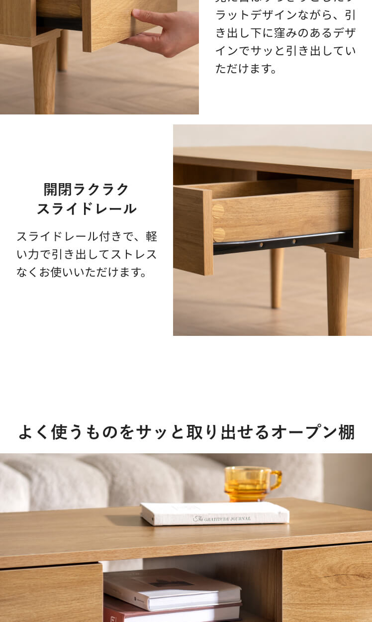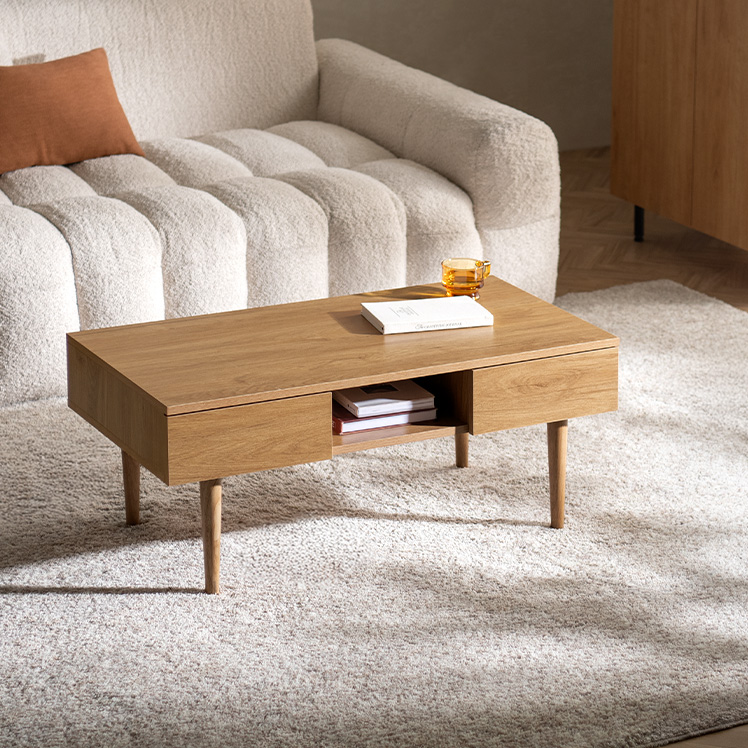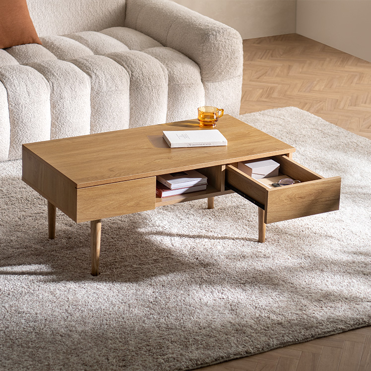 引き出し付きセンターテーブル Velora〔ヴェローラ〕/たっぷりの収納でリビングを整える、温もり漂う北欧デザインテーブル。2杯の引き出しとオープン収納で、散らかりがちな小物をすっきり収納。美しく整頓された空間に。