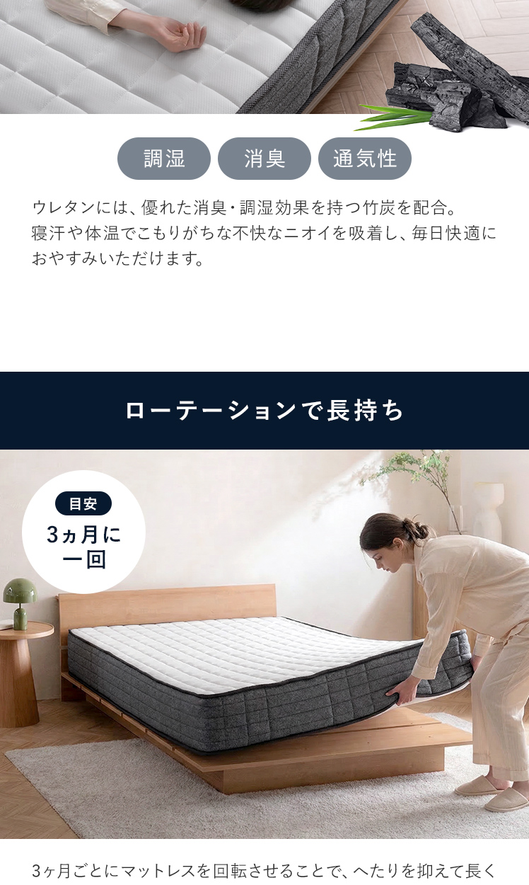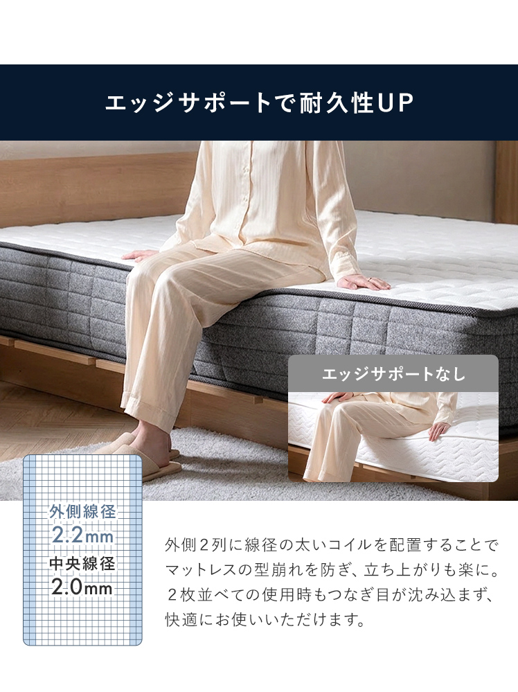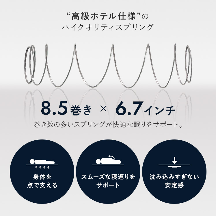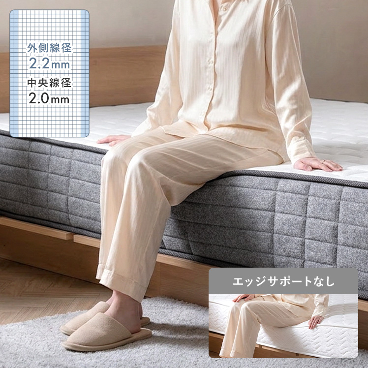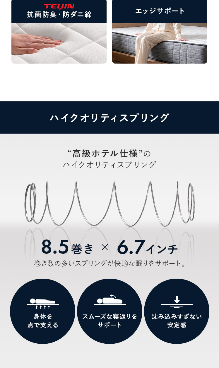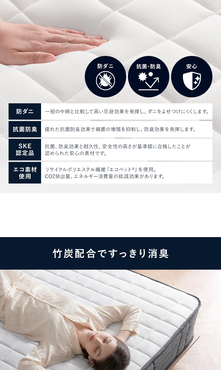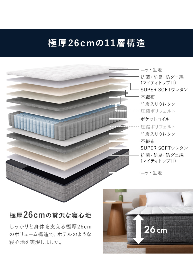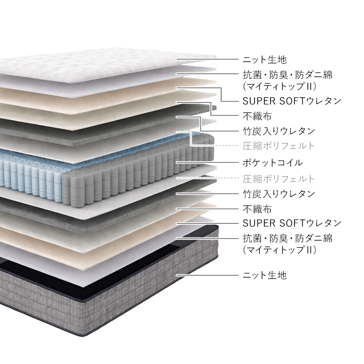 | 材質 | ニット生地、ポケットコイル、竹炭入りウレタン、SUPER SOFTウレタン、MIGHTY TOP抗菌防臭防ダニ混合綿、不織布 |