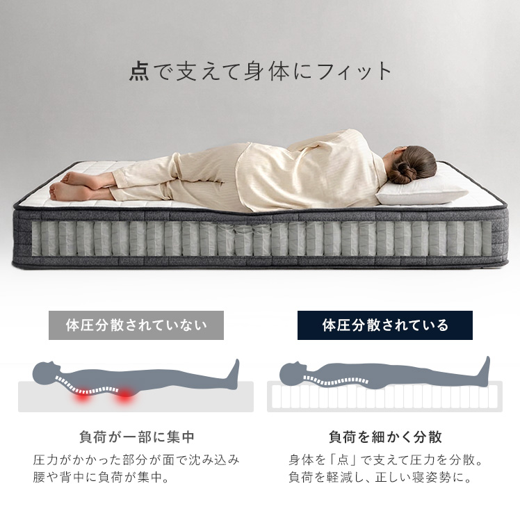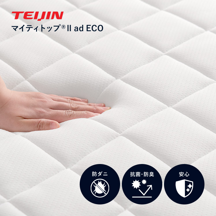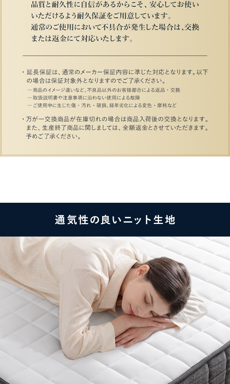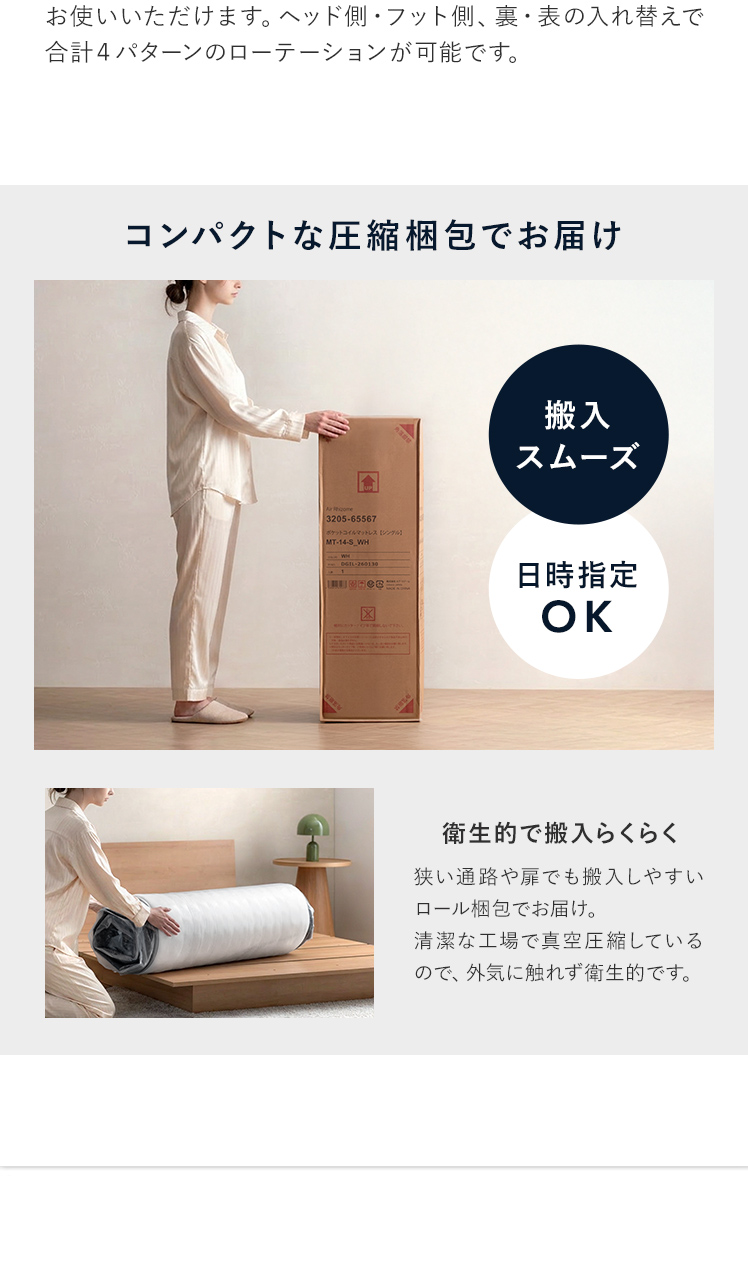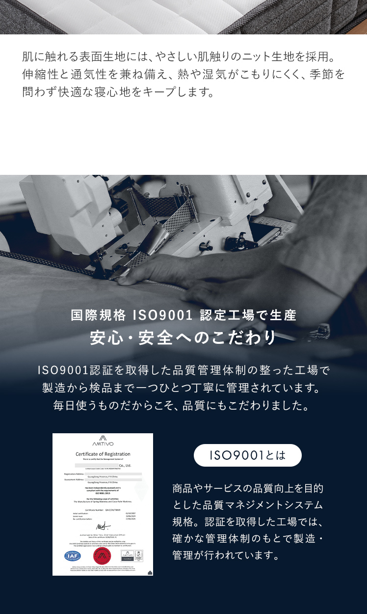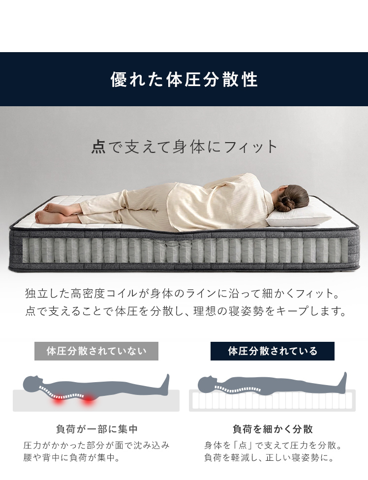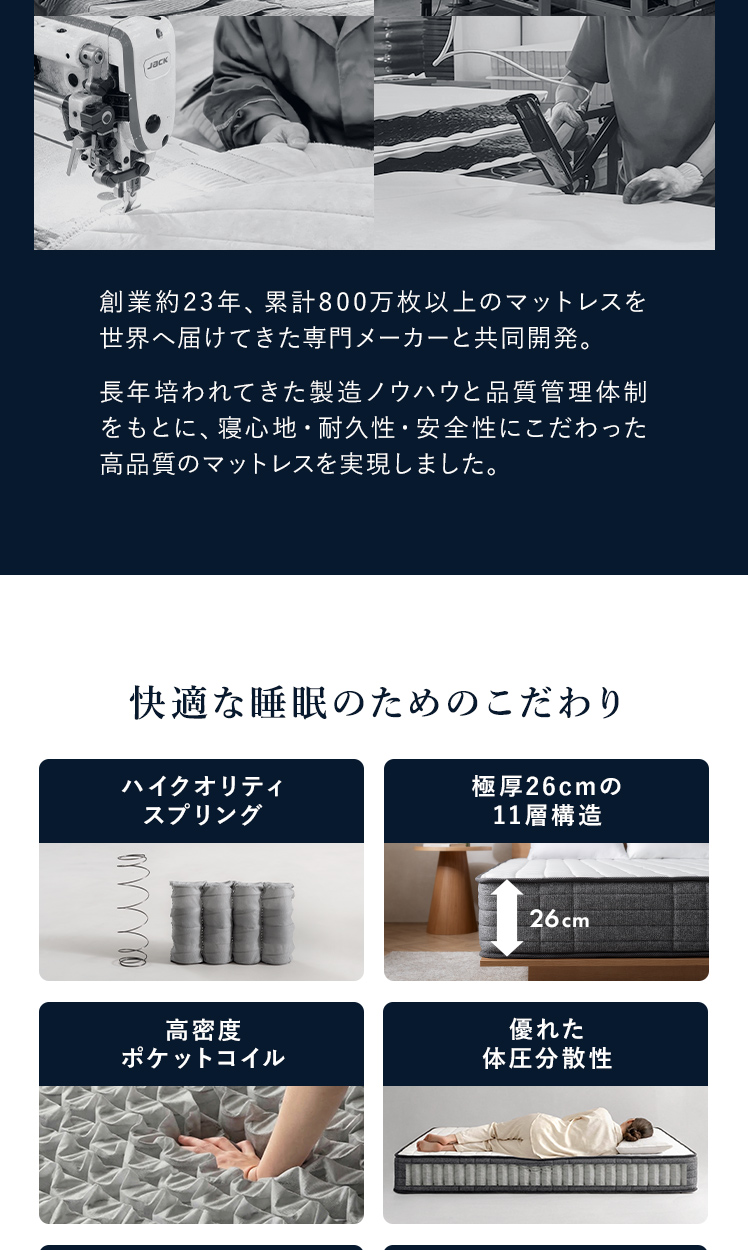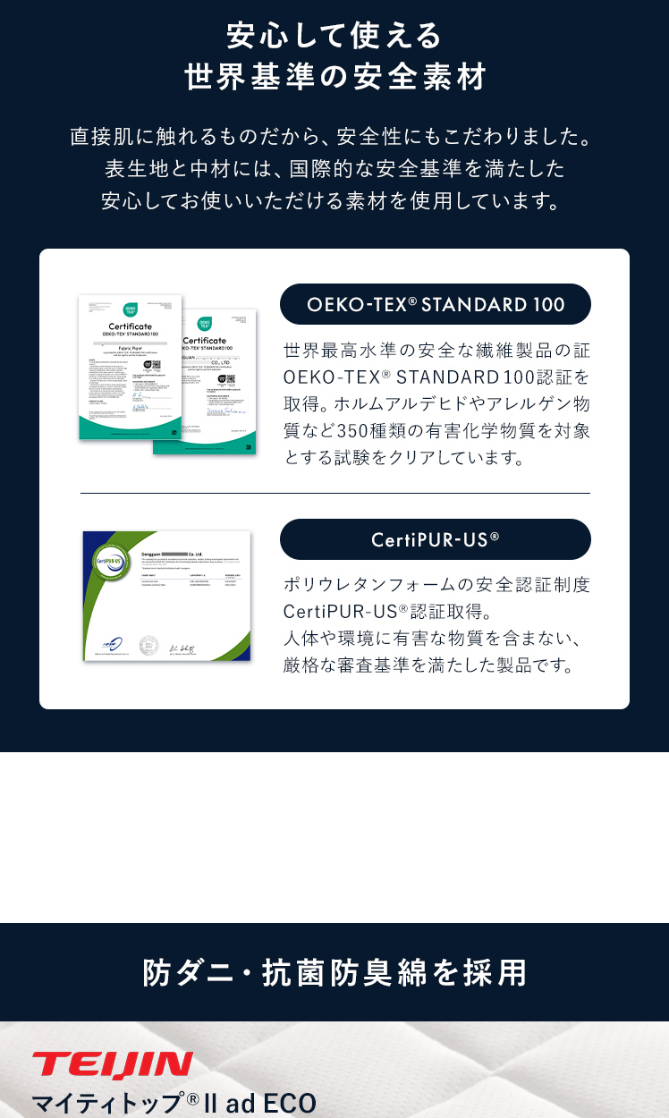 | 材質 | ニット生地、ポケットコイル、竹炭入りウレタン、SUPER SOFTウレタン、MIGHTY TOP抗菌防臭防ダニ混合綿、不織布 |