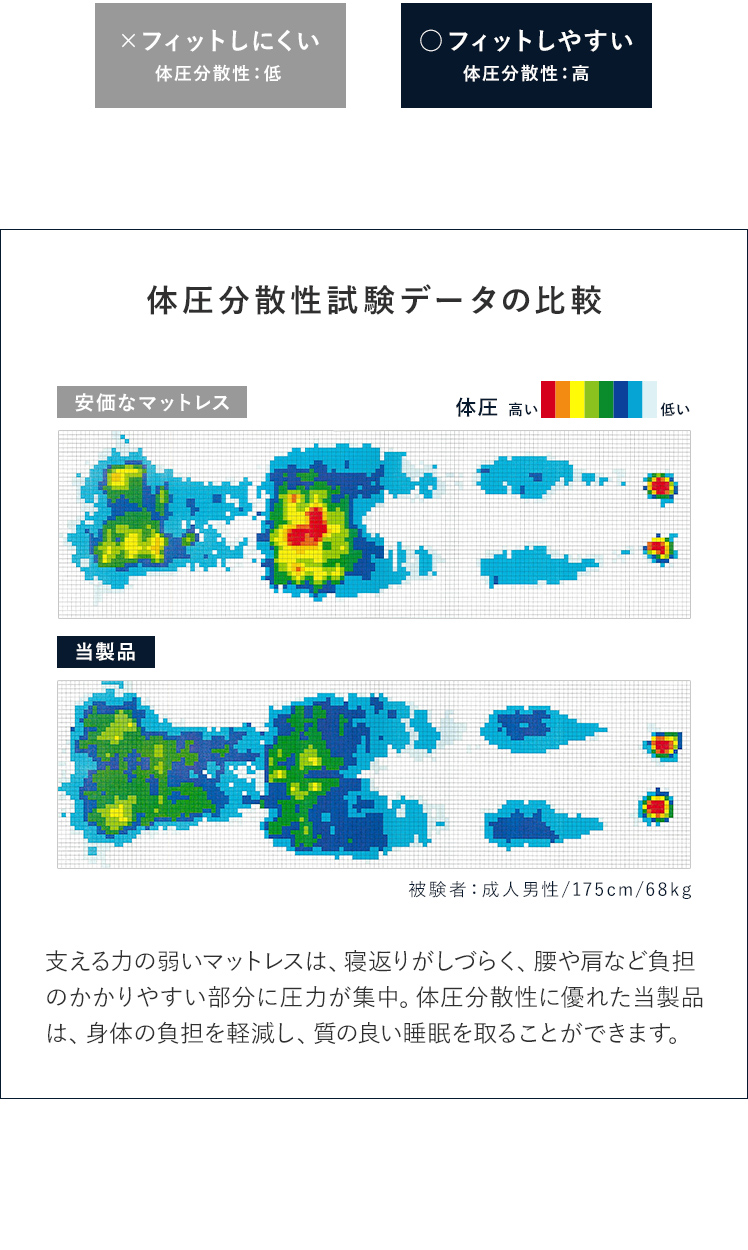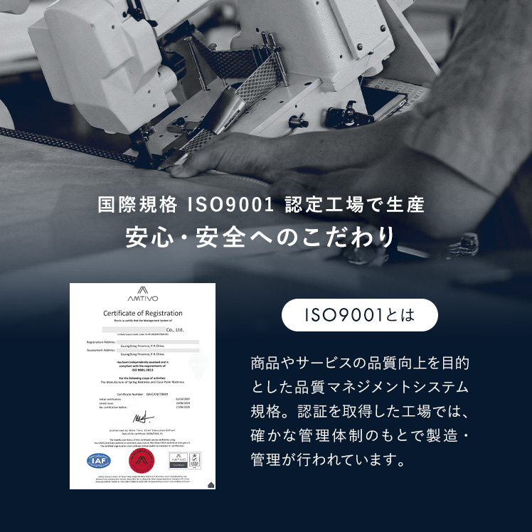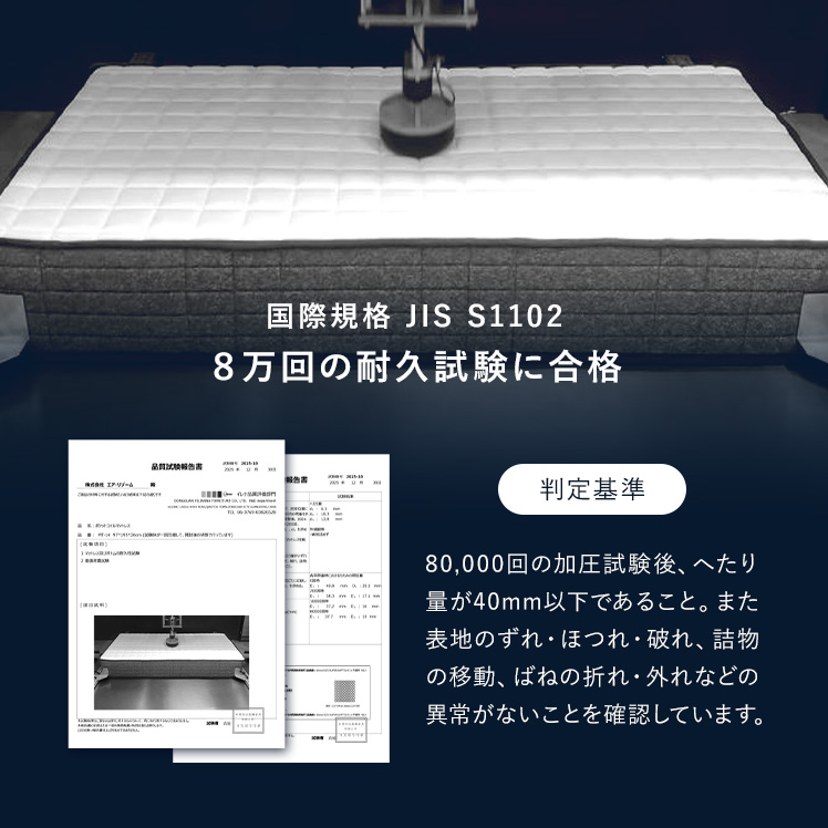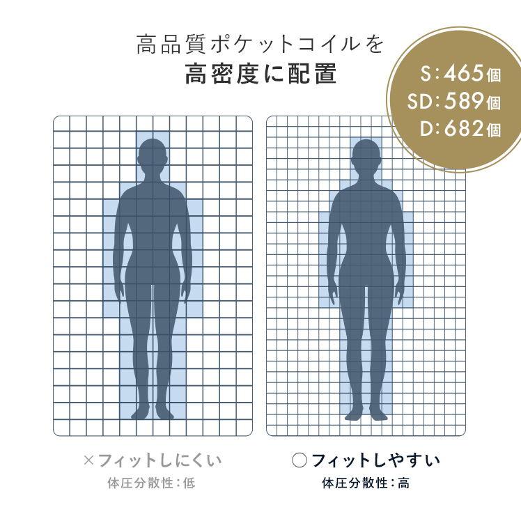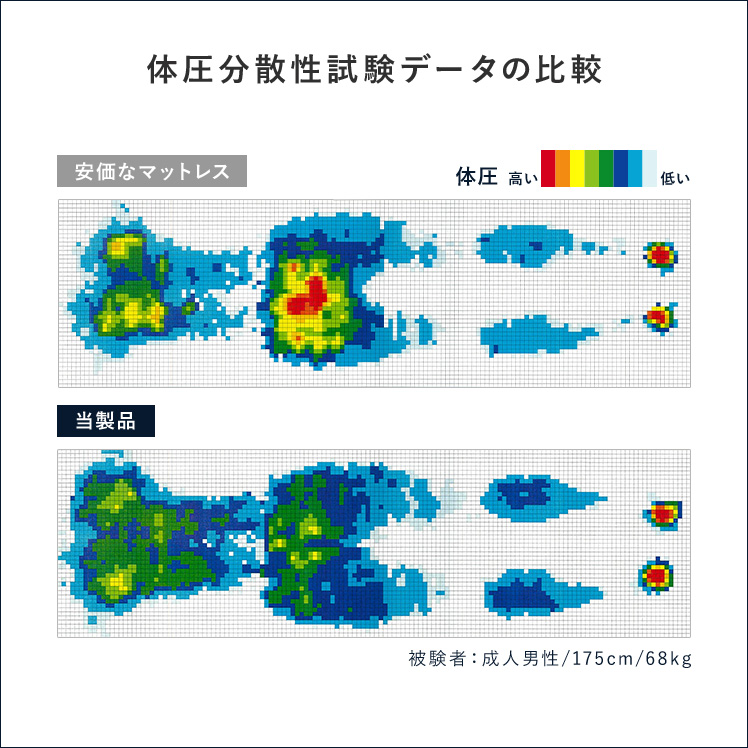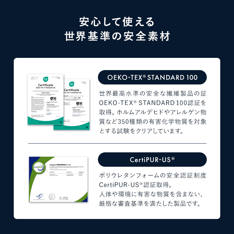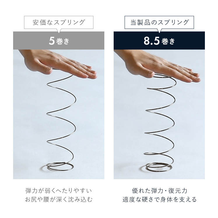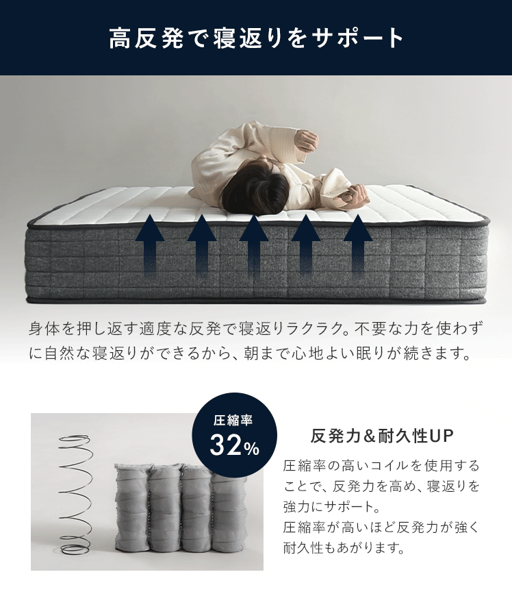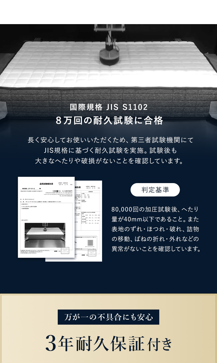 | 材質 | ニット生地、ポケットコイル、竹炭入りウレタン、SUPER SOFTウレタン、MIGHTY TOP抗菌防臭防ダニ混合綿、不織布 |
