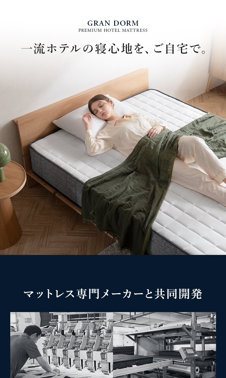 プレミアムホテルマットレス GRANDORM〔グランドーム〕 シングル/創業約23年、累計800万枚以上のマットレスを世界へ届けてきた専門メーカーと共同開発。長年培われてきた製造ノウハウと品質管理体制をもとに、寝心地・耐久性・安全性にこだわった高品質のマットレスを実現しました。