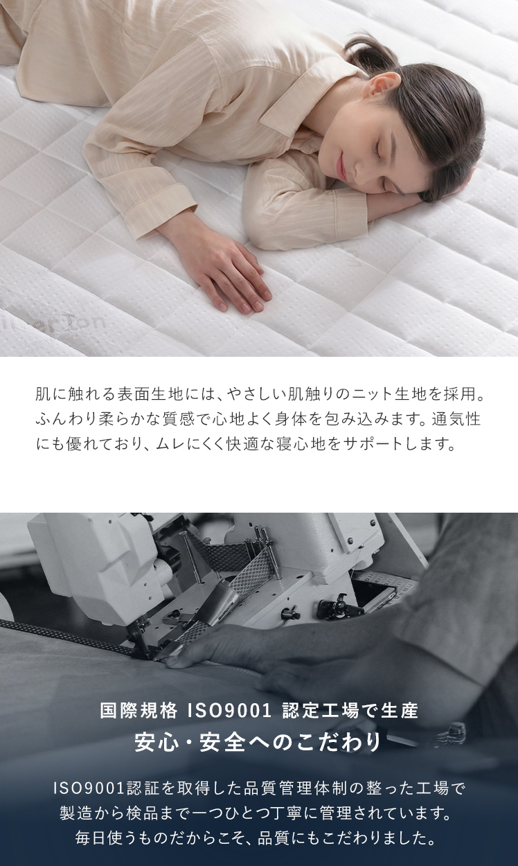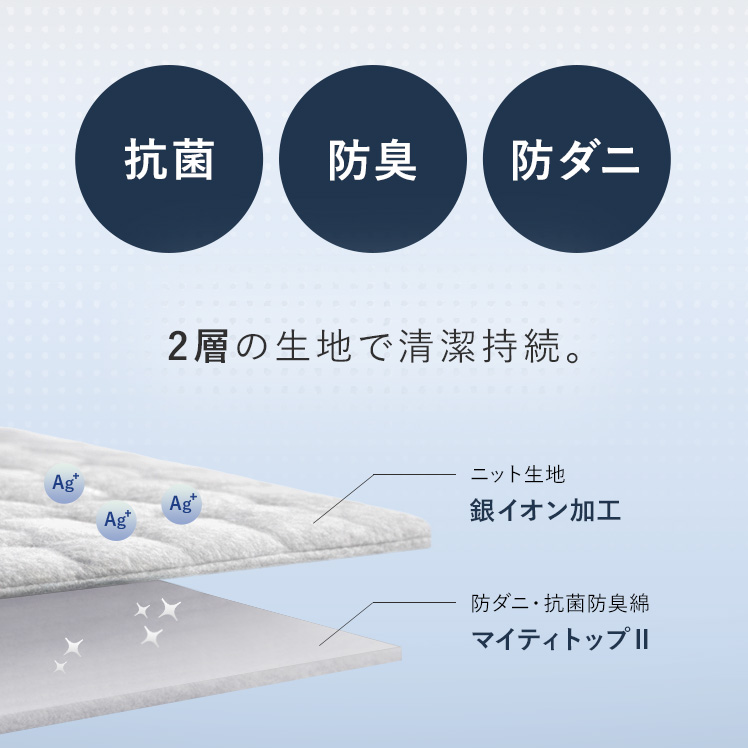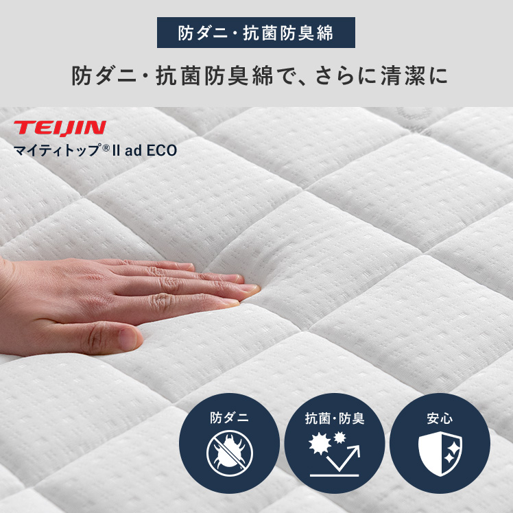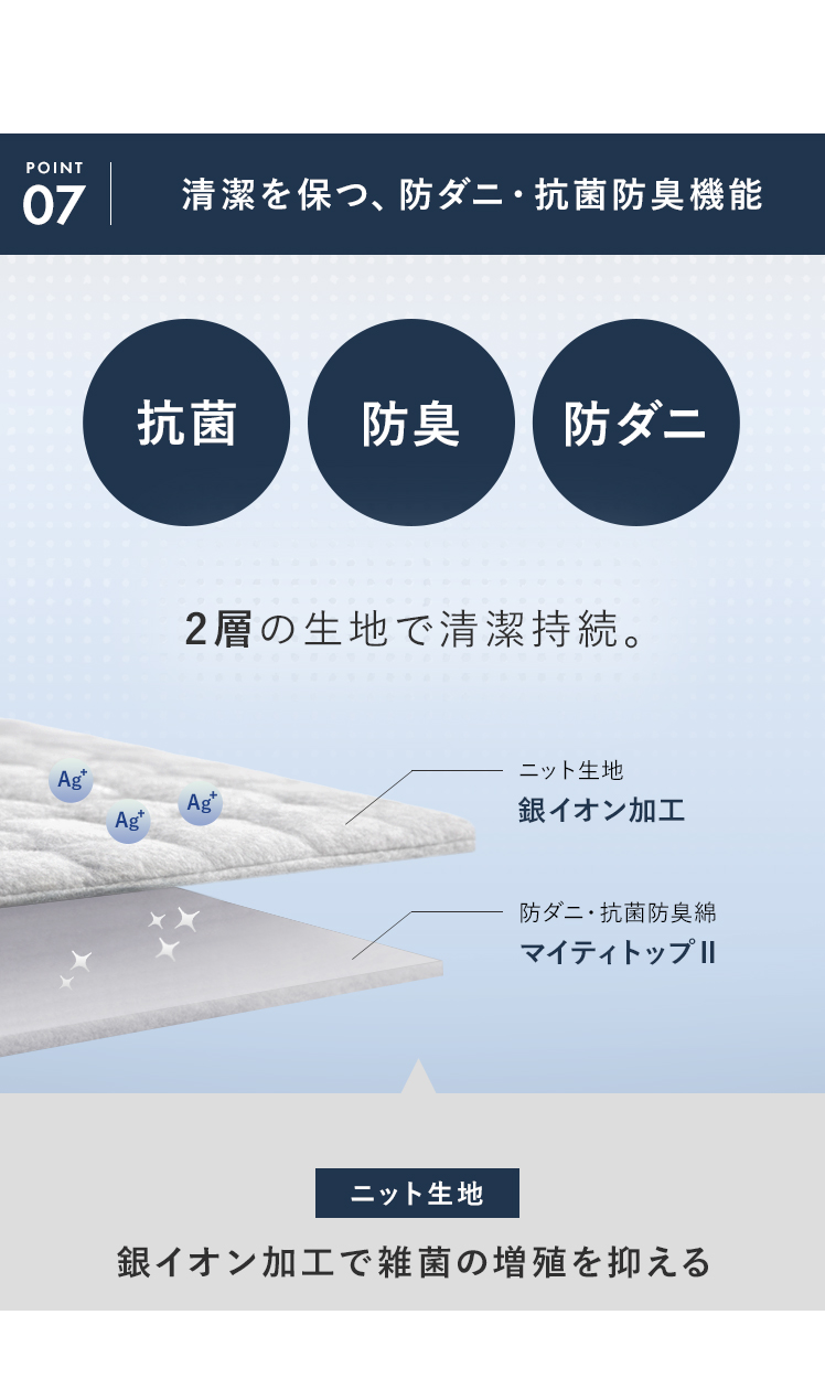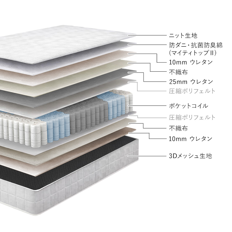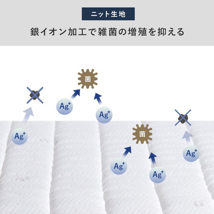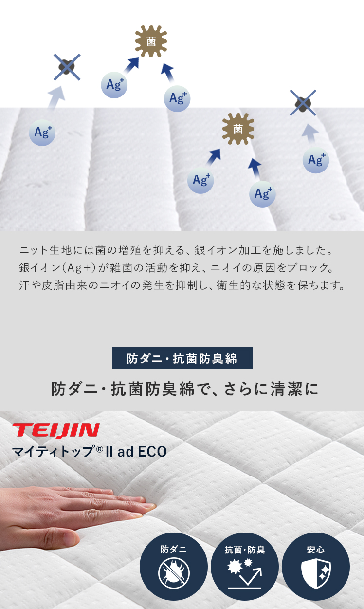 | 材質 | ニット生地(銀イオン加工)、ポケットコイル、ウレタン、MIGHTY TOP抗菌防臭防ダニ混合綿、不織布、メッシュ生地 |