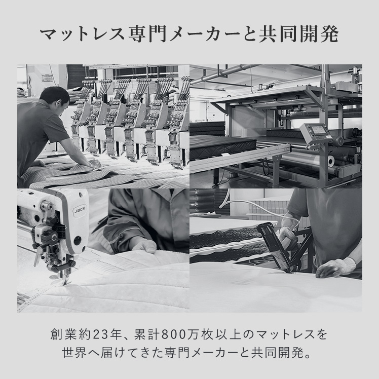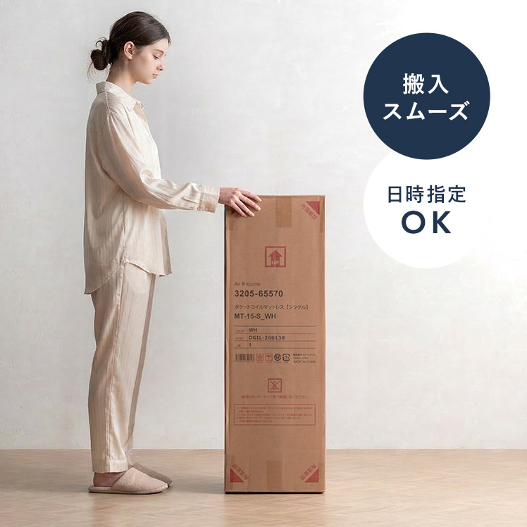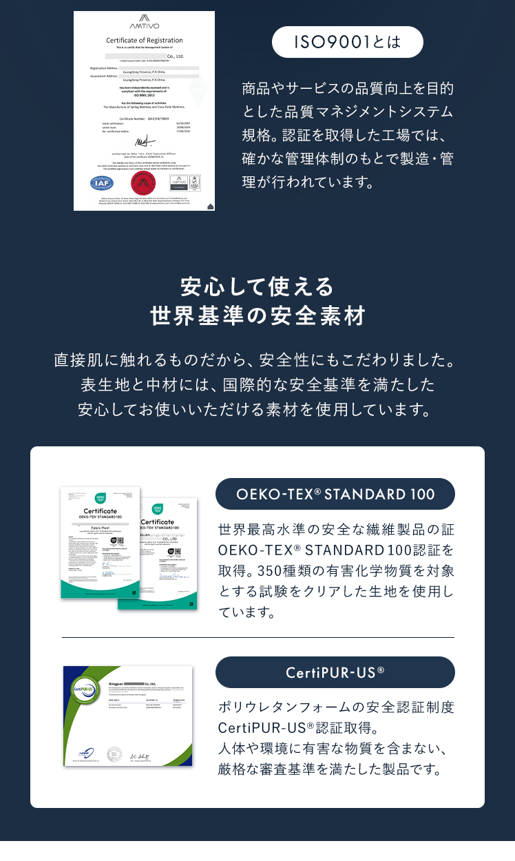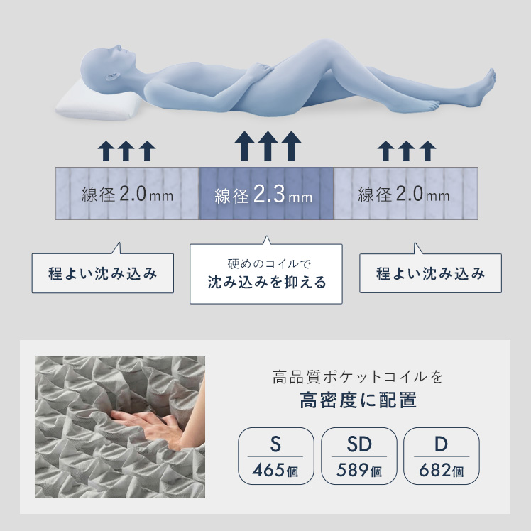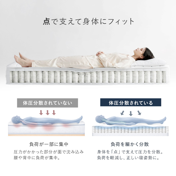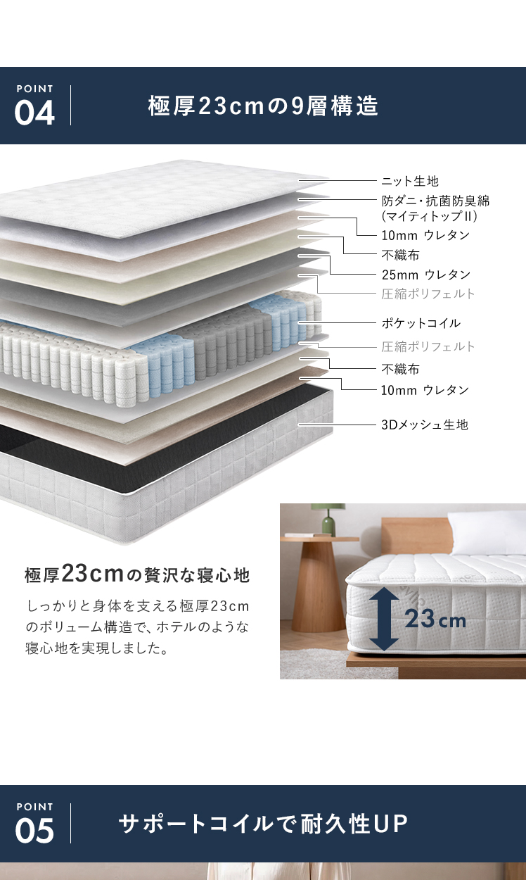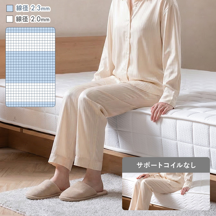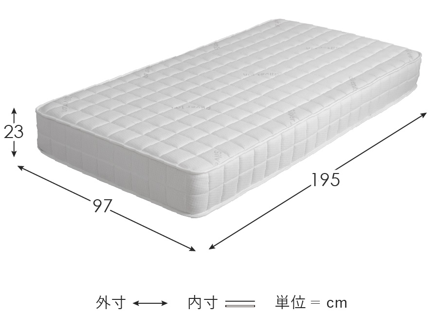 | 材質 | ニット生地(銀イオン加工)、ポケットコイル、ウレタン、MIGHTY TOP抗菌防臭防ダニ混合綿、不織布、メッシュ生地 |