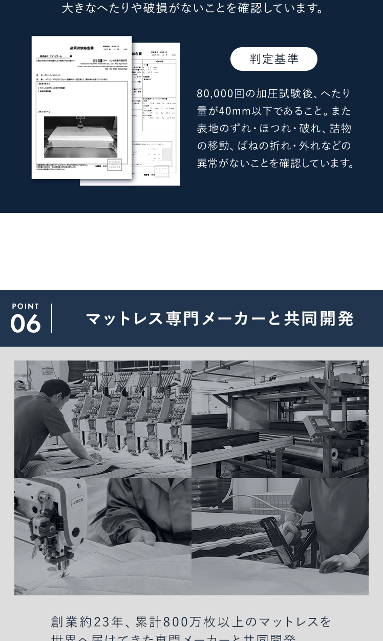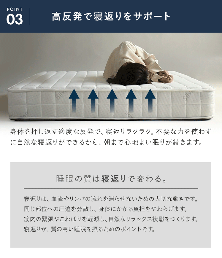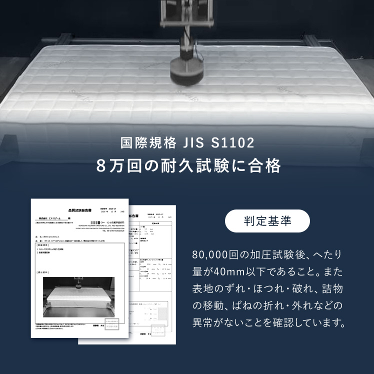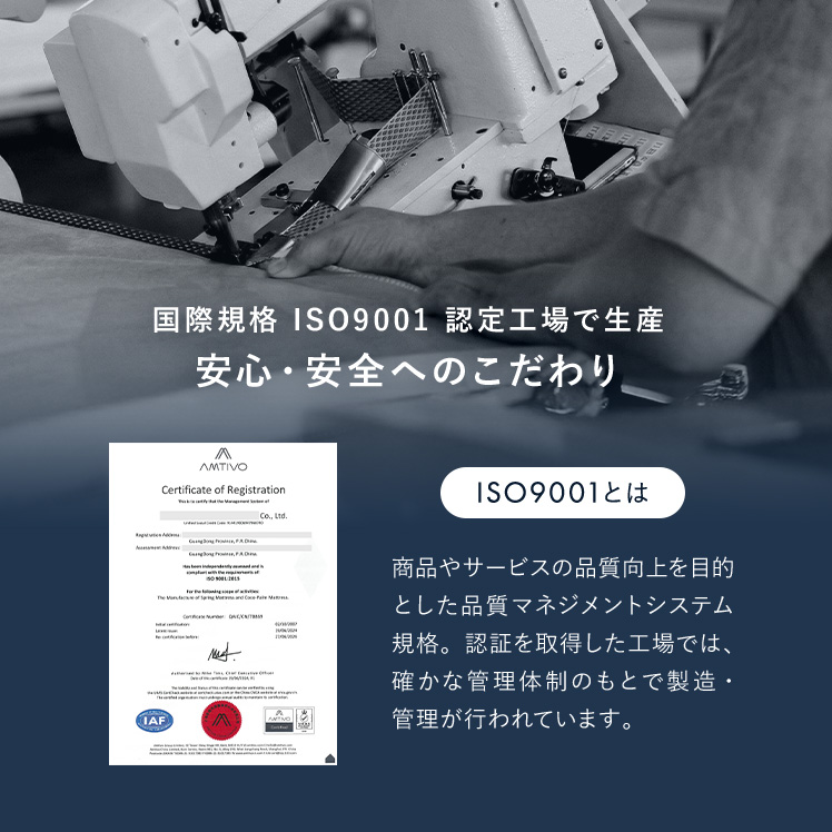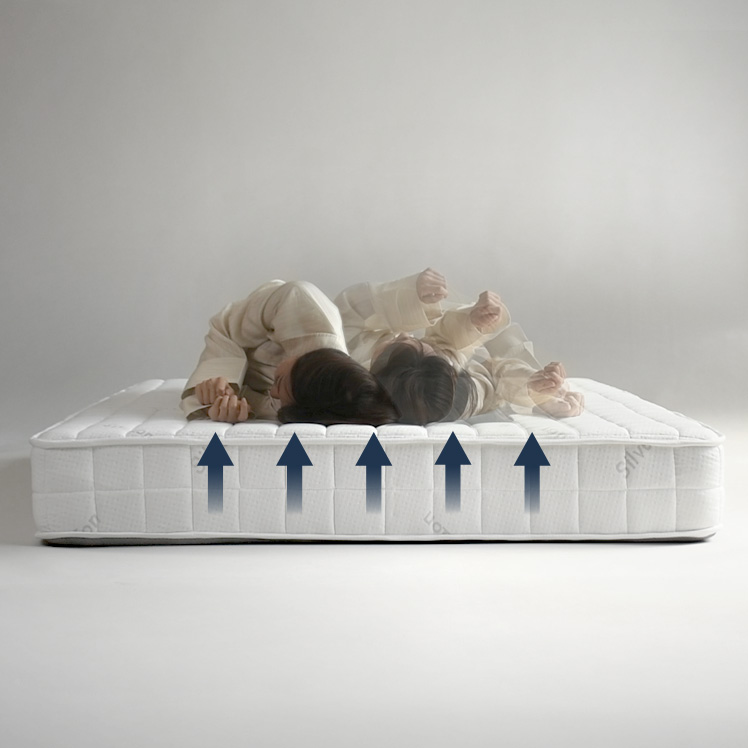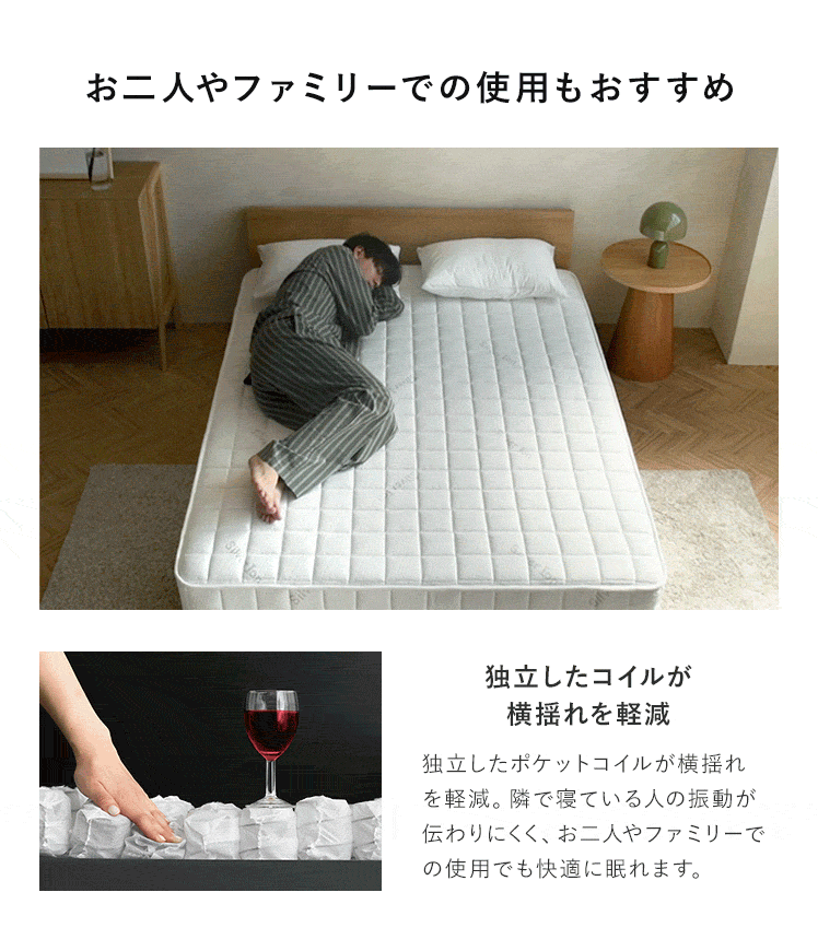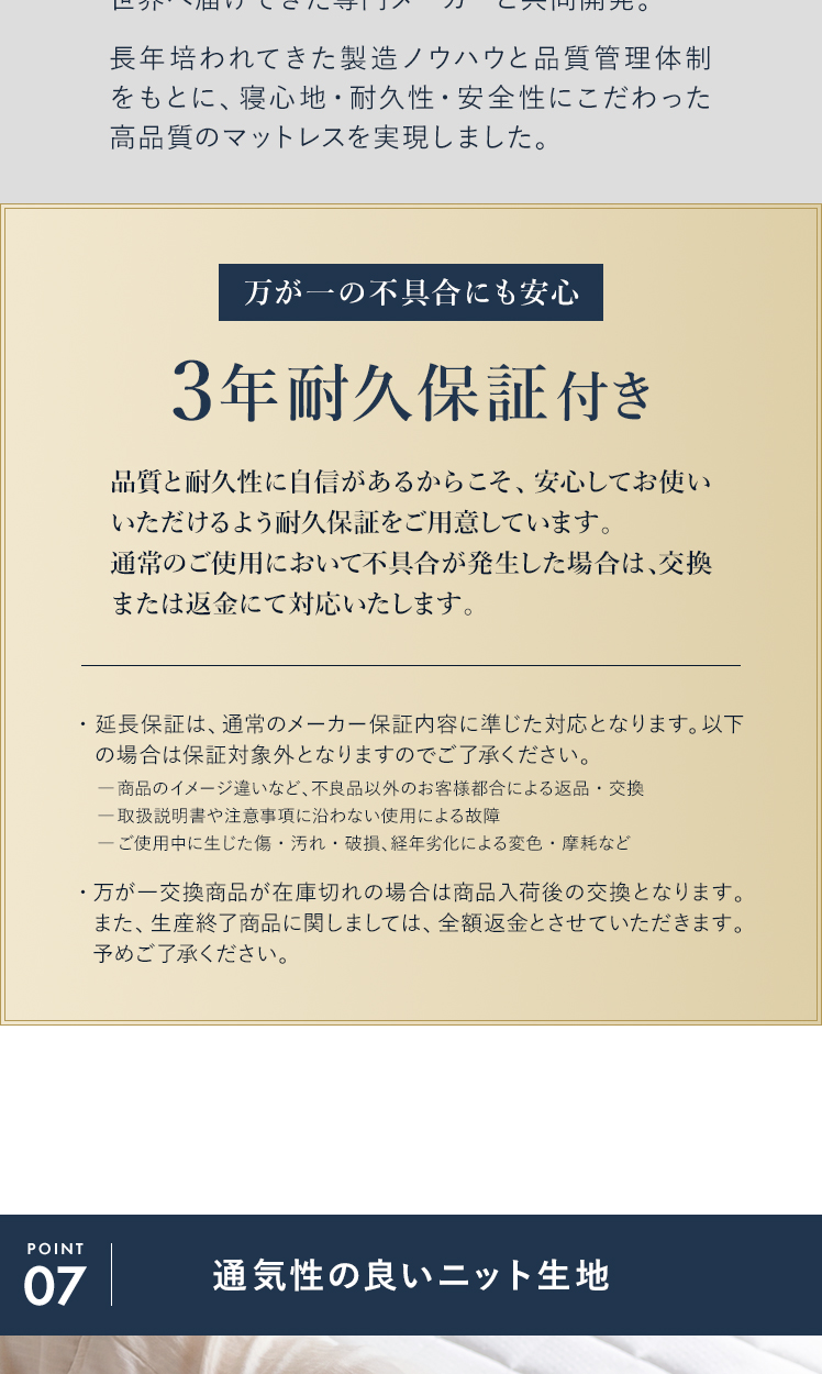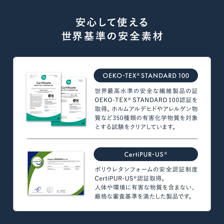| 材質 | ニット生地(銀イオン加工)、ポケットコイル、ウレタン、MIGHTY TOP抗菌防臭防ダニ混合綿、不織布、メッシュ生地 |