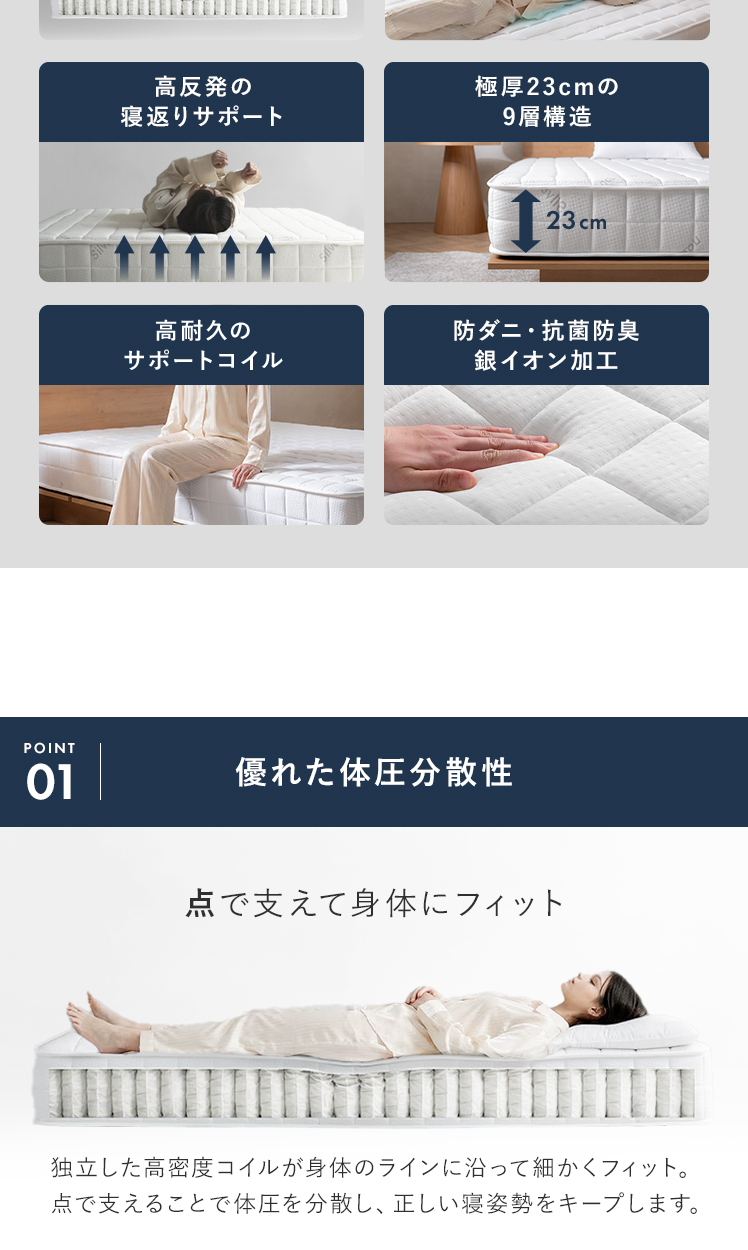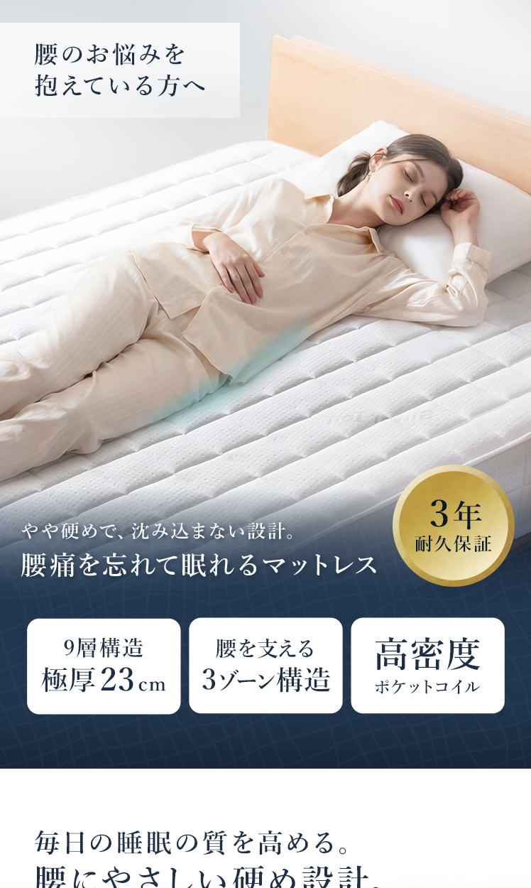 マットレス シングル S 高密度ポケットコイル 腰痛 高反発 硬め 3年保証 ニット生地 高品質 極厚 23cm 寝返り ホテル 通気性 抗菌 防ダニ 防臭 銀イオン ふかふか 熟睡 ホワイト 快眠 安眠 コンパクト配送 圧縮梱包 シンプル モダン 北欧 ナチュラル