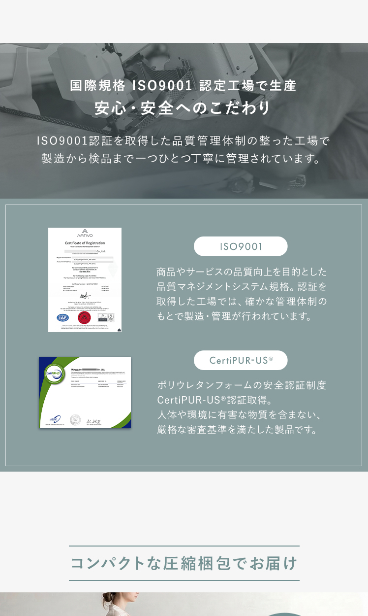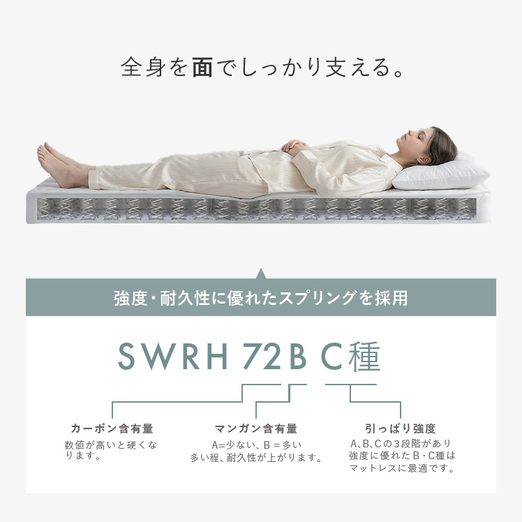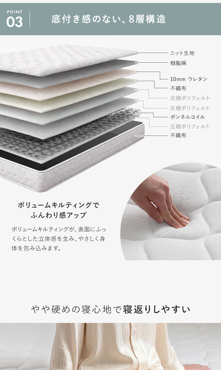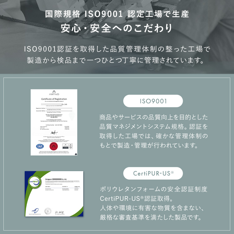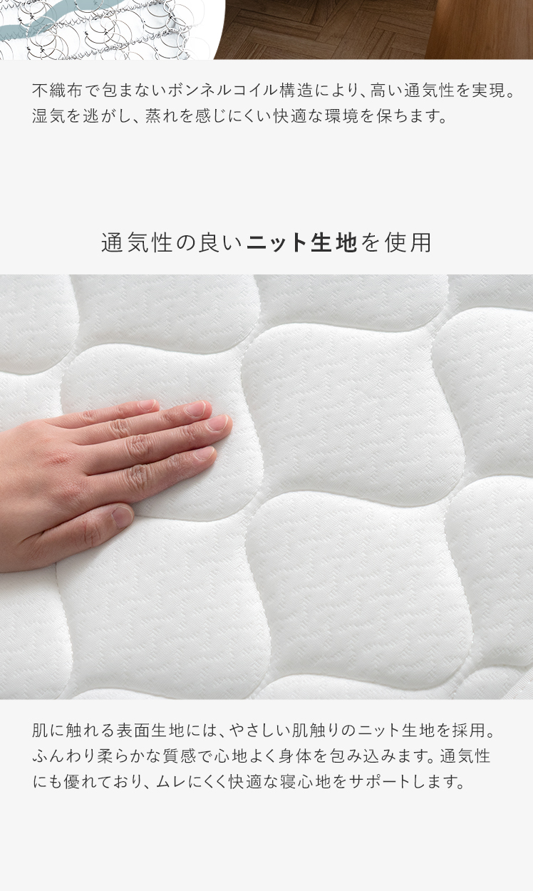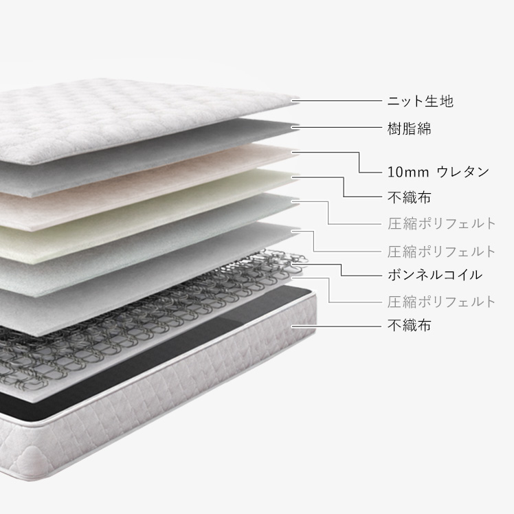 | 材質 | ニット生地、樹脂綿、ウレタン、圧縮ポリフェルト、ボンネルコイル、不織布 |