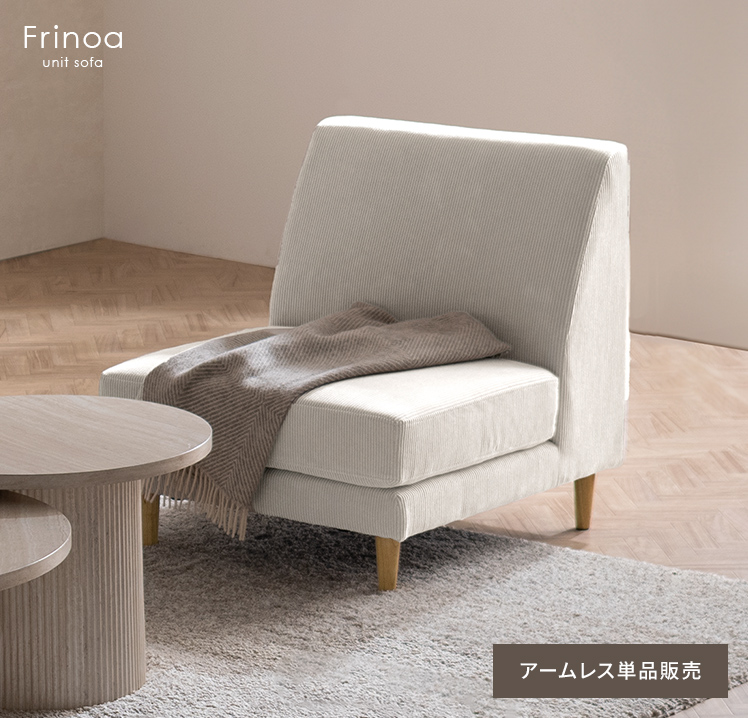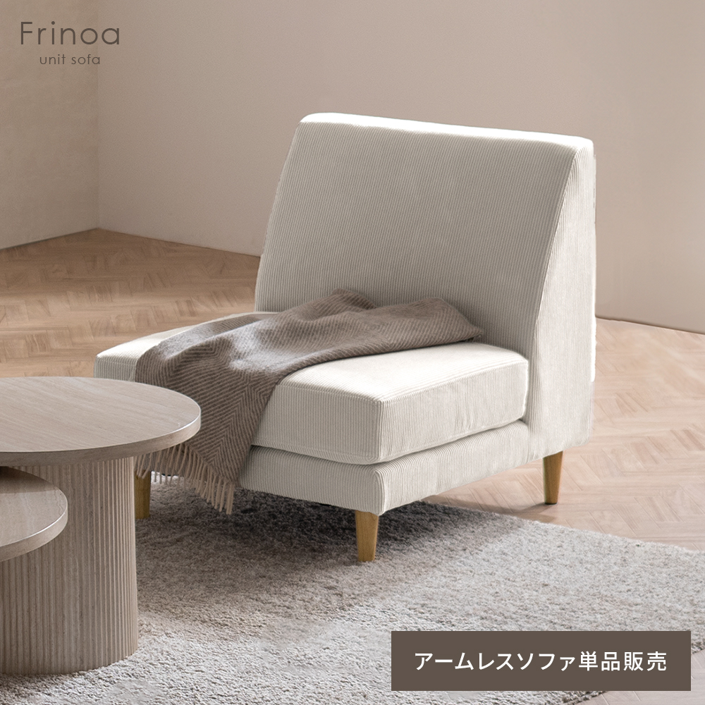 アームテーブル付ユニットソファ Frinoa〔フリノア〕 アームレス/レイアウト自由自在のユニットソファ“Frinoa(フリノア)”。飲み物やスマホを置けるアームテーブルと、ゆったり座れる座面で、くつろぎ時間を快適に。コーデュロイ生地と天然木の素材感が空間にやさしくなじみます。