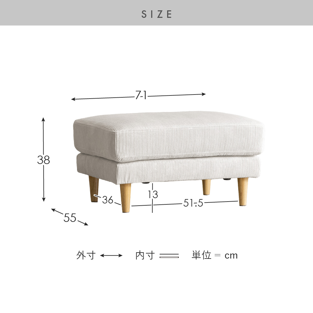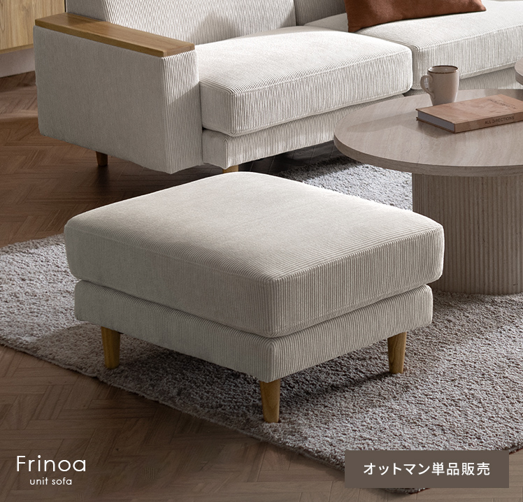 アームテーブル付ユニットソファ Frinoa〔フリノア〕 オットマン/レイアウト自由自在のユニットソファ“Frinoa(フリノア)”。飲み物やスマホを置けるアームテーブルと、ゆったり座れる座面で、くつろぎ時間を快適に。コーデュロイ生地と天然木の素材感が空間にやさしくなじみます。