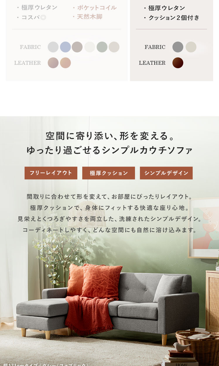 コーナー・カウチソファ rond〔ロンド〕 幅210cmタイプ/間取りに合わせて形を変えて、お部屋にぴったりレイアウト。極厚クッションで、身体にフィットする快適な座り心地。見栄えとくつろぎやすさを両立した、洗練されたシンプルデザイン。コーディネートしやすく、どんな空間にも自然に溶け込みます。