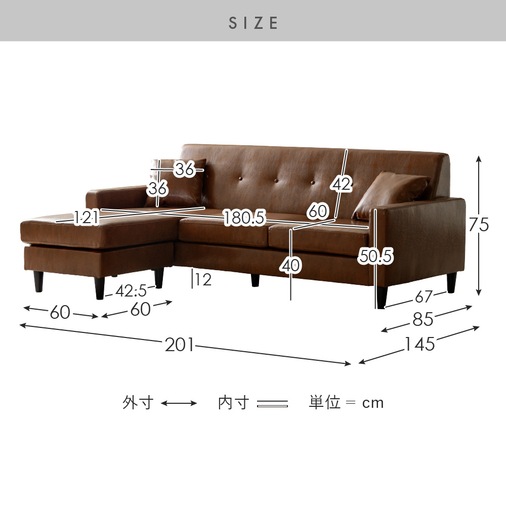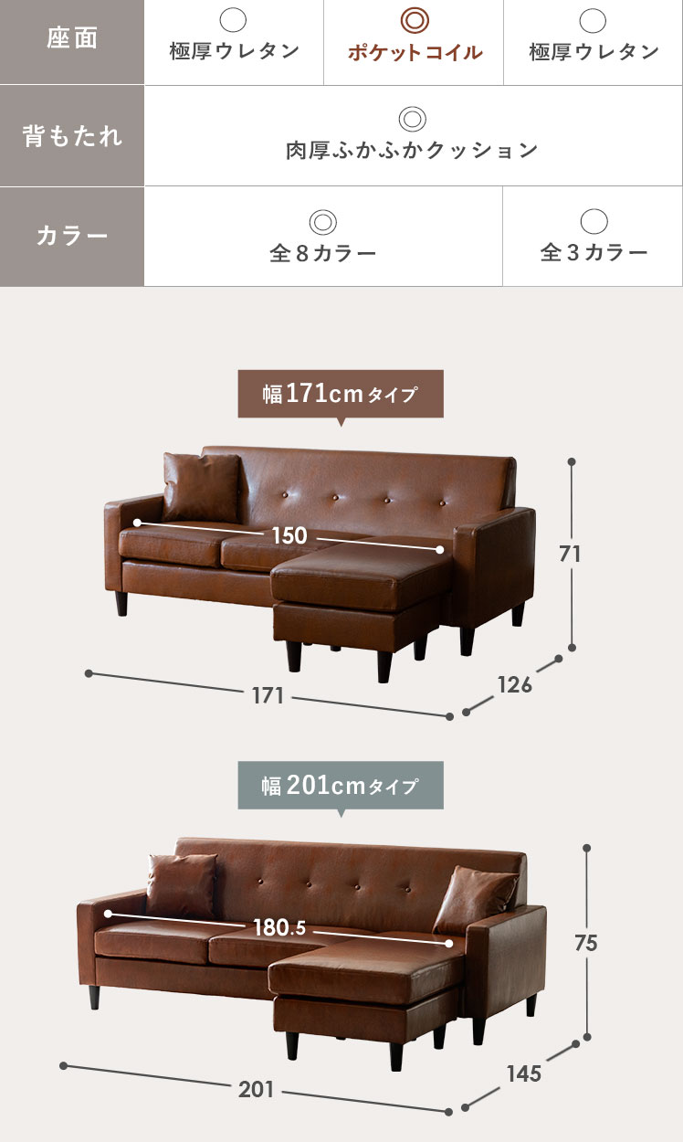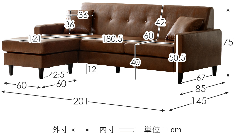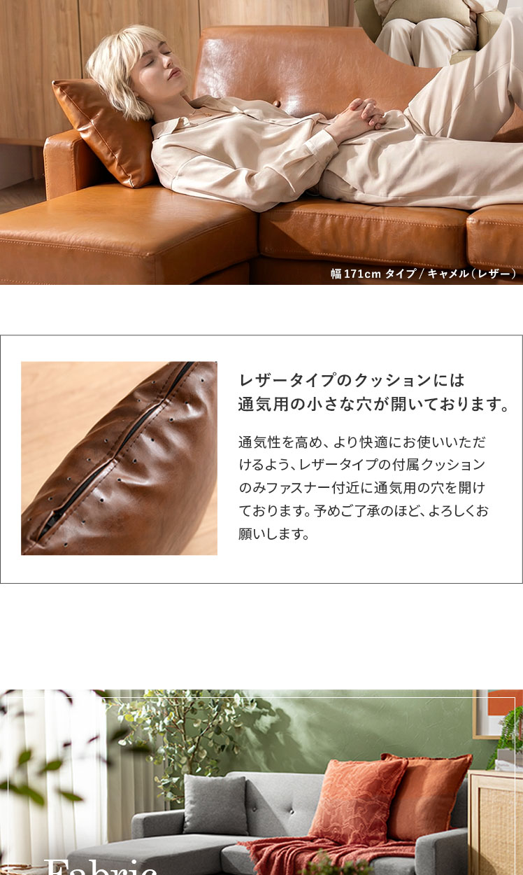 | 備考 | 完成品(脚部のみお客様取り付け) クッション2個付属 ※若干の個体差により、表記サイズと多少の差異が生じる場合がございます。 ※レザータイプのみ、ファスナー付近に通気用の小さな穴が開いております。 |