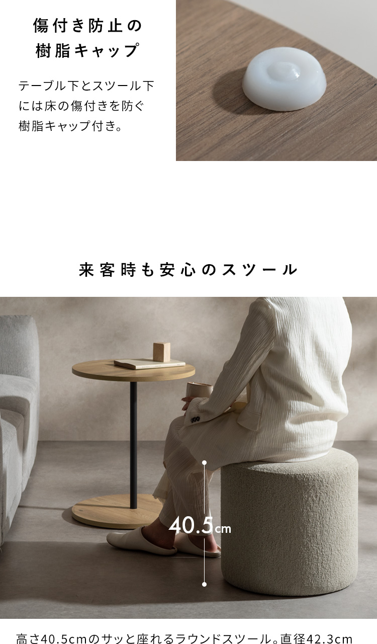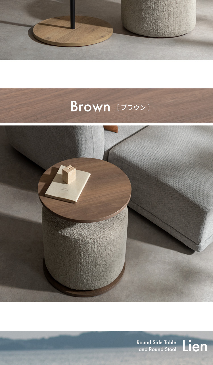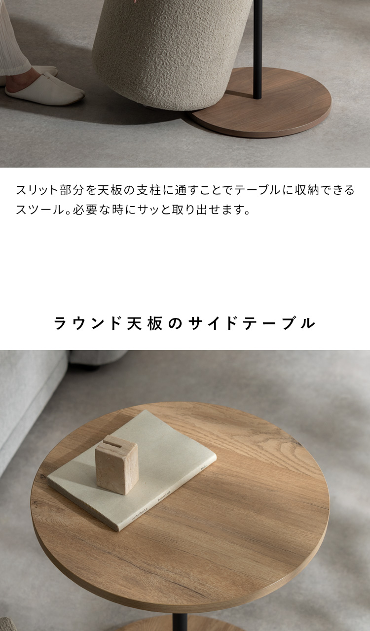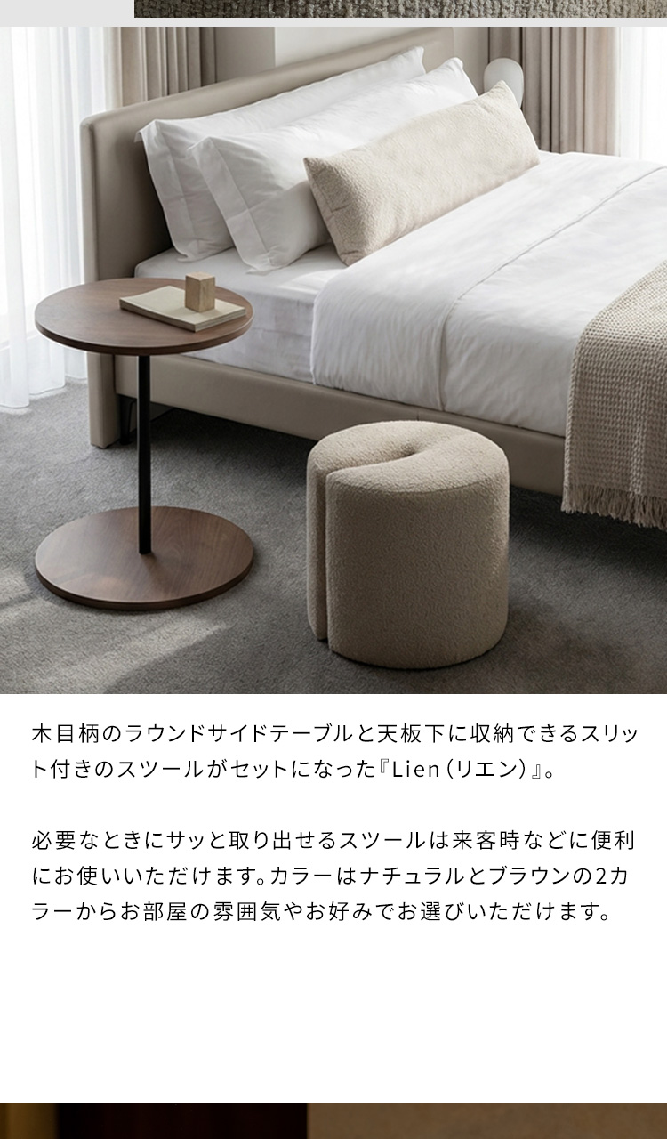 サイドテーブル&スツール Lien〔リエン〕/木目柄のラウンドサイドテーブルと天板下に収納できるスリット付きのスツールがセットになった『Lien(リエン)』。必要なときにサッと取り出せるスツールは来客時などに便利にお使いいただけます。カラーはナチュラルとブラウンの2カラーからお部屋の雰囲気やお好みでお選びいただけます。