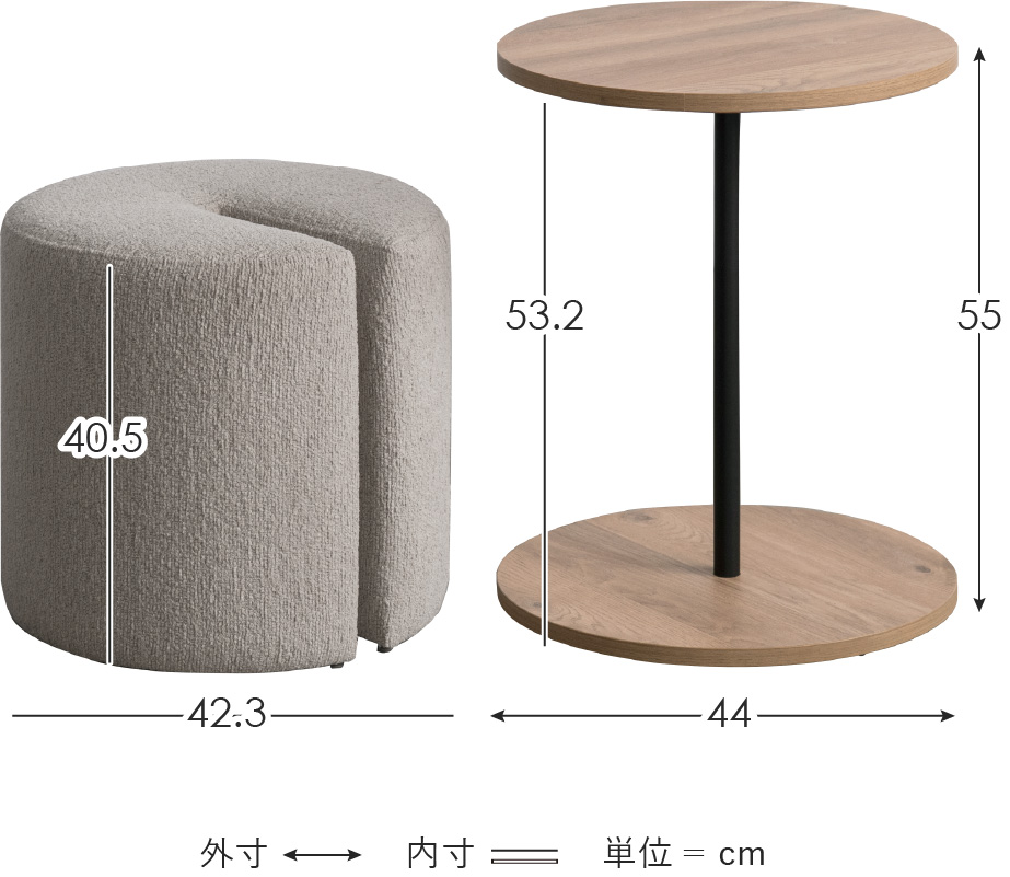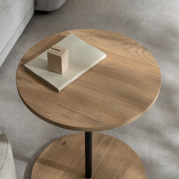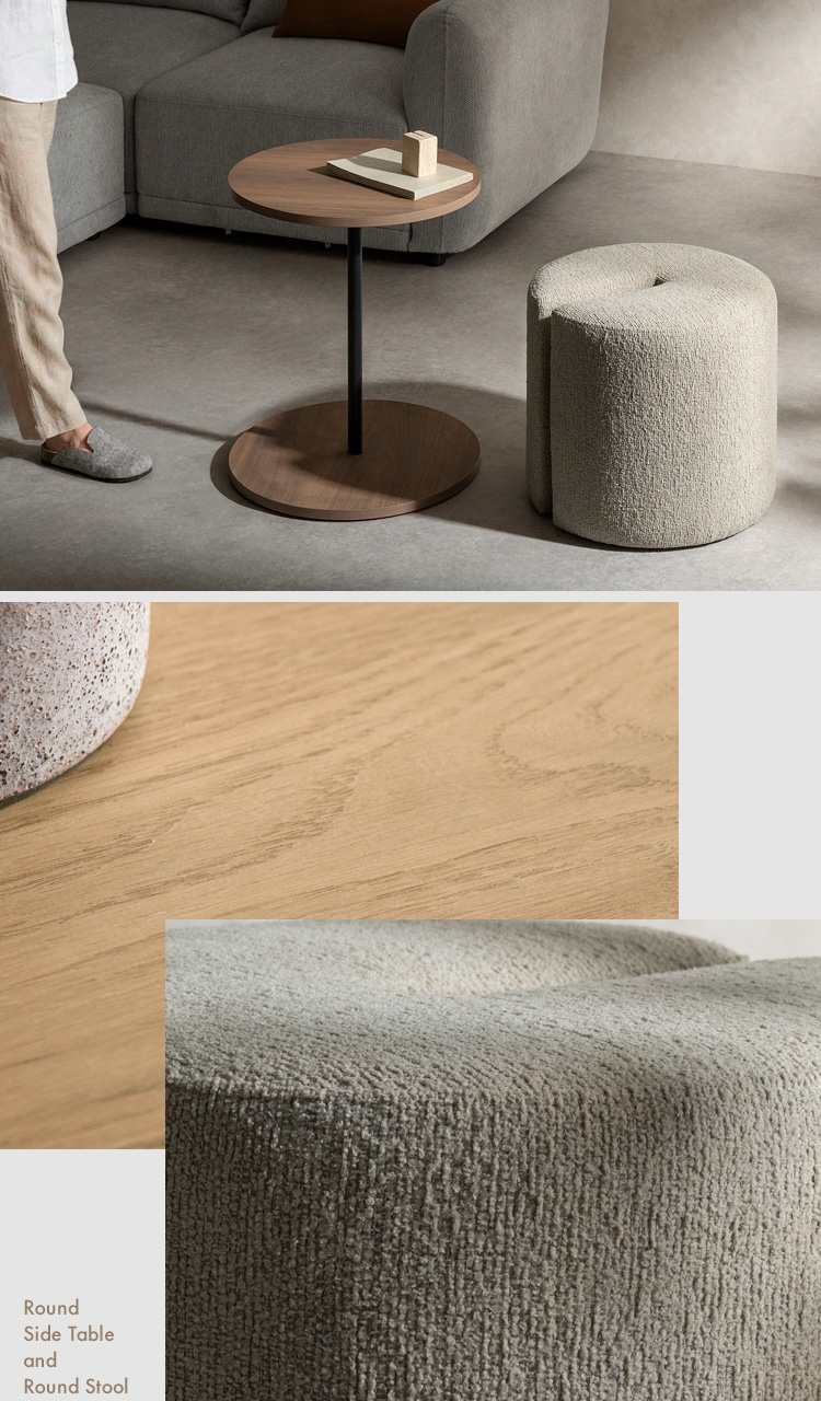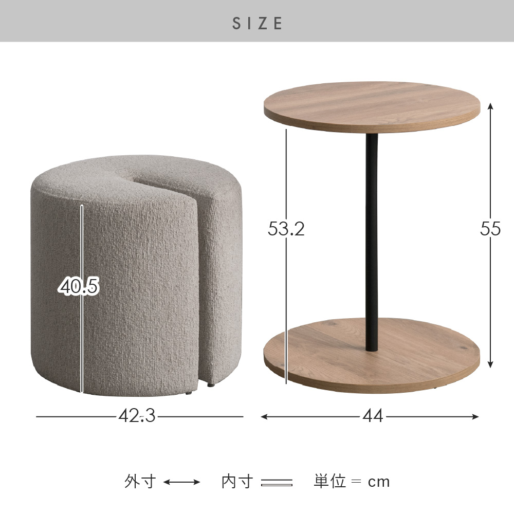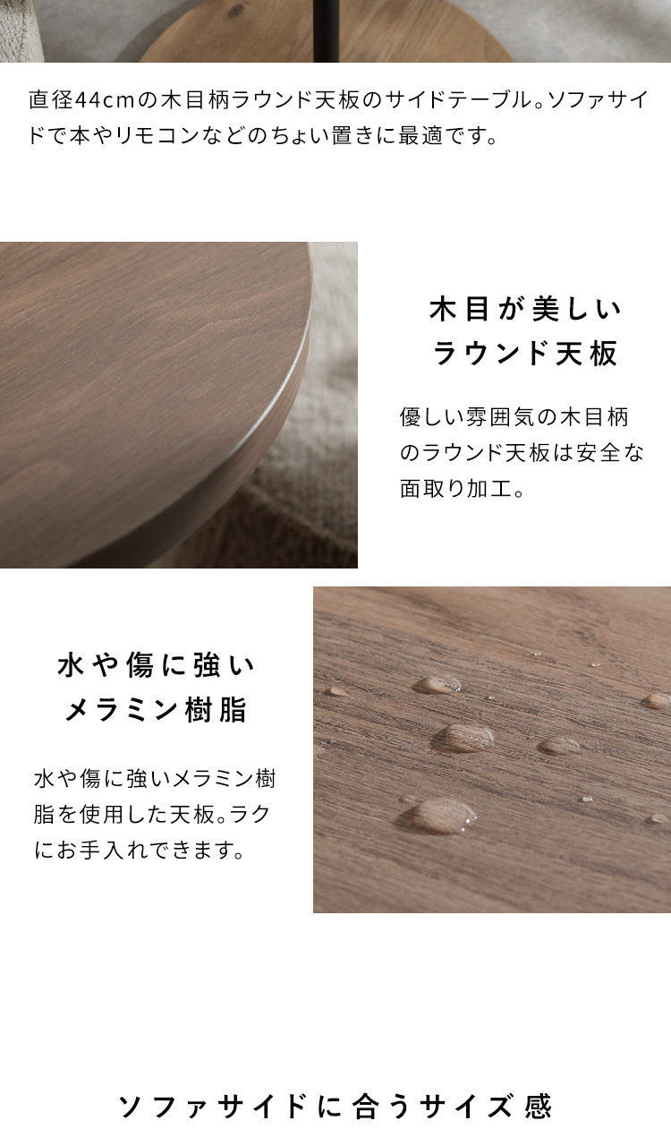 サイドテーブル&スツール Lien〔リエン〕/木目柄のラウンドサイドテーブルと天板下に収納できるスリット付きのスツールがセットになった『Lien(リエン)』。必要なときにサッと取り出せるスツールは来客時などに便利にお使いいただけます。カラーはナチュラルとブラウンの2カラーからお部屋の雰囲気やお好みでお選びいただけます。