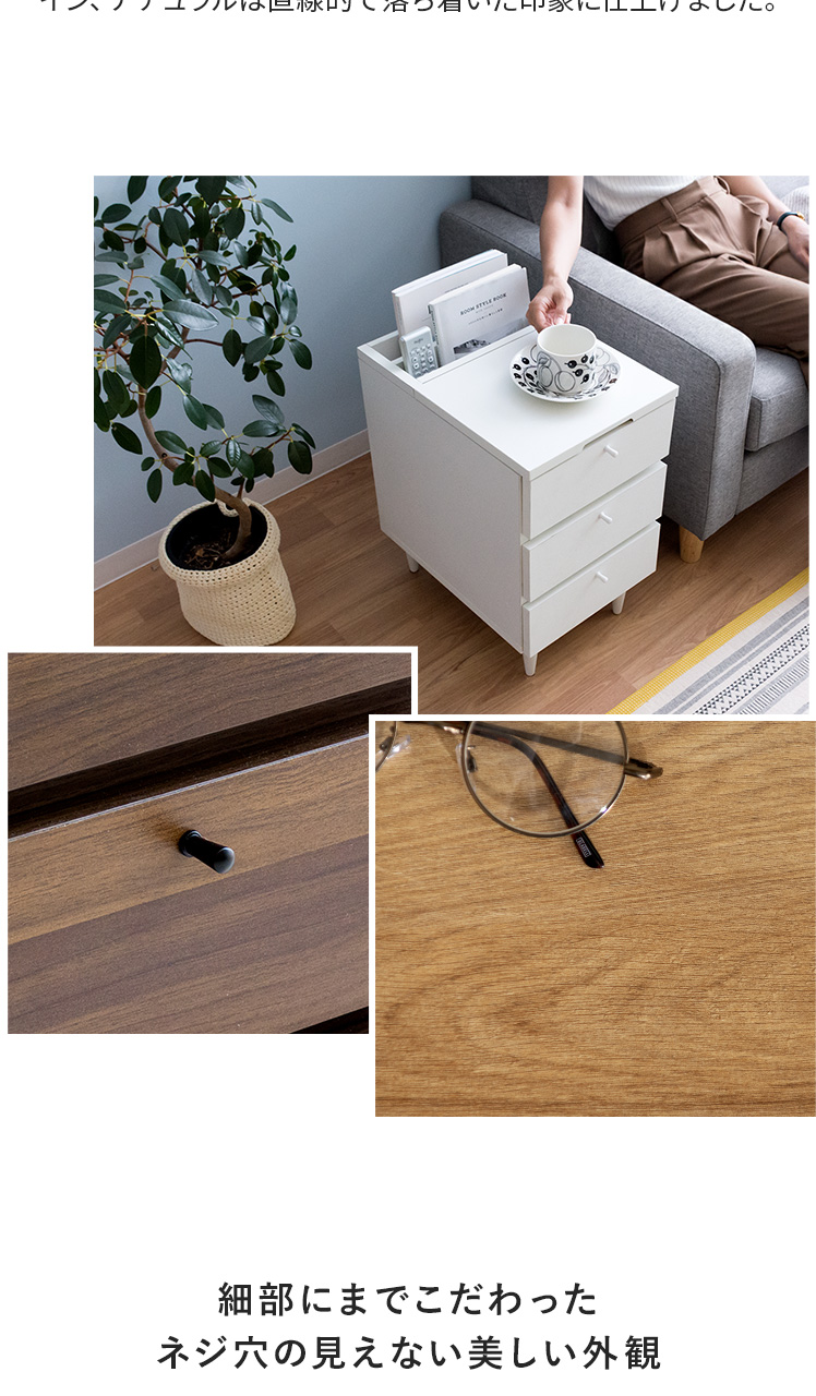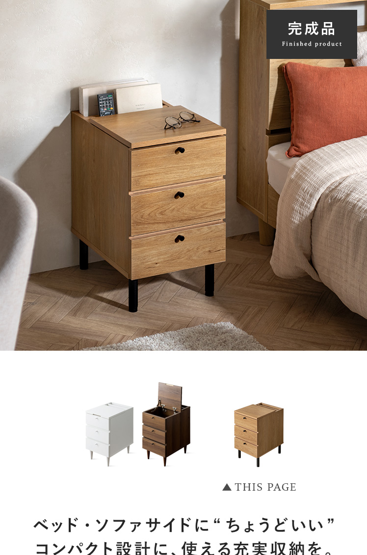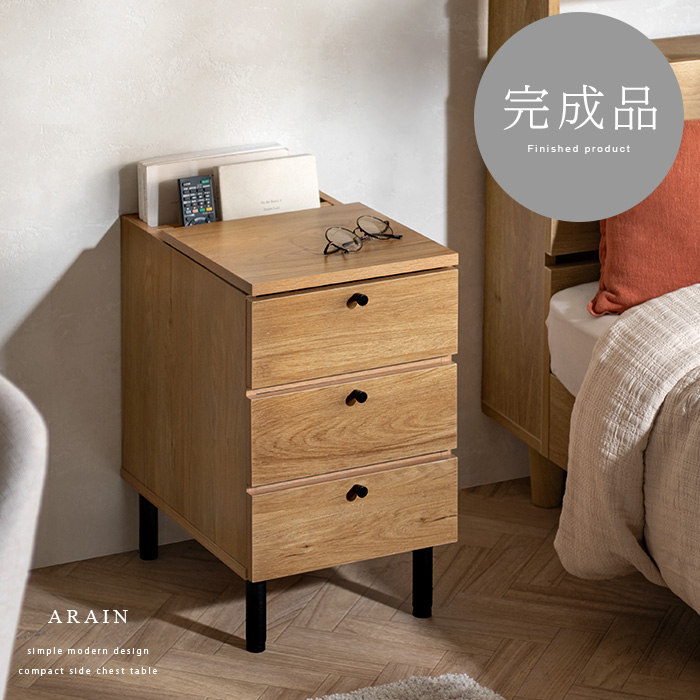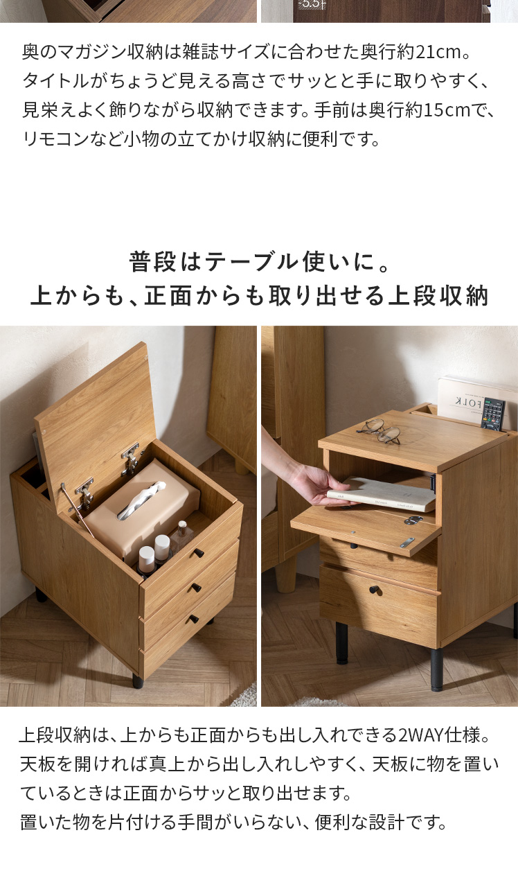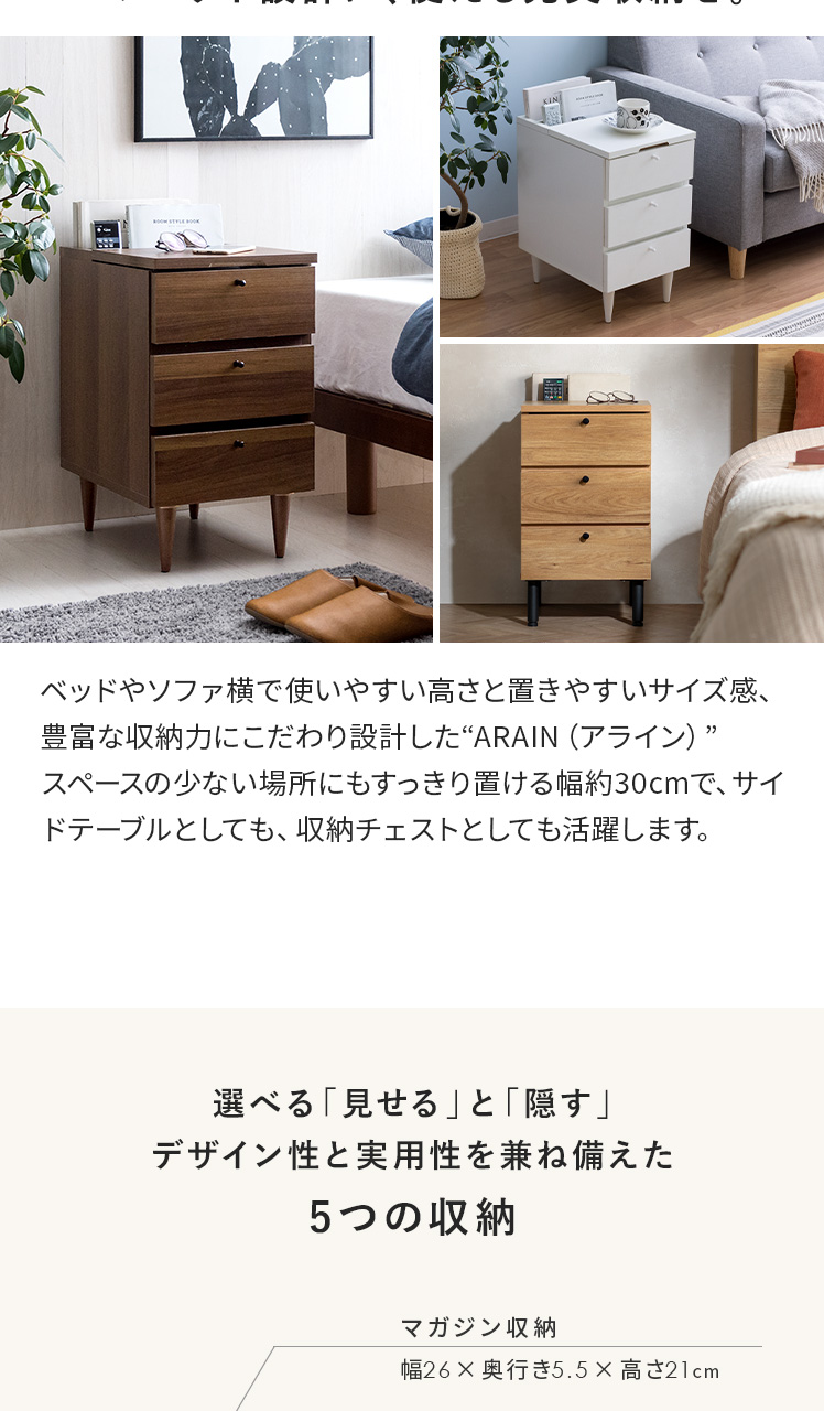 サイドテーブルとしても、収納チェストとしても活躍するこちらのARAIN(アライン)ベッドやソファ横で使いやすい高さ、置きやすいサイズ感、収納力にこだわり設計しました。飲み物やリモコン、スマートフォンなど傍に置いておきたいアイテムが手に取りやすい使い勝手の良い高さで快適に管理可能。またコンパクトに設計することで、ベッドやソファ横などスペースの少ない場所にもすっきりレイアウトして頂けます。さらにマガジン・リモコン収納に、引き出しは2杯ついており、チェストとしての収納力も豊富。「見せる」と「隠す」の2種類の収納で、すっきり片付いた素敵空間に。サイドテーブル、マガジンラック、小物収納など、シーンに合わせて様々な目的で使える多機能サイドチェストテーブルで、あなたの生活をもっと快適に。