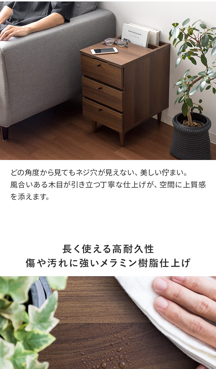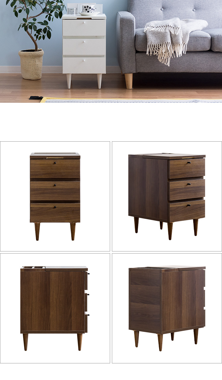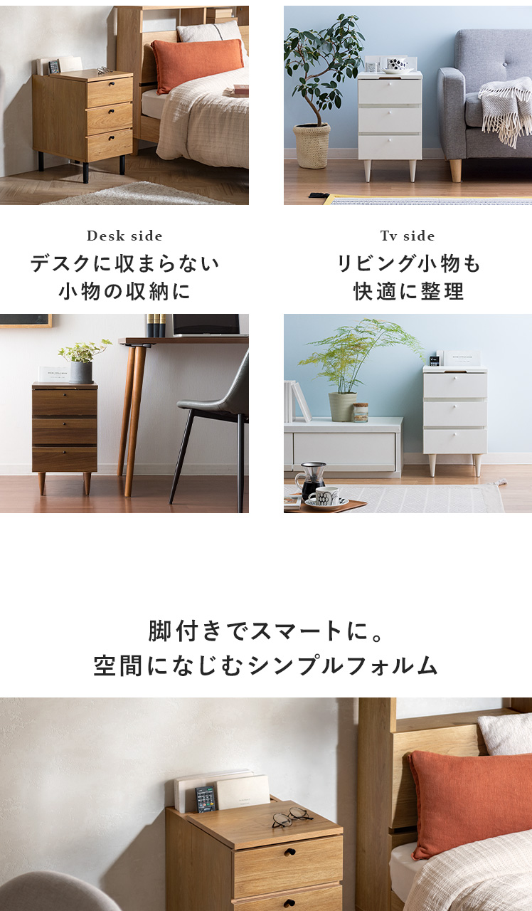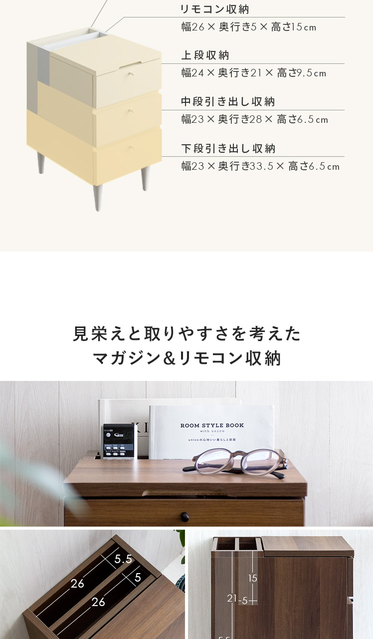 サイドテーブルとしても、収納チェストとしても活躍するこちらのARAIN(アライン)ベッドやソファ横で使いやすい高さ、置きやすいサイズ感、収納力にこだわり設計しました。飲み物やリモコン、スマートフォンなど傍に置いておきたいアイテムが手に取りやすい使い勝手の良い高さで快適に管理可能。またコンパクトに設計することで、ベッドやソファ横などスペースの少ない場所にもすっきりレイアウトして頂けます。さらにマガジン・リモコン収納に、引き出しは2杯ついており、チェストとしての収納力も豊富。「見せる」と「隠す」の2種類の収納で、すっきり片付いた素敵空間に。サイドテーブル、マガジンラック、小物収納など、シーンに合わせて様々な目的で使える多機能サイドチェストテーブルで、あなたの生活をもっと快適に。