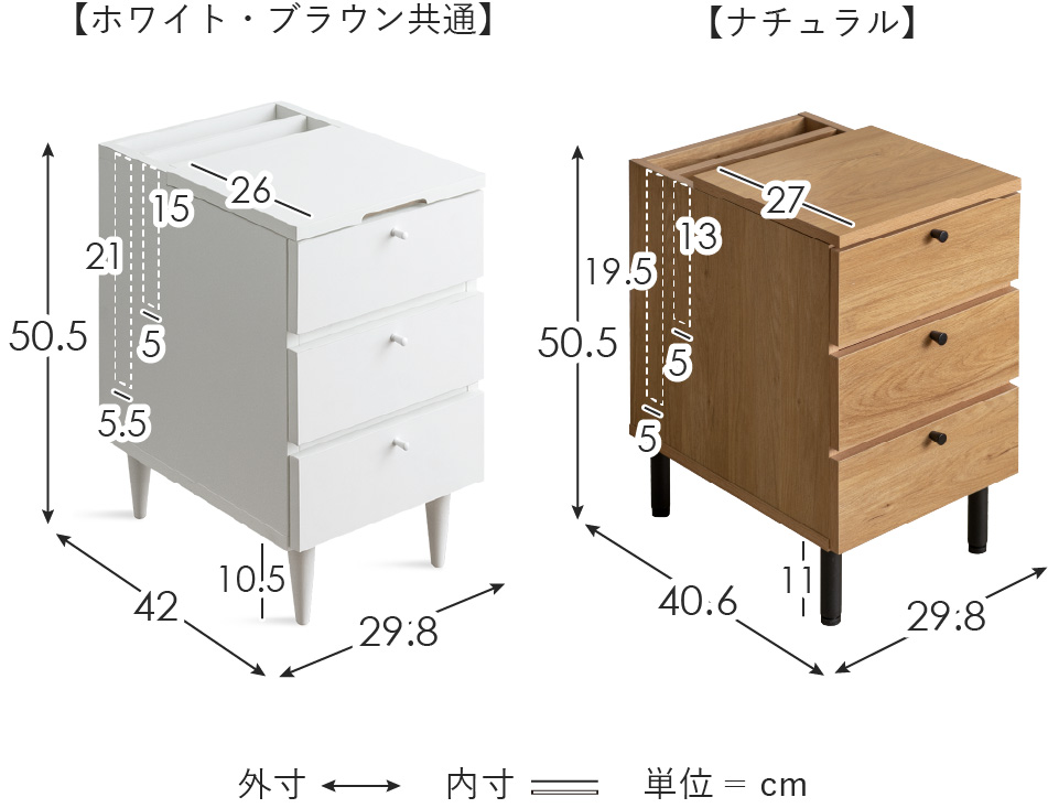 | 中段引き出し内寸 | ホワイト・ブラウン・ナチュラル/約幅23×奥行き28×高さ6.5cm |