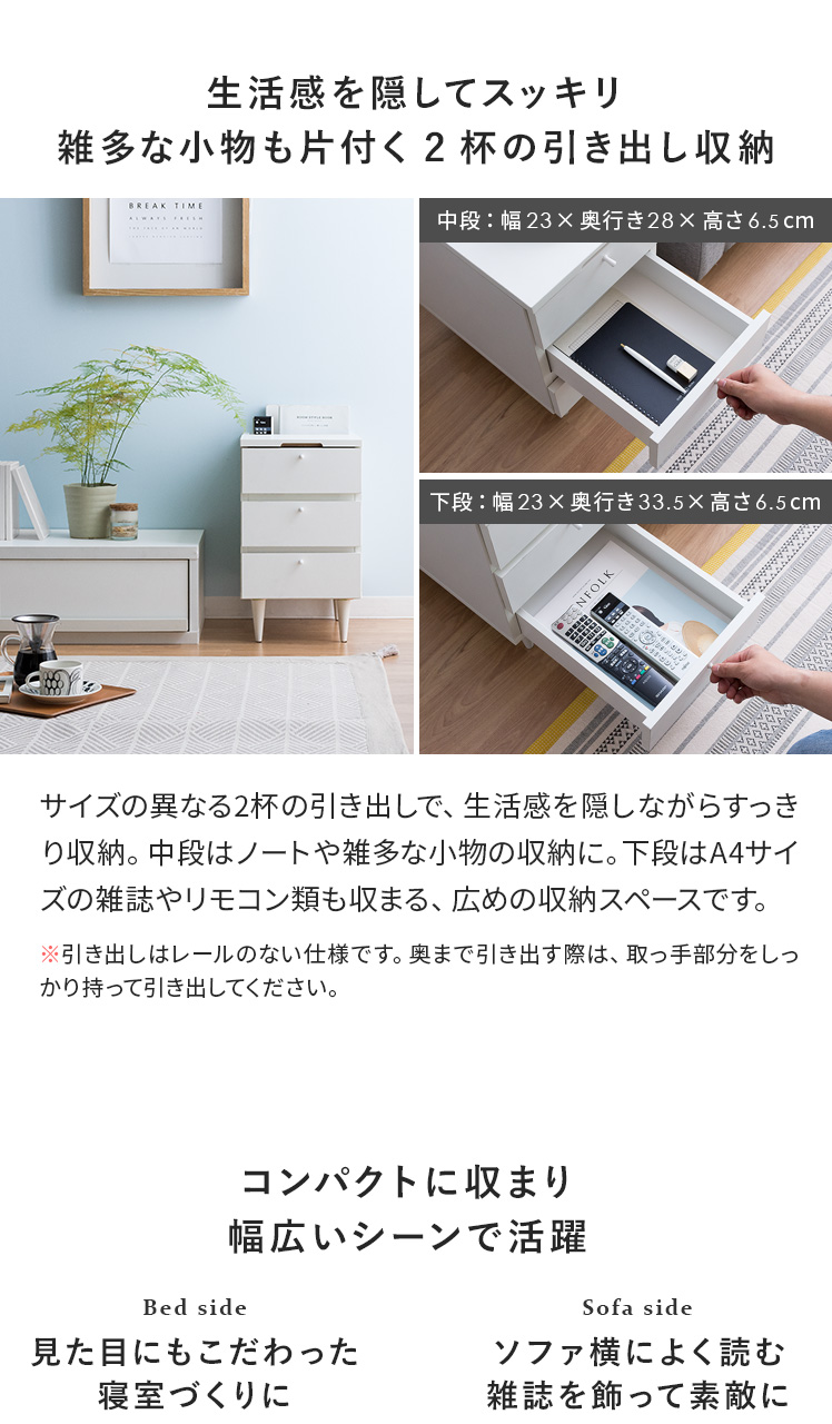 | 下段引き出し内寸 | ホワイト・ブラウン・ナチュラル/約幅23×奥行き33.5×高さ6.5cm |