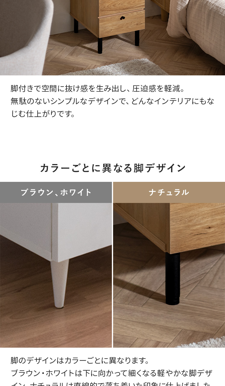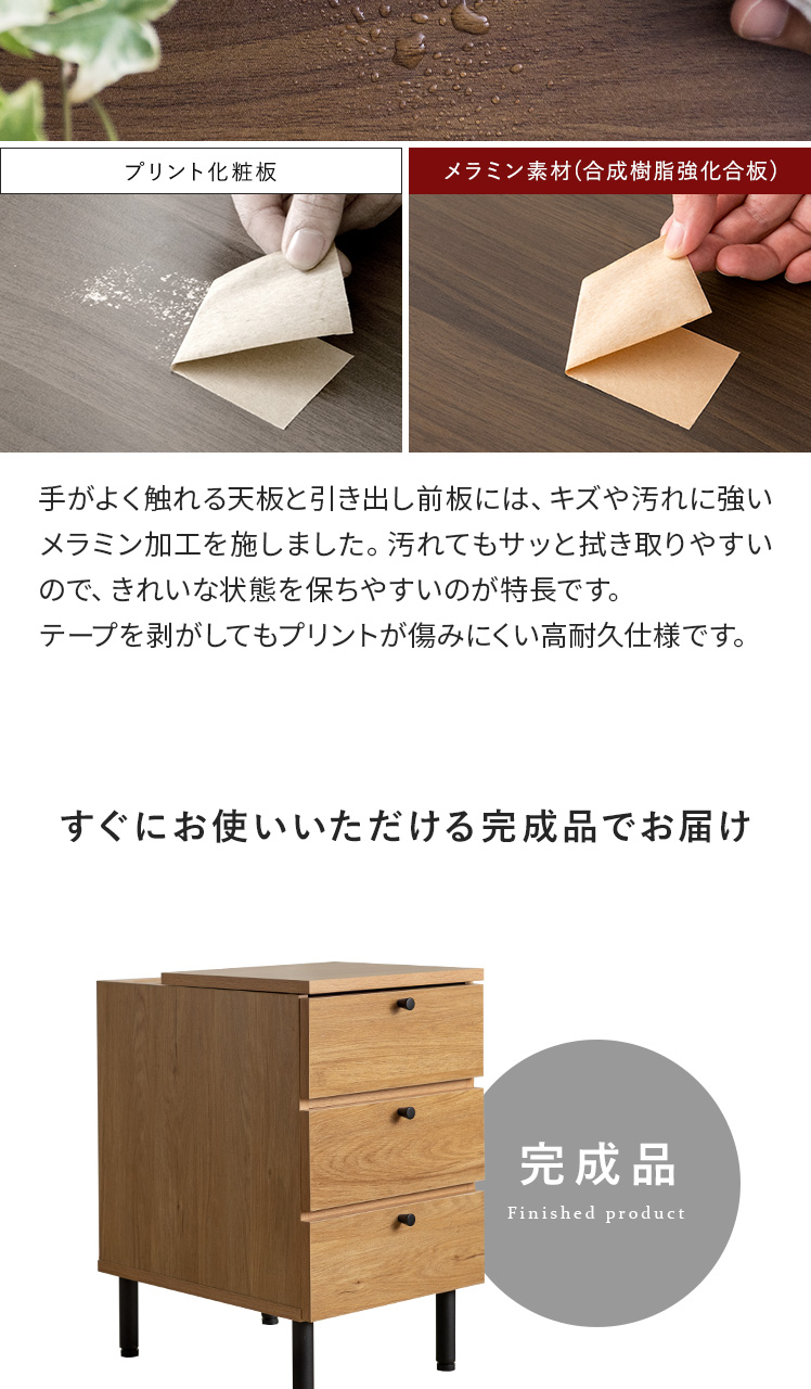 | 材質 | ホワイト・ブラウン共通/メラミン化粧繊維板(メラミン)、プリント紙化粧繊維板、天然木、スチール ナチュラル/メラミン化粧繊維板、スチール(粉体塗装仕上げ) |