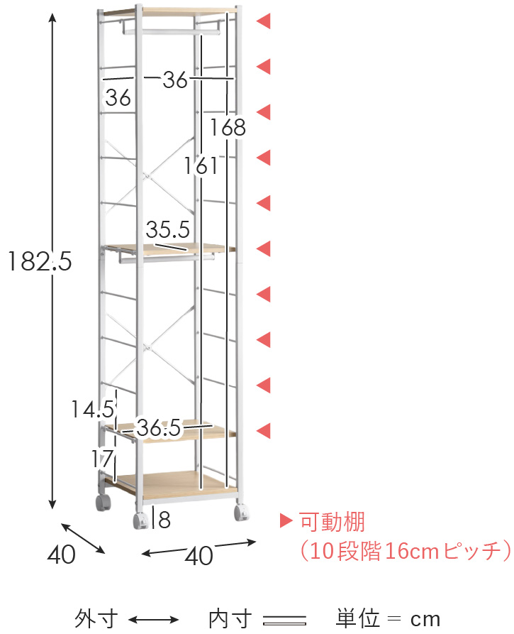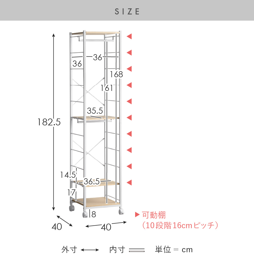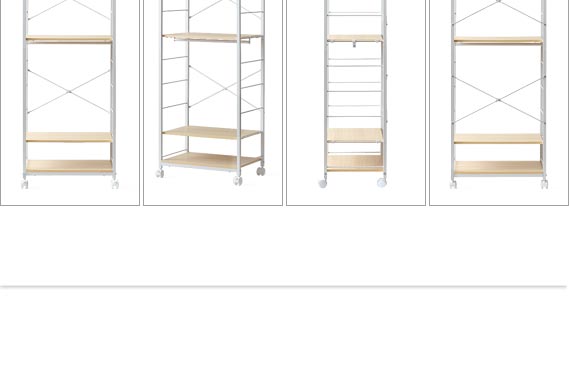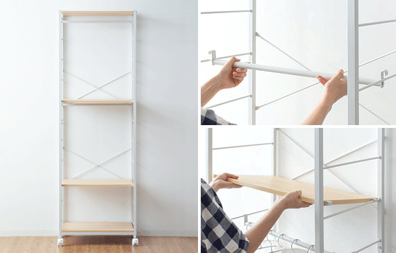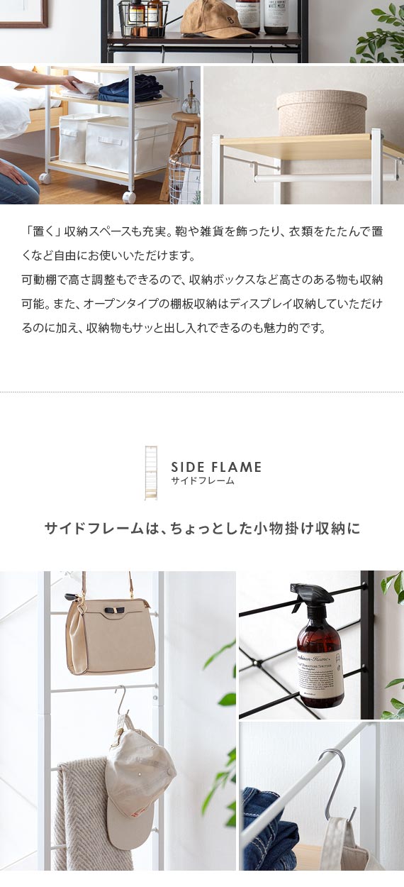 16cm間隔で用意されたサイドフレームに引っ掛けるだけで簡単に位置調節も可能。工具不要で手軽に、お持ちのアイテムを無駄なく美しく収納していただけます。