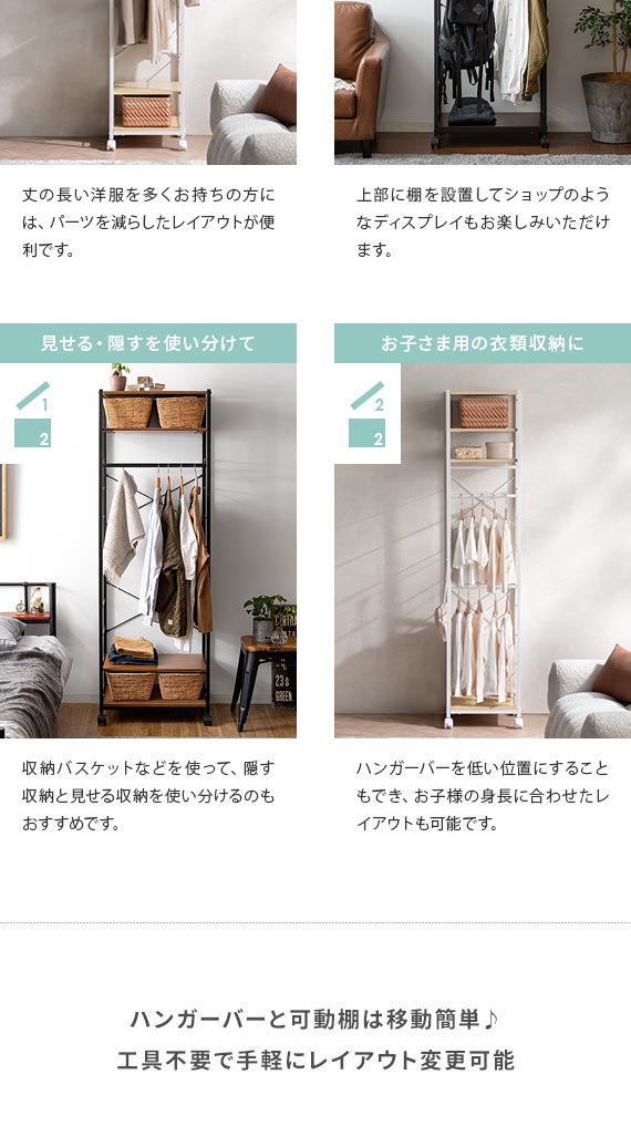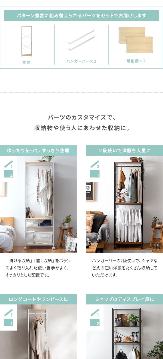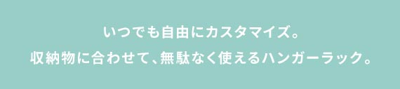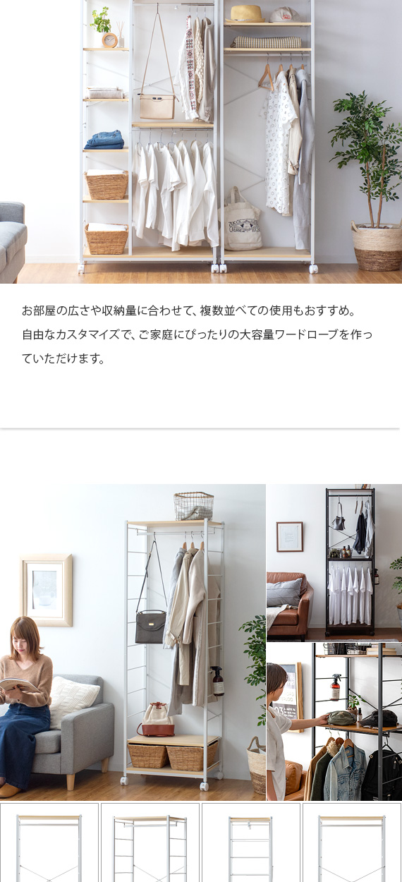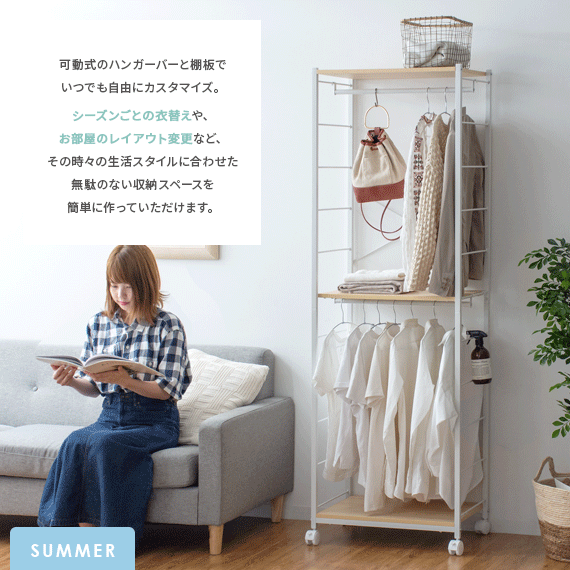 可動式のハンガーバーと棚板でいつでも簡単カスタマイズ。衣替えやお部屋のレイアウト変更など、その時々の生活スタイルに合わせた収納スペースに。