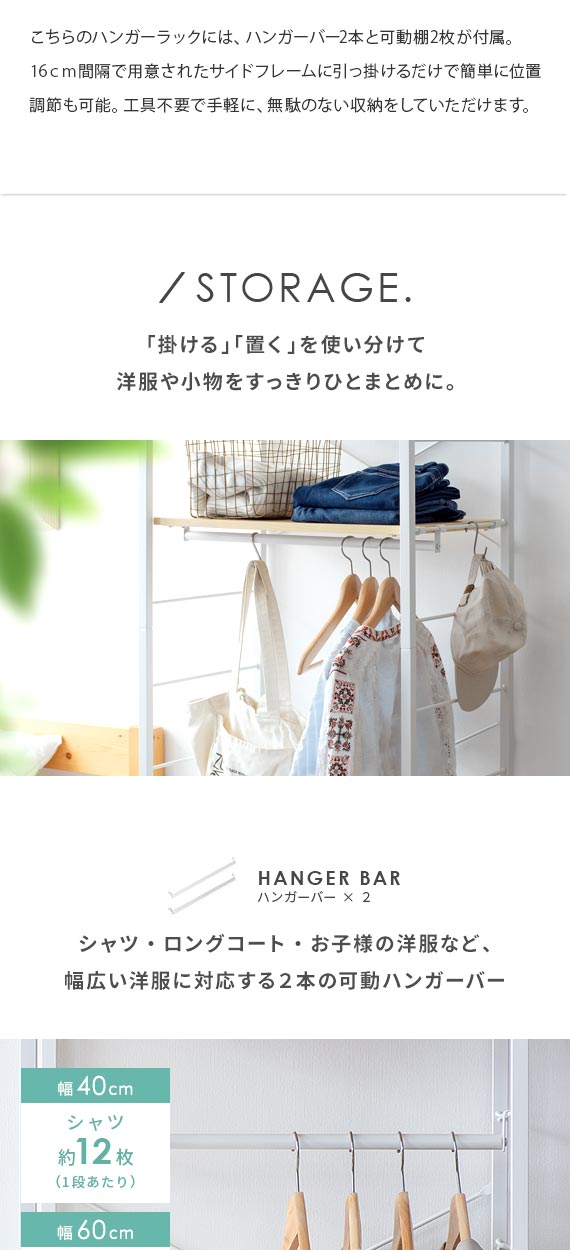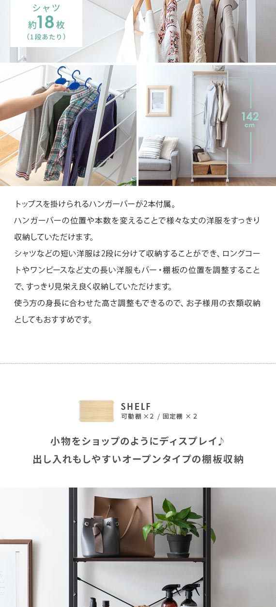 1段あたり約18枚のシャツを収納できるハンガーバーが2本付属。ハンガーバーの位置や本数を変えることでさまざまな丈の洋服をすっきり収納していただけます。
