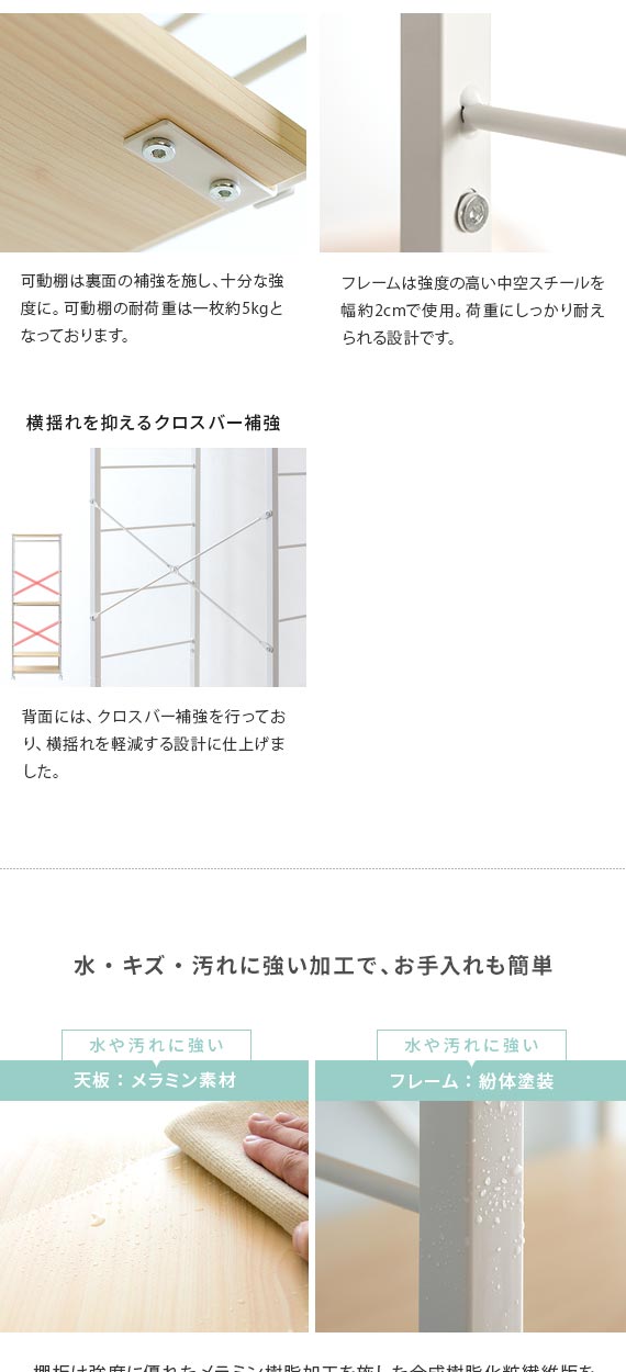 棚板は強度に優れたメラミン樹脂加工を施した合成樹脂化粧繊維版を使用。