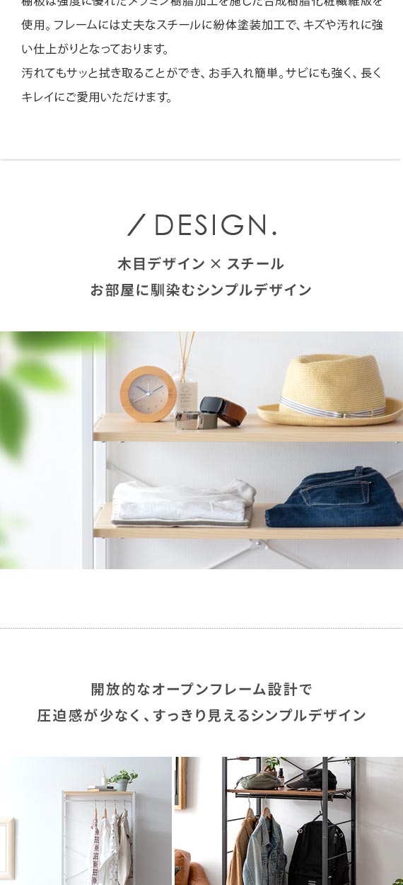 細身のフレームでシンプルに構成されたラックデザイン。背面と側面をふさがないことで、窓際や壁面に置いても光や空気も通しやすい設計となっております。