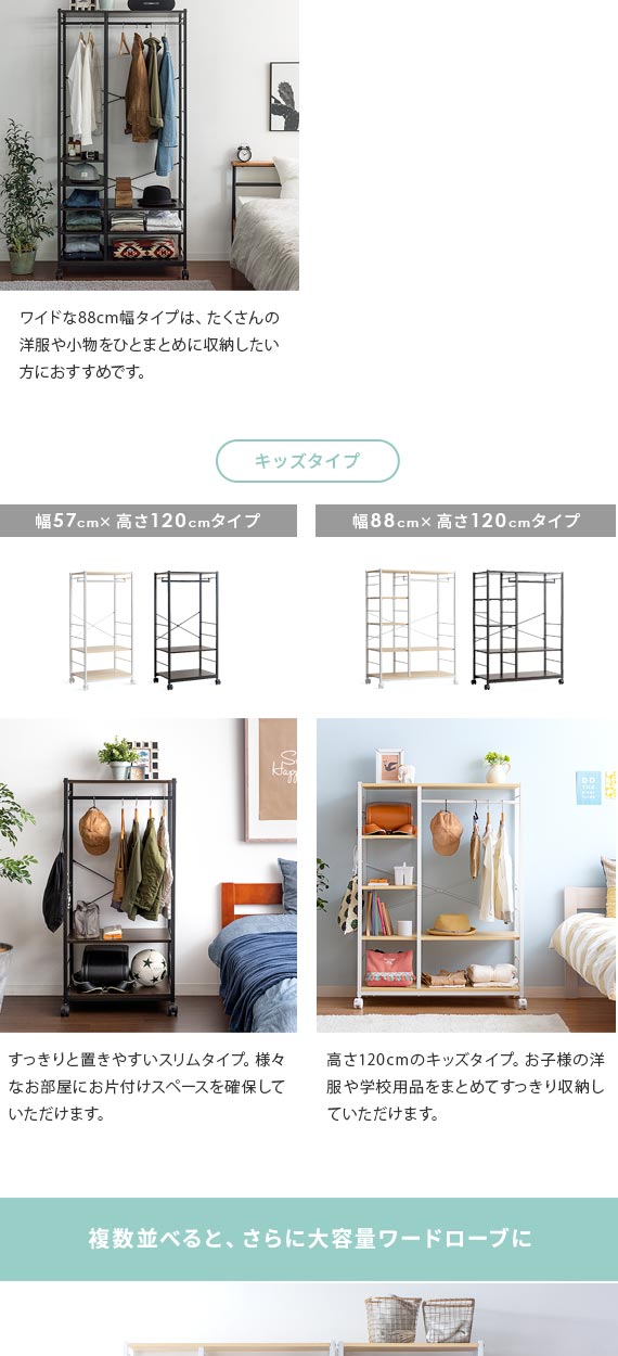 お部屋の広さや収納量に合わせて、複数並べての使用もおすすめです。自由なカスタマイズで、ご家庭にぴったりの大容量ワードローブを作っていただけます。