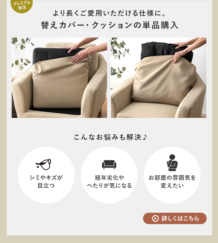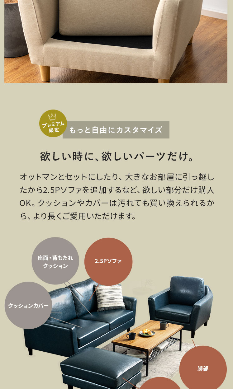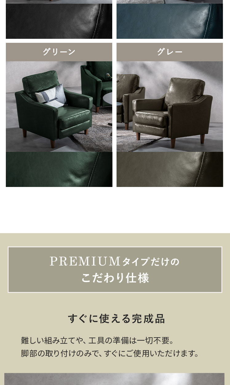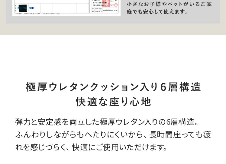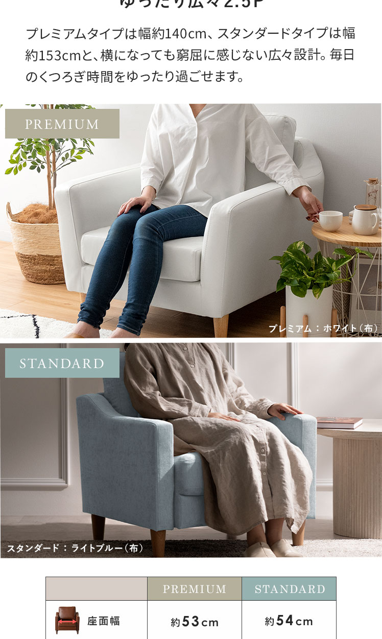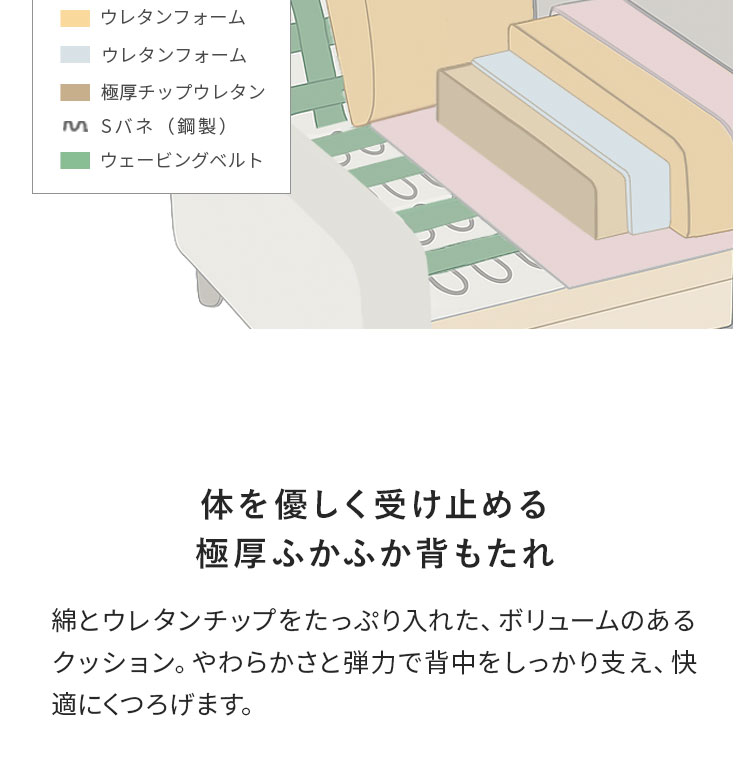 | 中材 | スタンダード/鋼製バネ、ウレタン、ウェービングベルト、ウレタンフォーム プレミアム/鋼製バネ、ウェービングベルト、ウレタンフォーム、綿 |