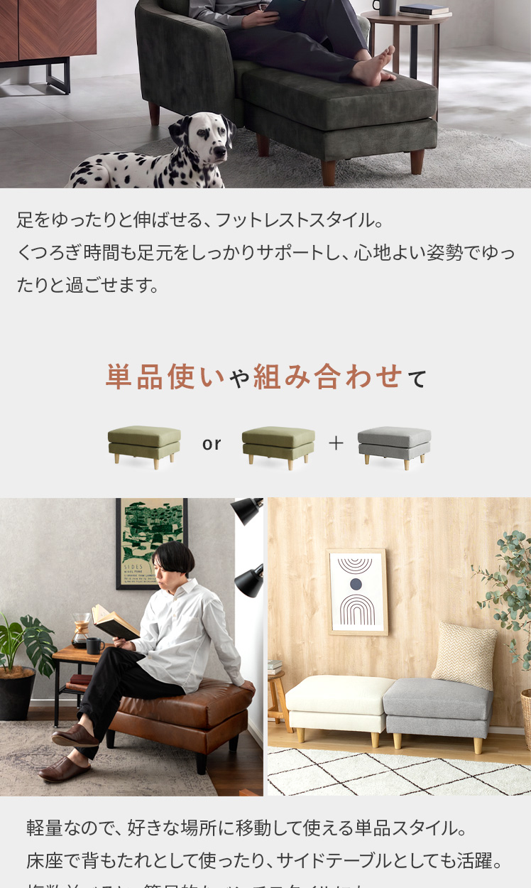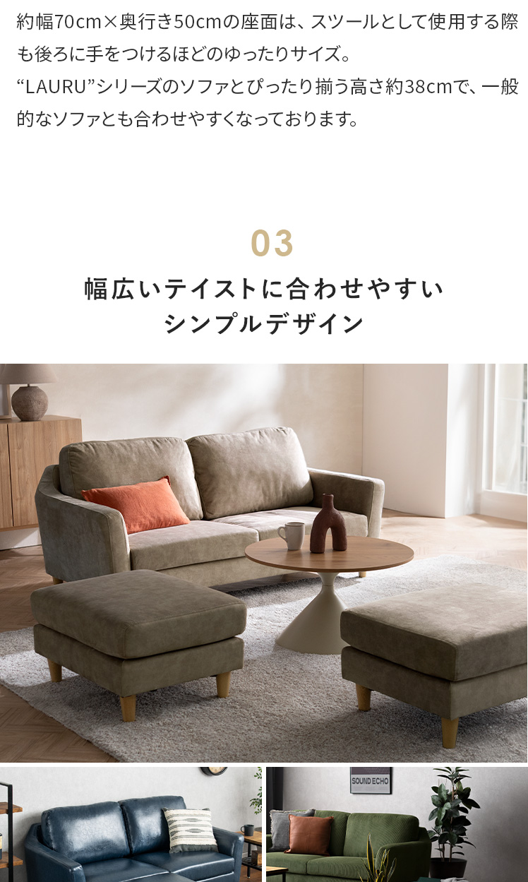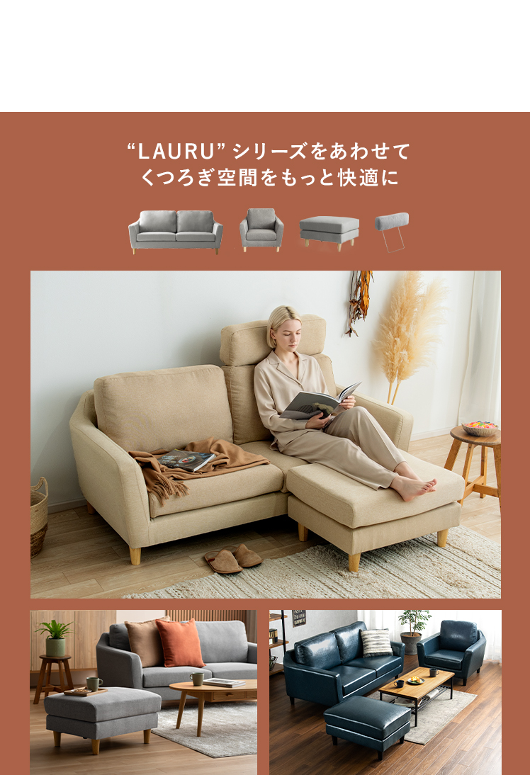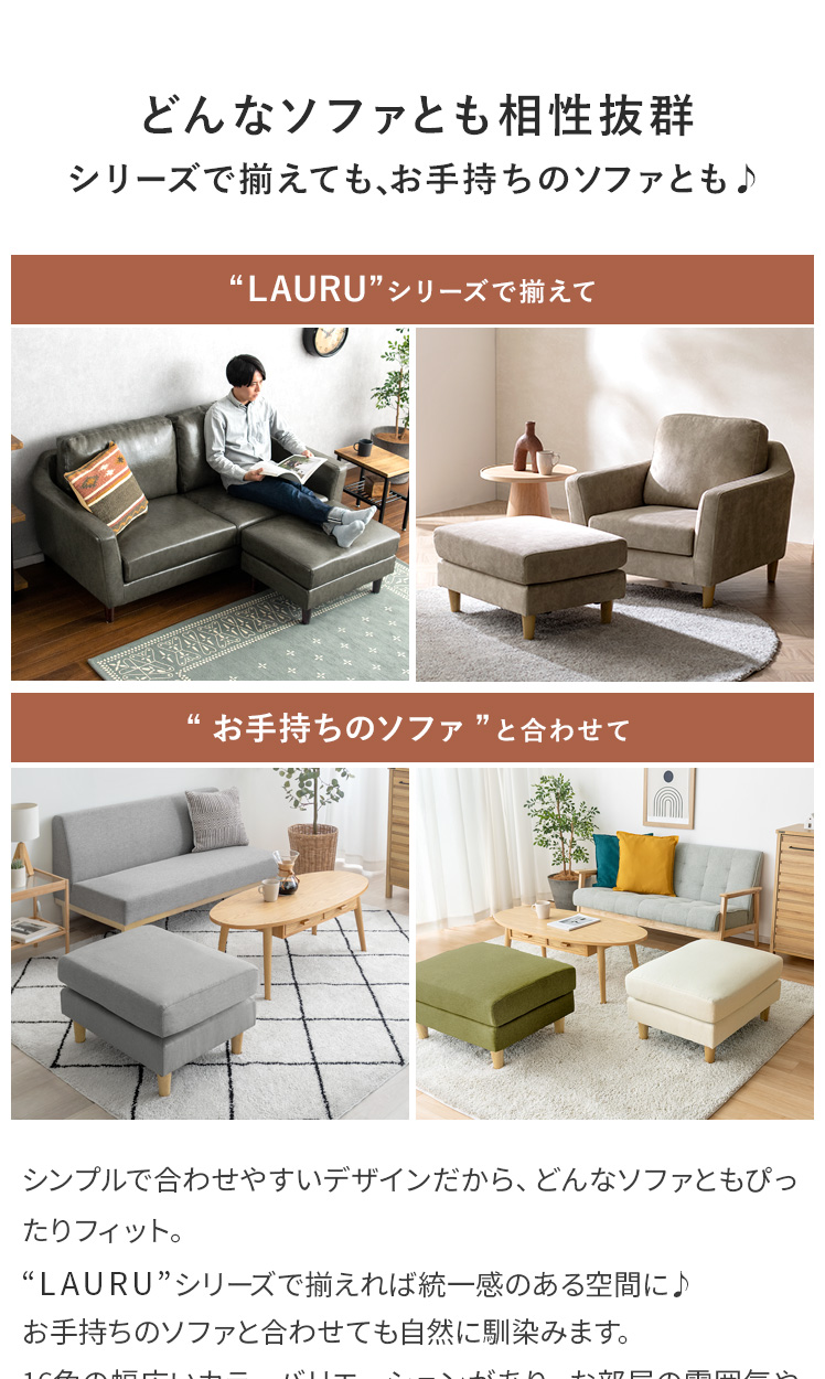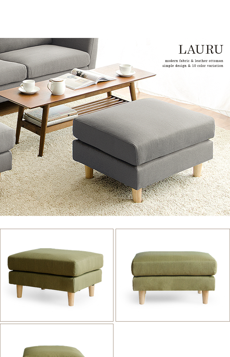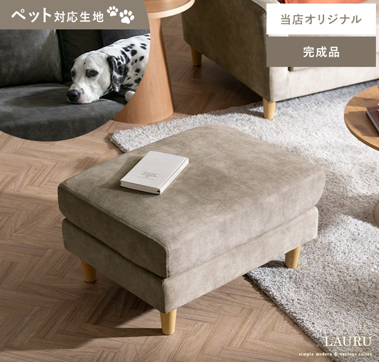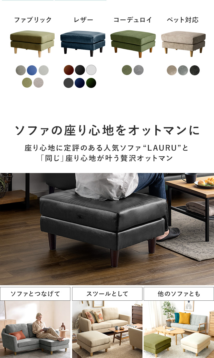 オットマン LAURU(ラウル) ペット対応生地タイプ/シンプルで合わせやすい定番デザインと上質な座り心地で人気のソファ”LAURU”から待望のオットマンが登場♪座面の高さや幅もソファシリーズと合うように設計されておりますので、オットマンをソファとぴったり繋げて使用して頂けます。合わせ方次第で、ソファベッド風や、カウチソファ風など幅広いスタイルをお楽しみいただけます。ソファシリーズと合わせた選べる9色の豊富なカラーバリエーションに、質感の良い天然木脚部を合わせた、見た目のデザイン性も目を惹くオットマンとなっております。お気に入りのくつろぎ空間に、くつろぎスタイルの幅を広げるLAURUオットマンをプラス♪快適性のアップしたワンランク上のリビングづくりを。
