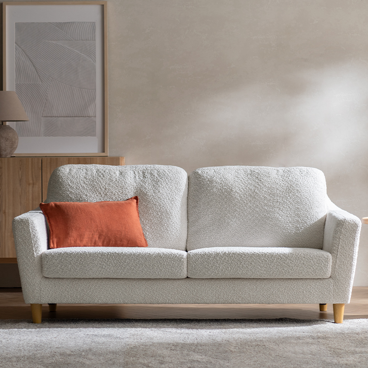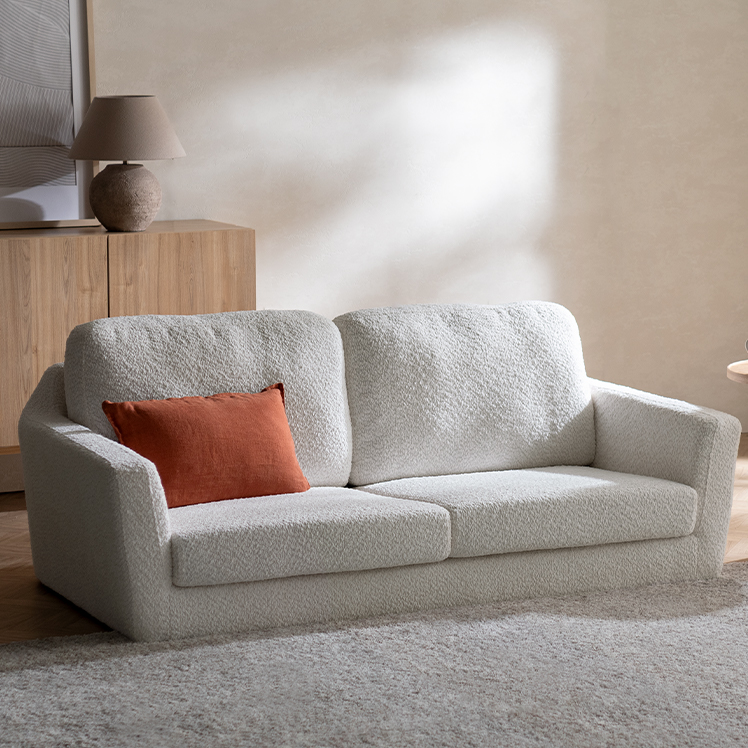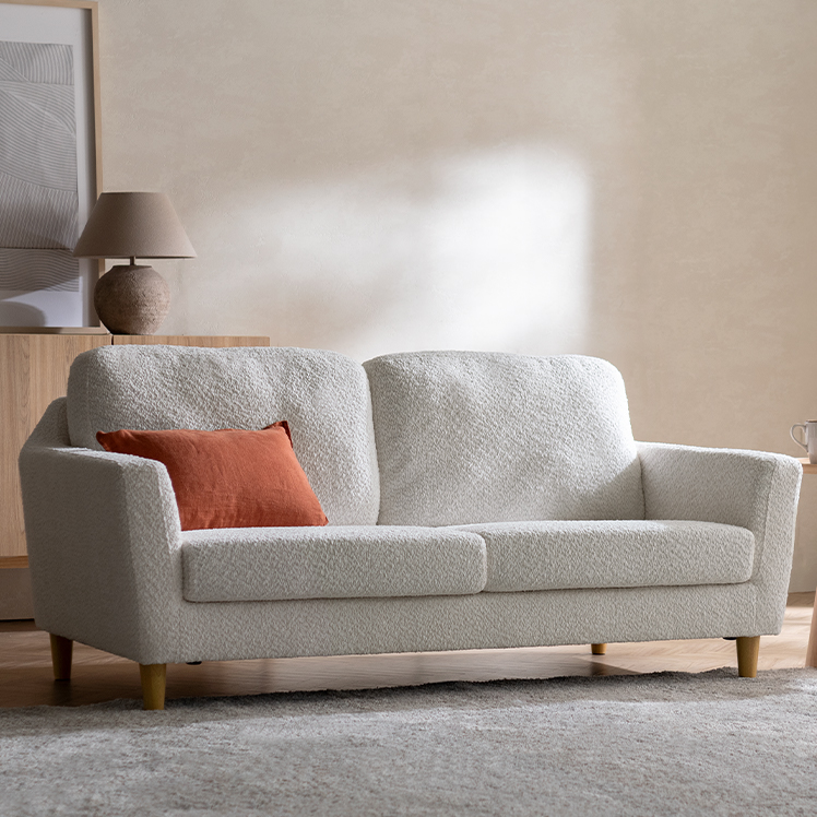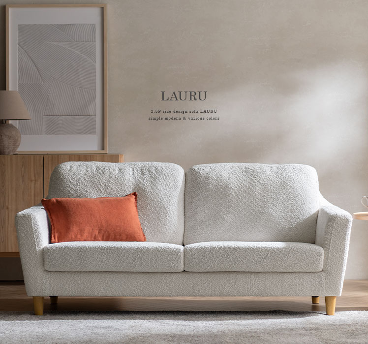 2.5Pデザインソファ LAURU〔ラウル〕 プレミアムタイプ ブークレ生地/洗練されたシンプルなデザインで、どんな空間にも自然に馴染み、上品な印象に。6層ウレタン構造が、ふんわりとしたやさしさと、沈みすぎない弾力を両立します。長時間でも疲れにくく、くつろぎの時間をより快適に。見た目も座り心地も、毎日使いたくなる心地よさに仕上げました。