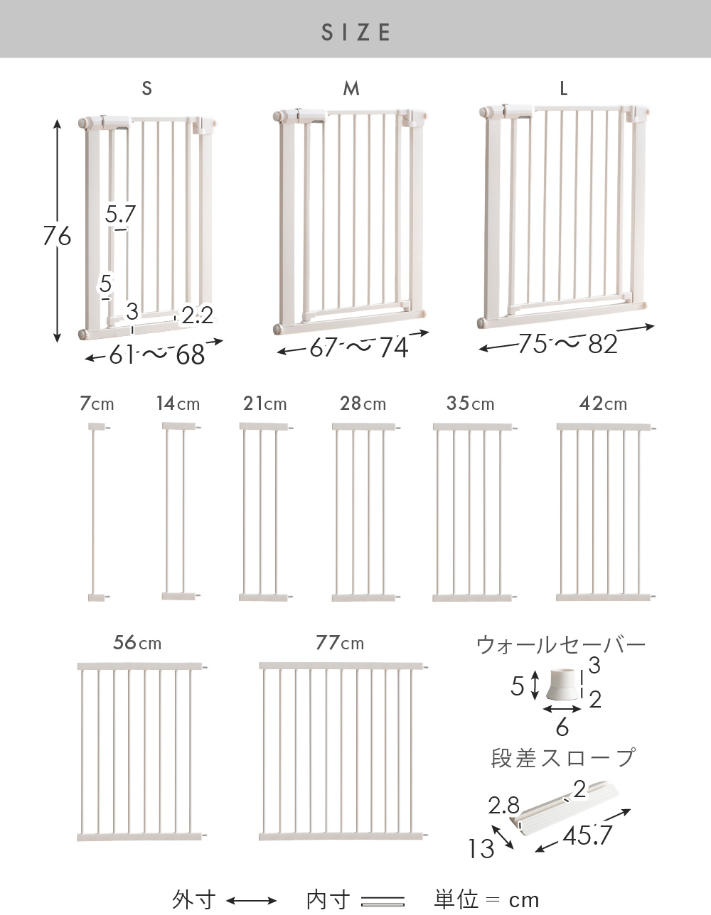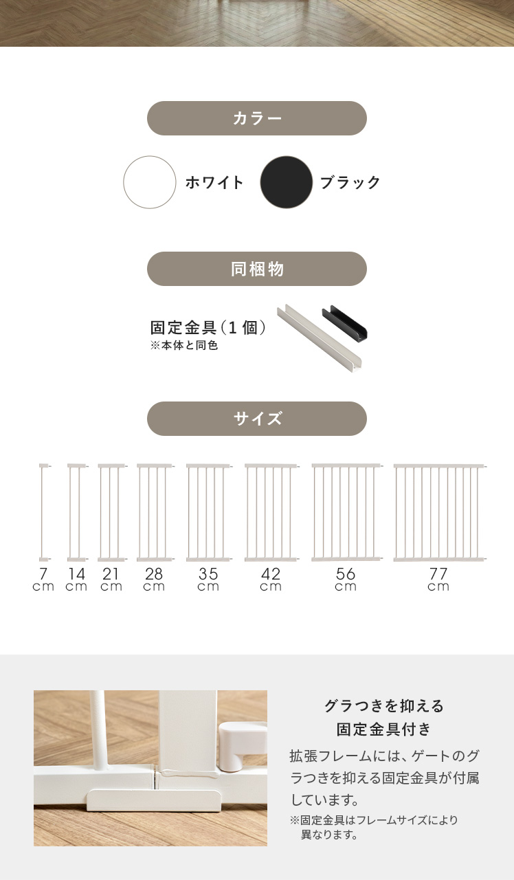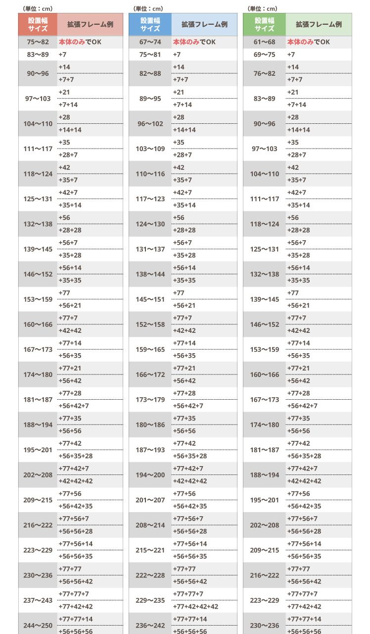 | パーツ(種類) | 拡張フレーム/7cm、14cm、21cm、28cm、35cm、42cm、56cm、77cm 段差スロープ ウォールセーバー |