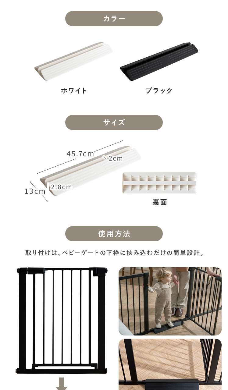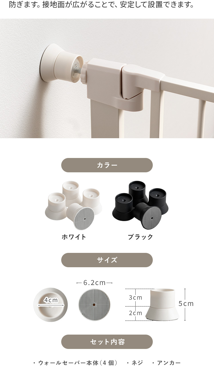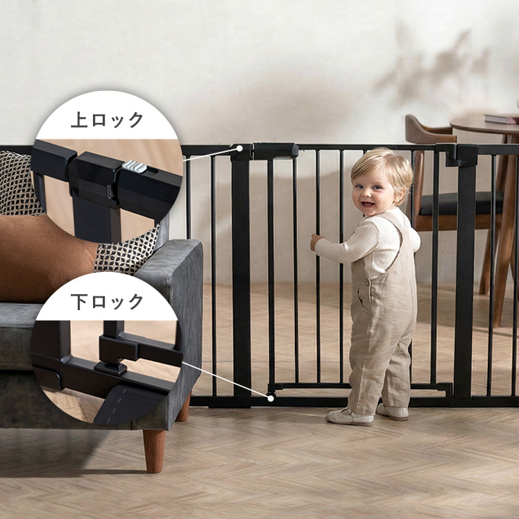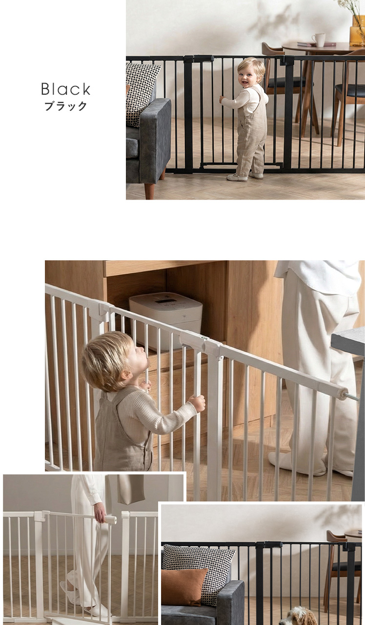 | 材質 | ベビーゲート本体/高密度炭素鋼、ABS樹脂、ポリカーボネート 拡張フレーム/高密度炭素鋼 段差スロープ、ウォールセーバー/ポリプロピレン |