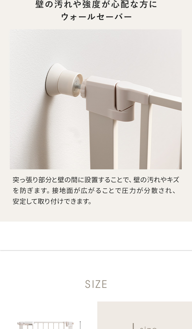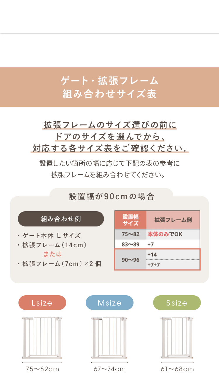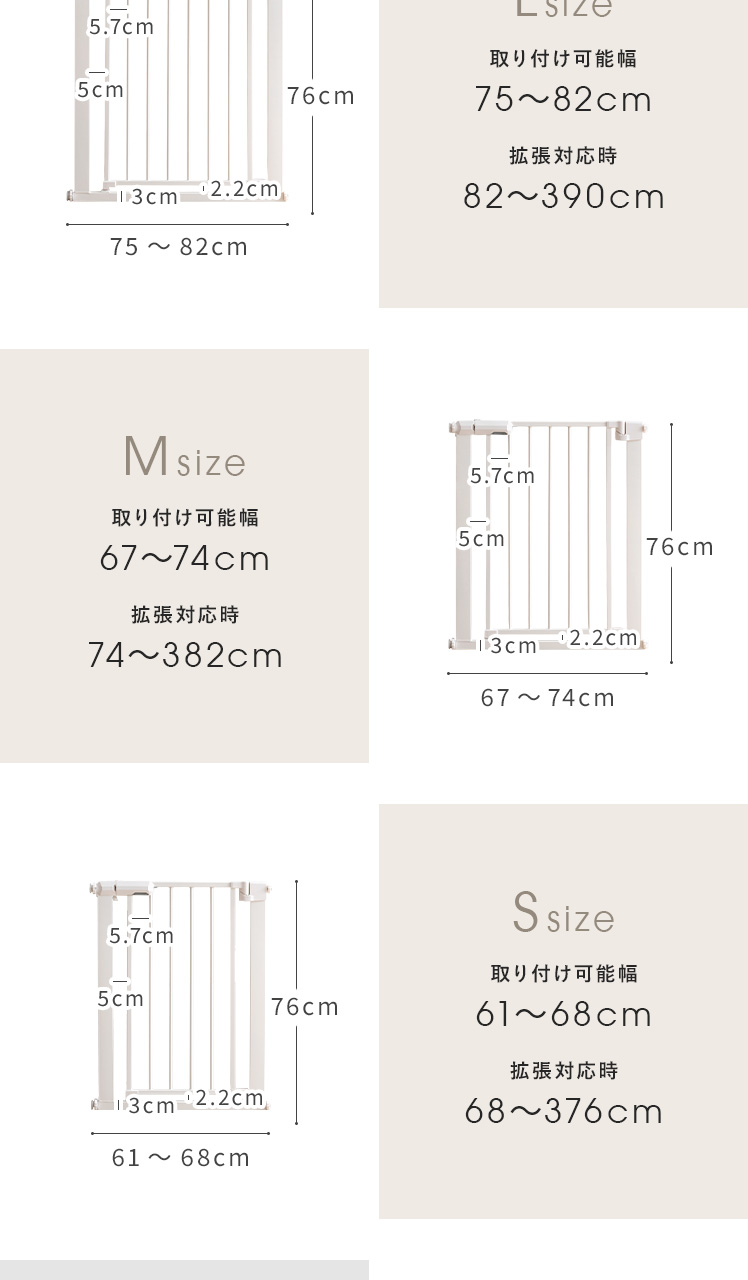 | ベビーゲート本体(サイズ) | S/約幅61〜68×高さ76cm M/約幅67〜74×高さ76cm L/約幅75〜82×高さ76cm |