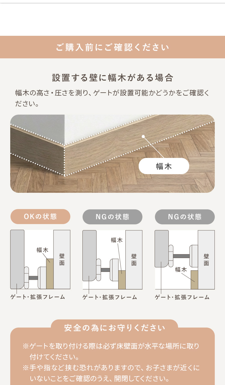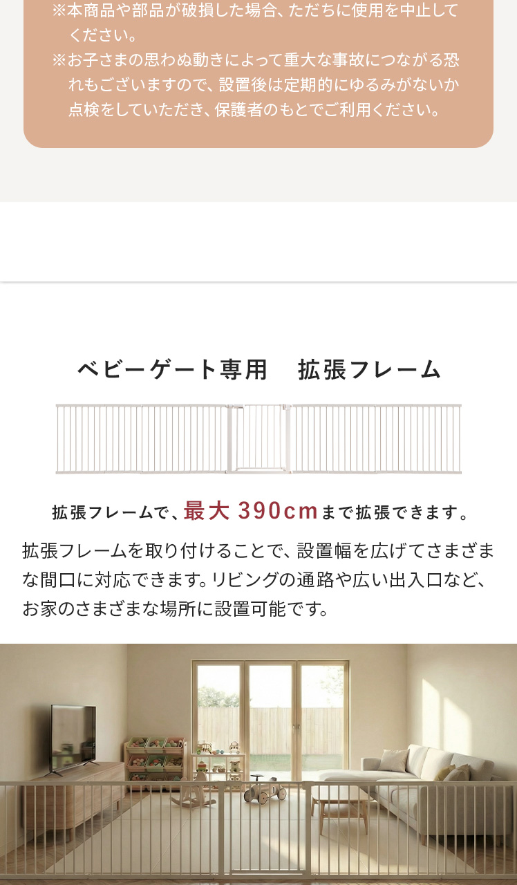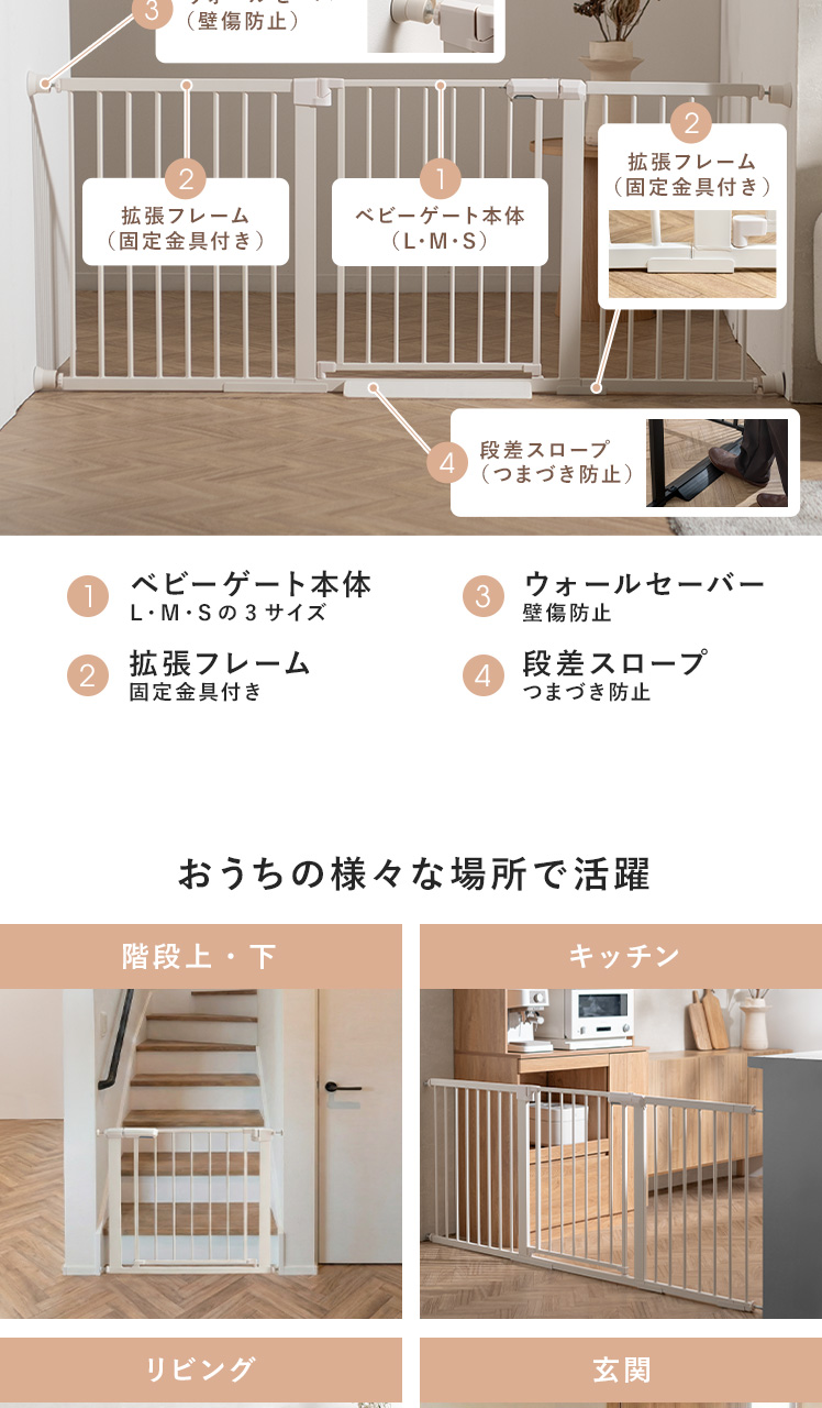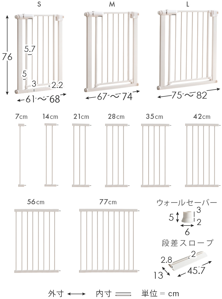 | ベビーゲート本体(サイズ) | S/約幅61〜68×高さ76cm M/約幅67〜74×高さ76cm L/約幅75〜82×高さ76cm |