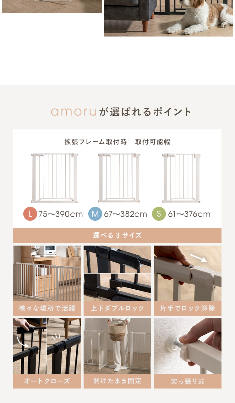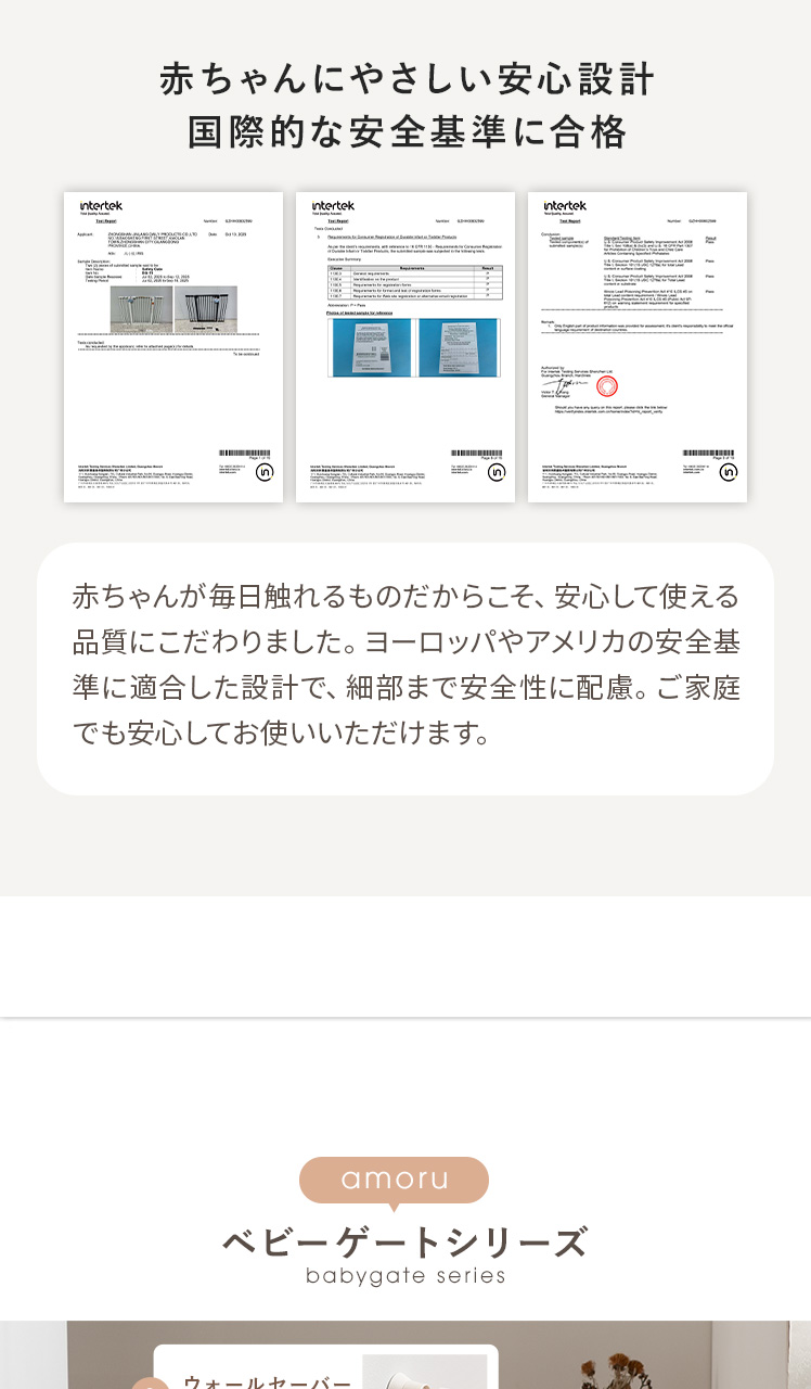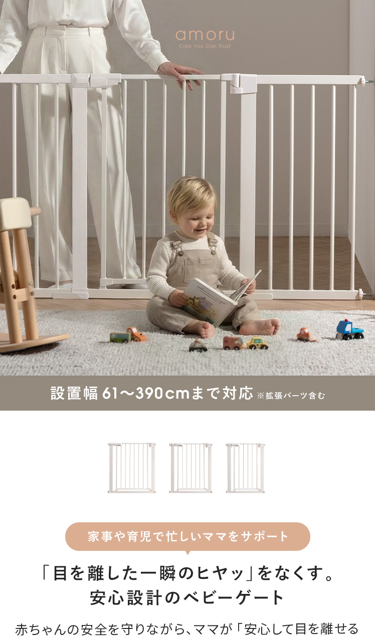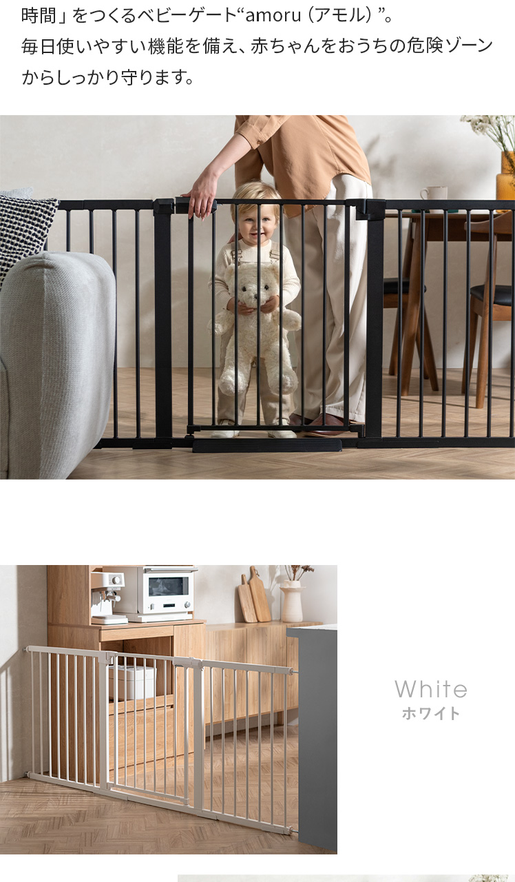 突っ張り式ベビーゲート amoru〔アモル〕/赤ちゃんの安全を守りながら、ママが「安心して目を離せる時間」をつくるベビーゲート“amoru(アモル)”。毎日使いやすい機能を備え、赤ちゃんをおうちの危険ゾーンからしっかり守ります。