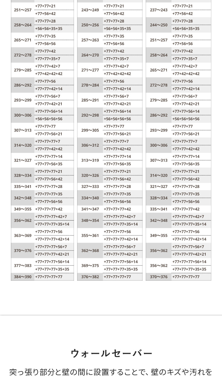 | 梱包サイズ | S/約幅60×奥行き81×高さ5cm(約4.3kg) M/約幅65.5×奥行き81×高さ5.5cm(約4.6kg) L/約幅73×奥行き81.5×高さ5cm(約4.9kg) 7cm/約幅78×奥行き14×高さ3cm(約0.5kg) 14cm/約幅78×奥行き18×高さ3cm(約0.8kg) 21cm/約幅78×奥行き25×高さ3cm(約1.1kg) 28cm/約幅78×奥行き32×高さ3cm(約1.3kg) 35cm/約幅78×奥行き40×高さ3cm(約1.7kg) 42cm/約幅78.5×奥行き47×高さ3cm(約1.9kg) 56cm/約幅60.5×奥行き77.5×高さ2.5cm(約2.5kg) 77cm/約幅79×奥行き81.5×高さ2cm(約3.1kg) 段差スロープ/約幅45.5×奥行き13×高さ4cm(約0.2kg) ウォールセーバー/約幅15.5×奥行き12×高さ6cm(約0.2kg) |