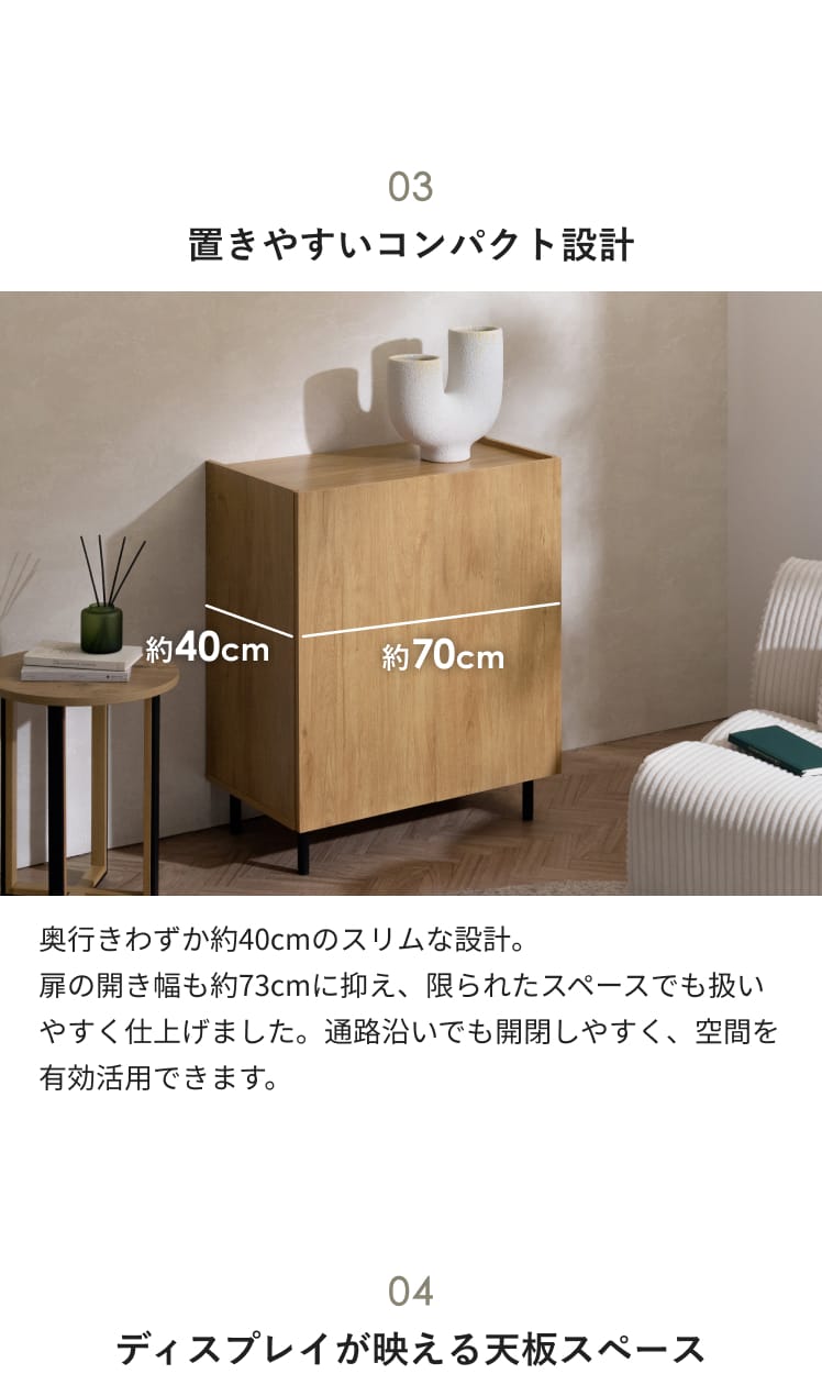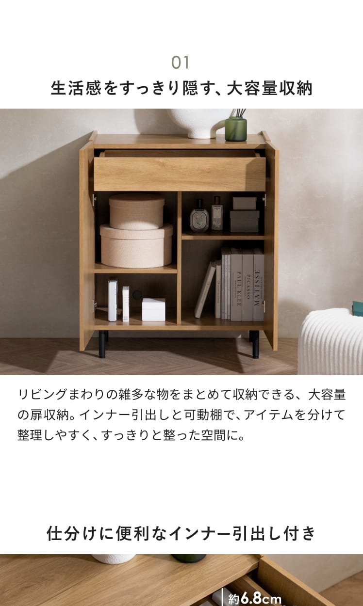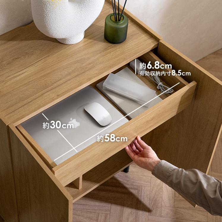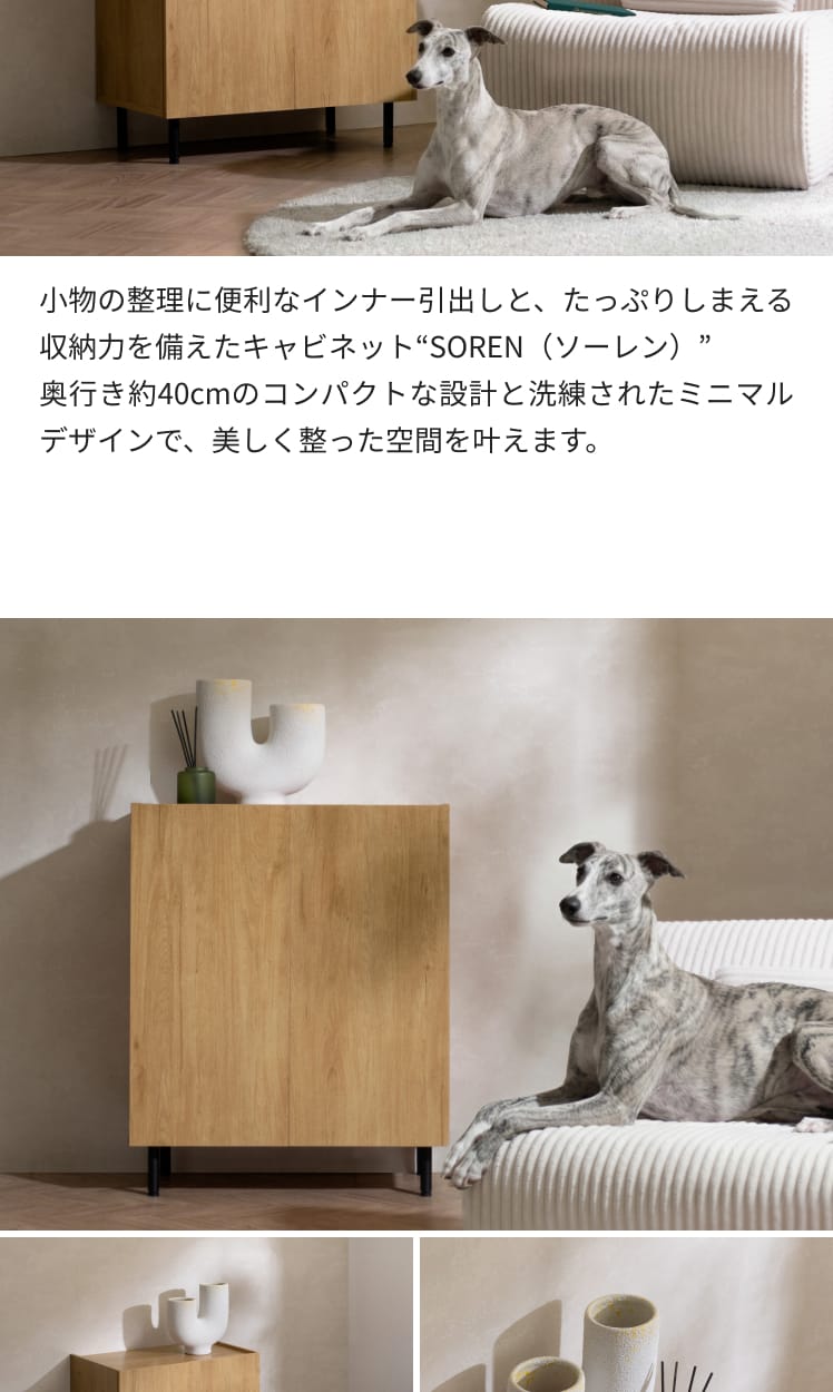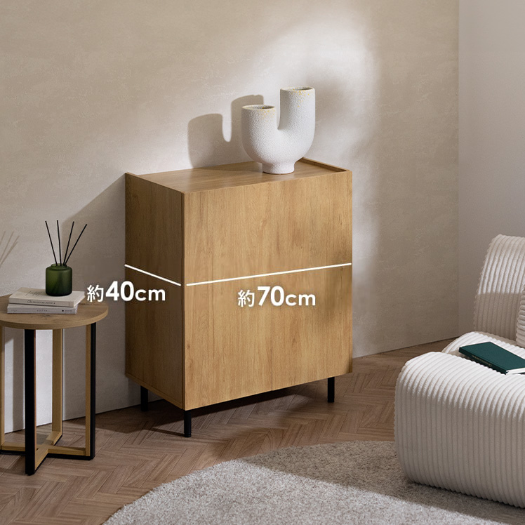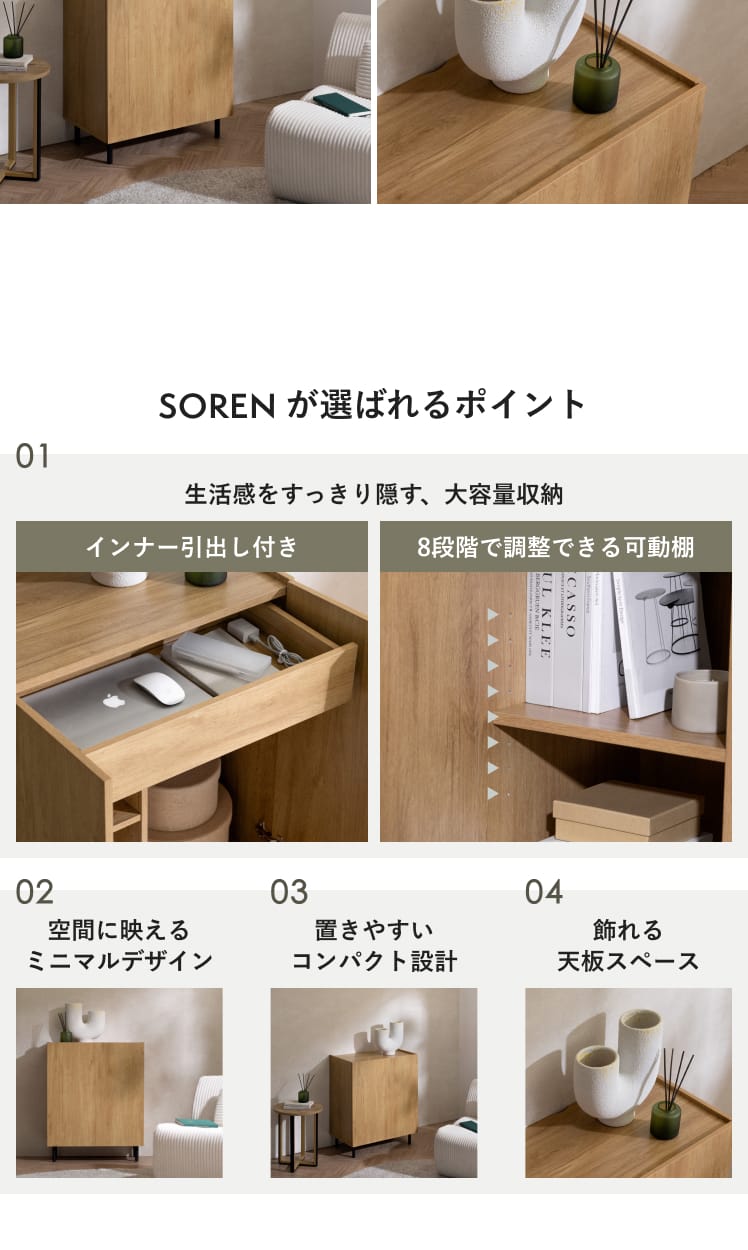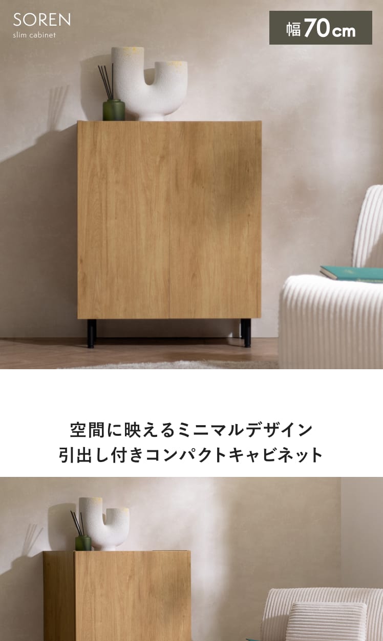 引き出し付きコンパクトキャビネット SOREN〔ソーレン〕 幅70cm/小物の整理に便利なインナー引出しと、たっぷりしまえる収納力を備えたキャビネット“SOREN(ソーレン)”。奥行き約40cmのコンパクトな設計と洗練されたミニマルデザインで、美しく整った空間を叶えます。