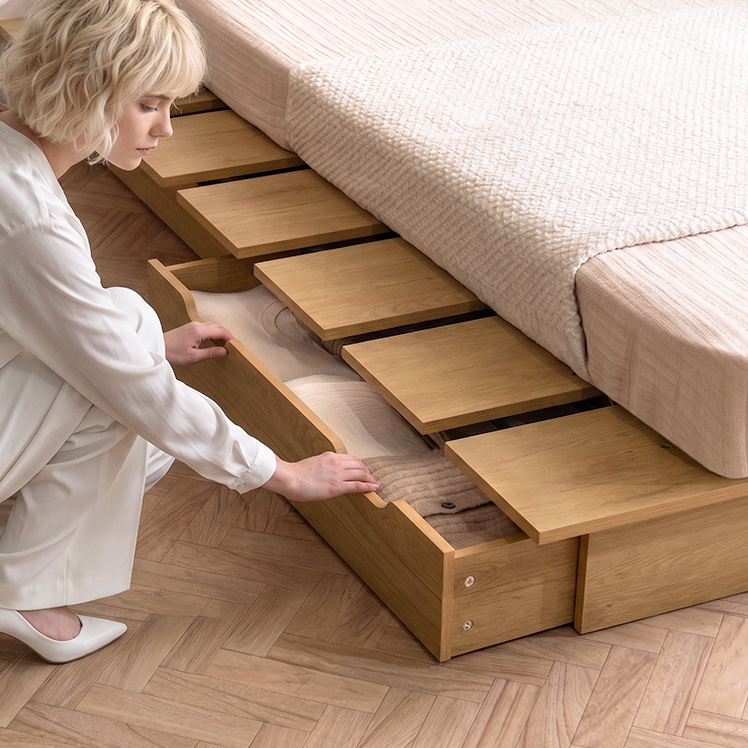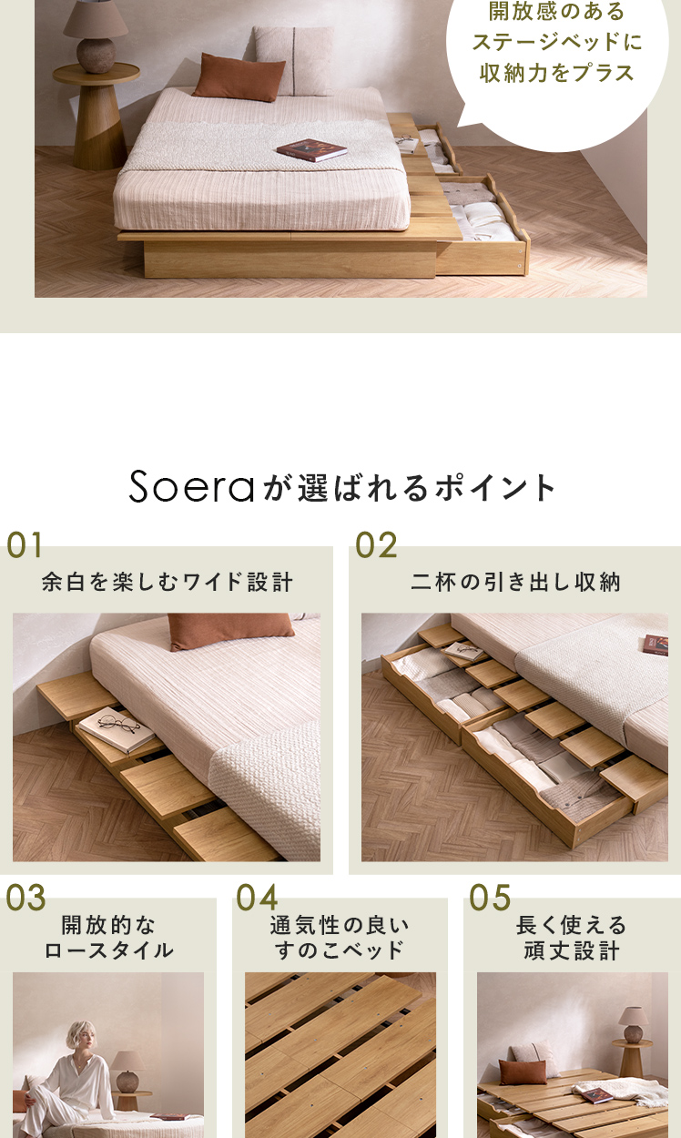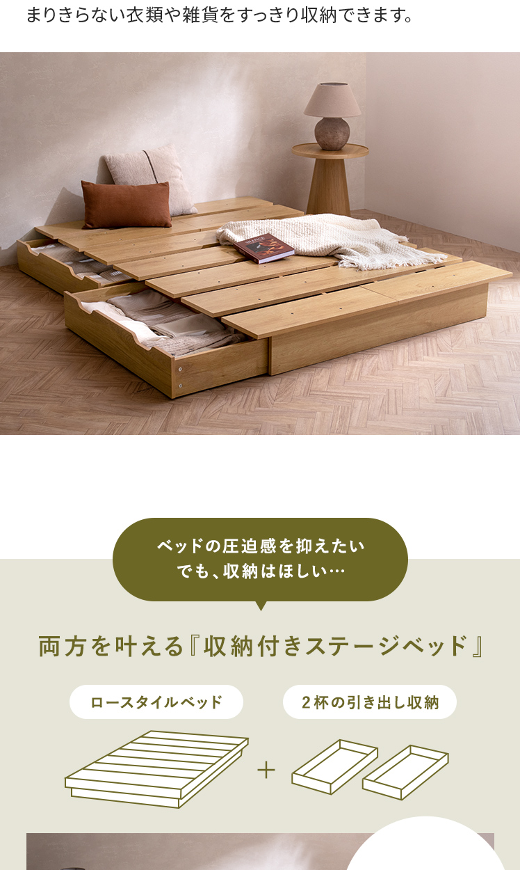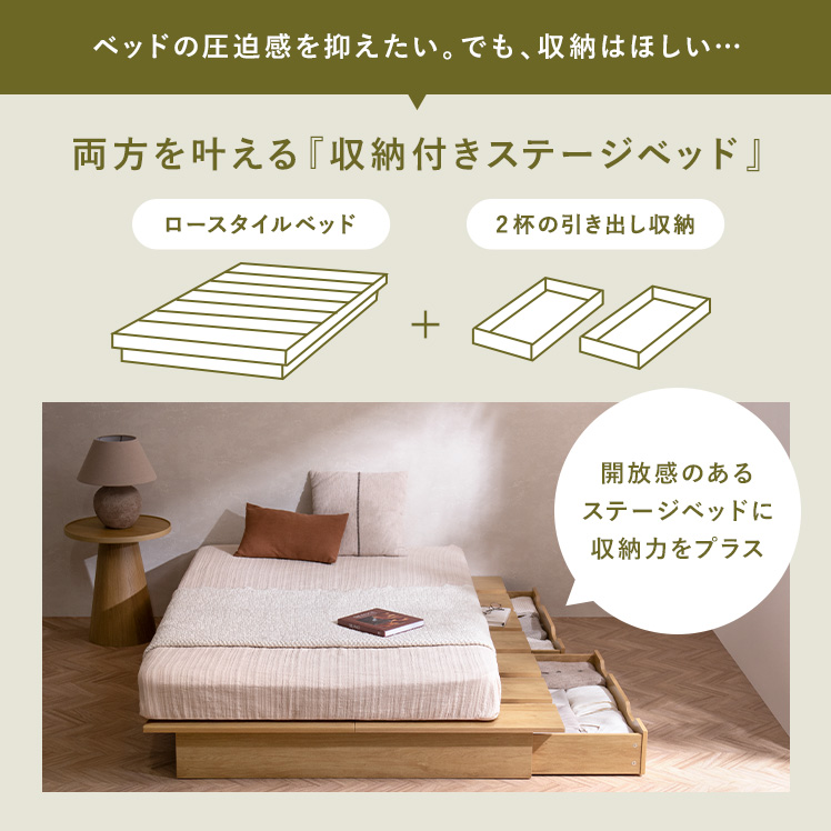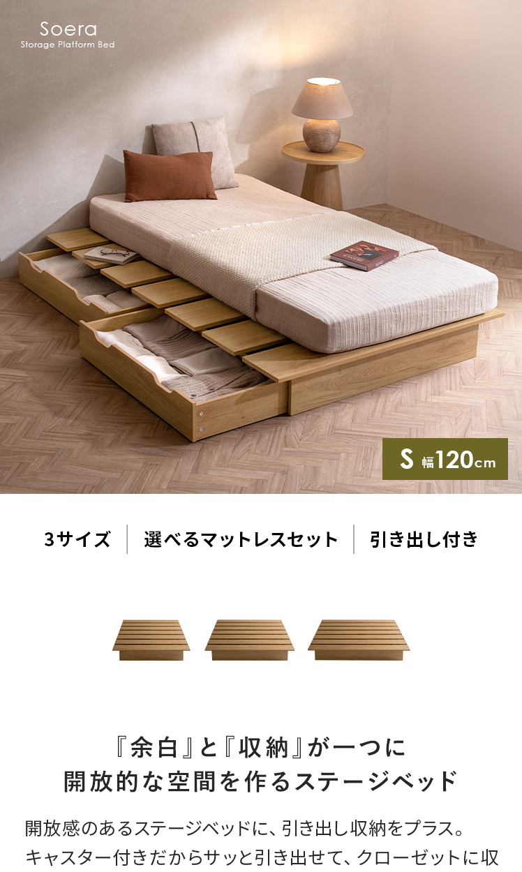 収納付きステージベッド Soera〔ソエラ〕 シングルサイズ/開放感のあるステージベッドに、引き出し収納をプラス。キャスター付きだからサッと引き出せて、クローゼットに収まりきらない衣類や雑貨をすっきり収納できます。