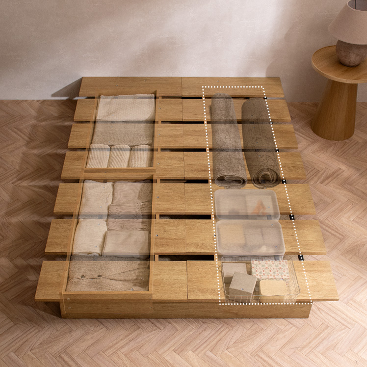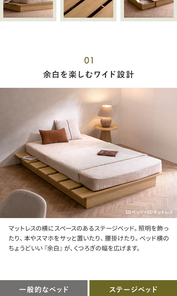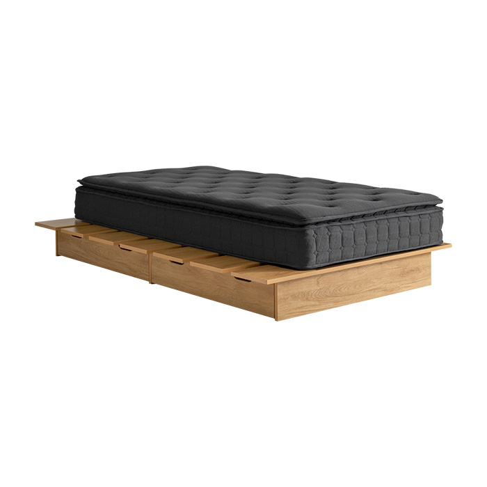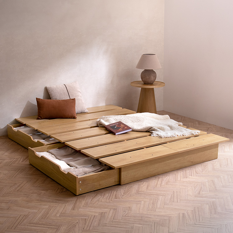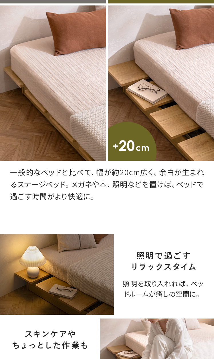 収納付きステージベッド Soera〔ソエラ〕 シングルサイズ/開放感のあるステージベッドに、引き出し収納をプラス。キャスター付きだからサッと引き出せて、クローゼットに収まりきらない衣類や雑貨をすっきり収納できます。