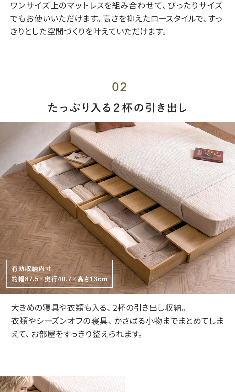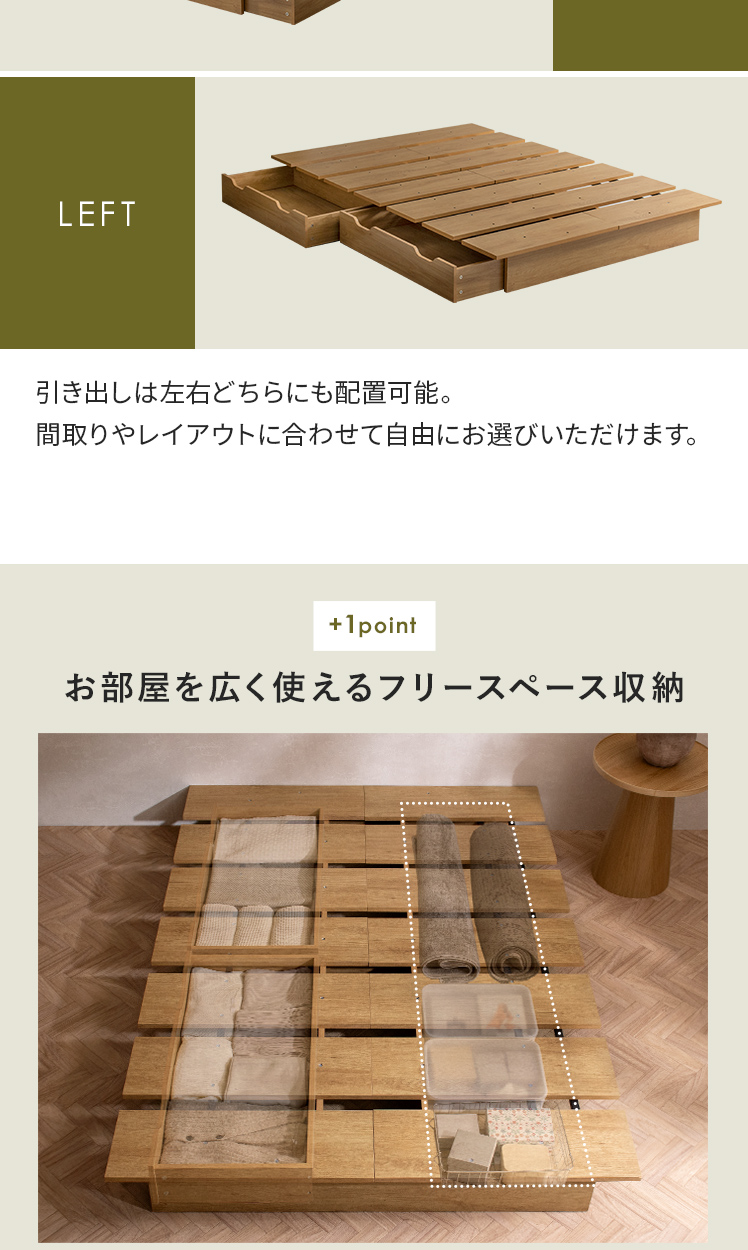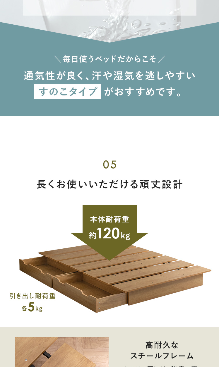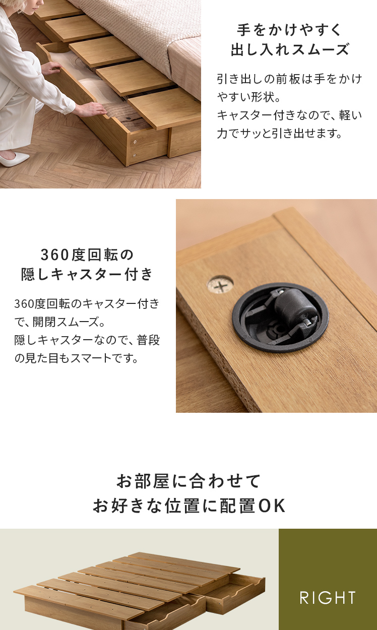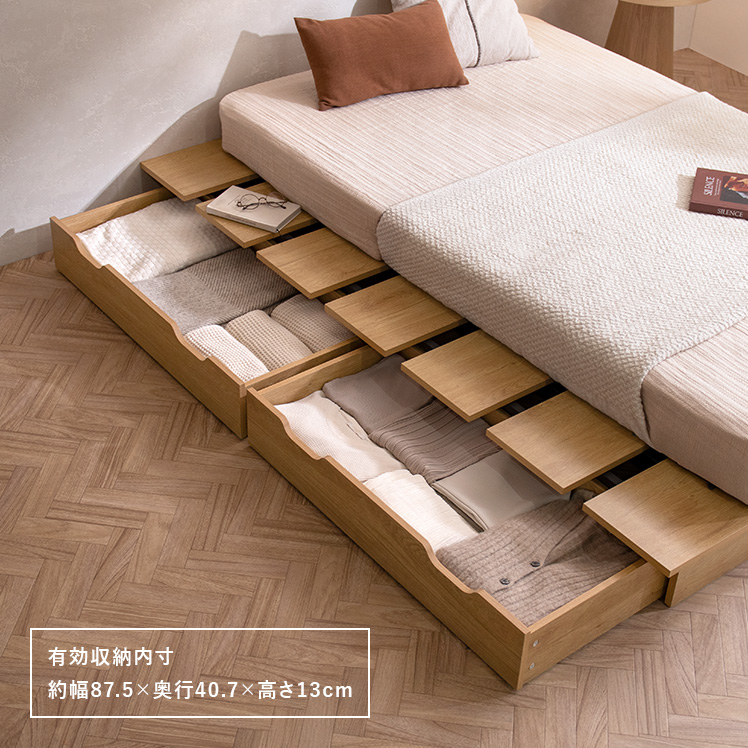 | 耐荷重(ベッドフレーム) | 底板/120kg、引き出し/各5kg |